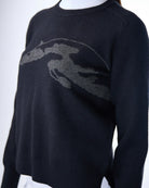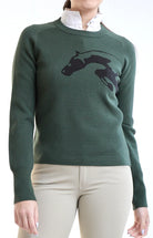 Our cozy yarn is the ideal weight to wear all year, for all seasons. The perfect combination of soft Viscose, Nylon, and Poly yarns make this crew neck sweater a luxurious, yet practical, addition to any wardrobe. The horse intarsia has a slight metallic shine twisted through the matte yarn.