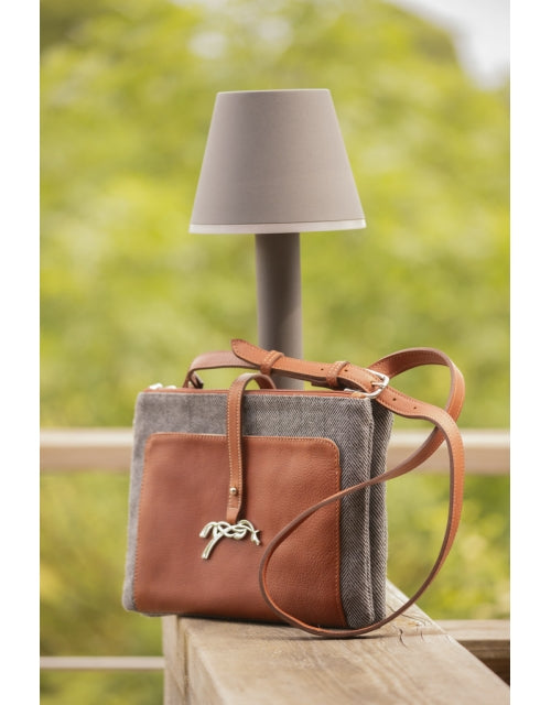 The Pablito bag, large model, features an adjustable shoulder strap for over-the-shoulder wear. A fine leather strap, enhanced with the silver Pénélope logo, secures two zipped compartments. It also includes an open exterior pocket. Original with its bi-material design, the bag is crafted from beautiful cognac leather combined with a lovely chevron fabric.