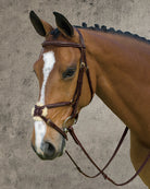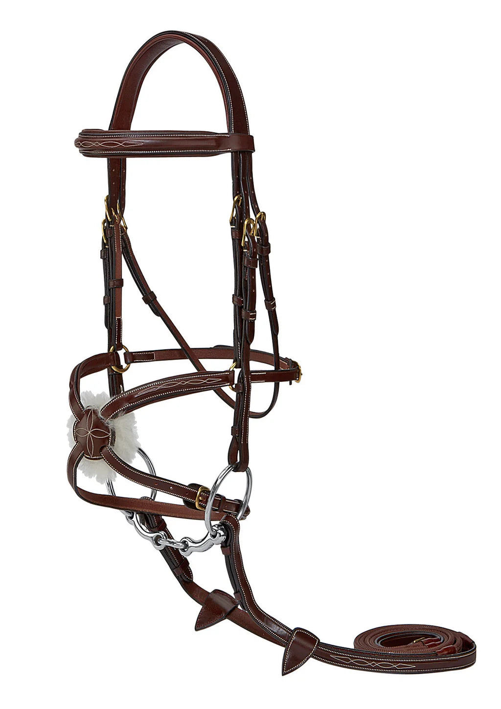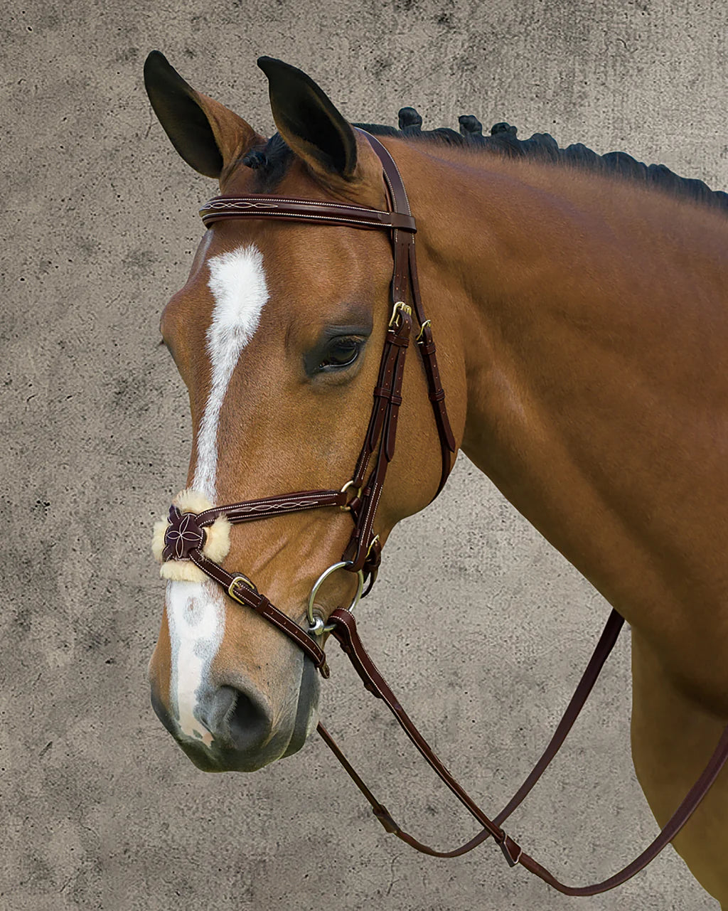 The Dy'on® Figure-8 Bridle features a traditional ring style, a raised, fancy-stitched figure-8 noseband with sheepskin center and Dy'on's padded anatomic crownpiece for the comfort of the horse. The noseband attaches to the crownpiece on both sides, so once it's adjusted, it's less likely to shift—especially important for a figure-8 noseband.