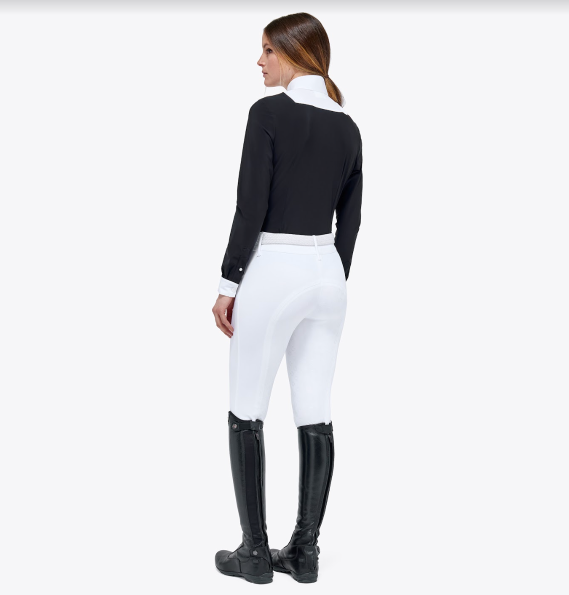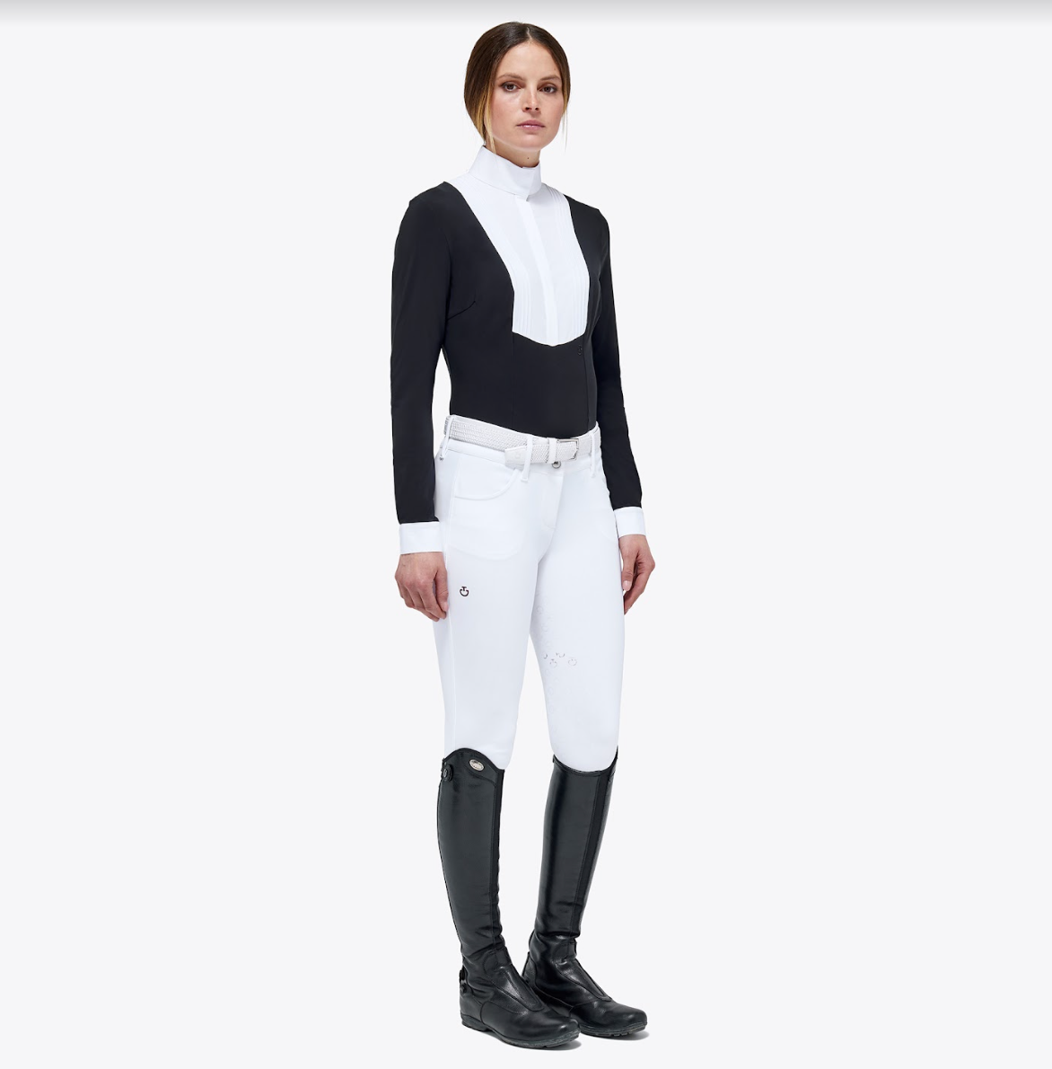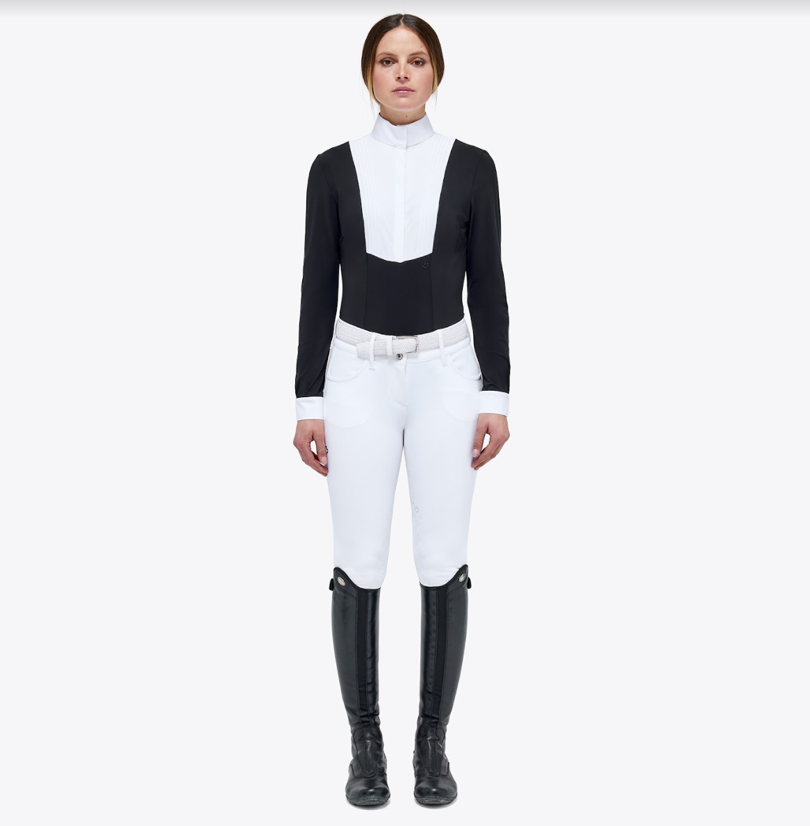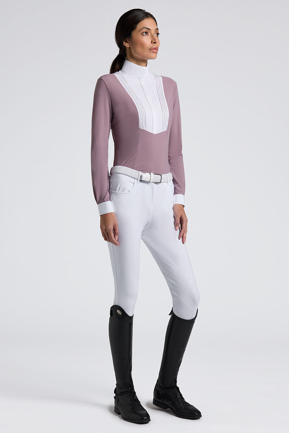 Ladies American Long Sleeve Show Shirt - this classic look competition shirt is ideal for any discipline, but the higher collar makes it perfect for the hunter ring. The elegant front detailing adds a subtle touch of class to the shirt, whilst the high quality Italian fabric ensures ultimate comfort, a perfect fit and high performance.