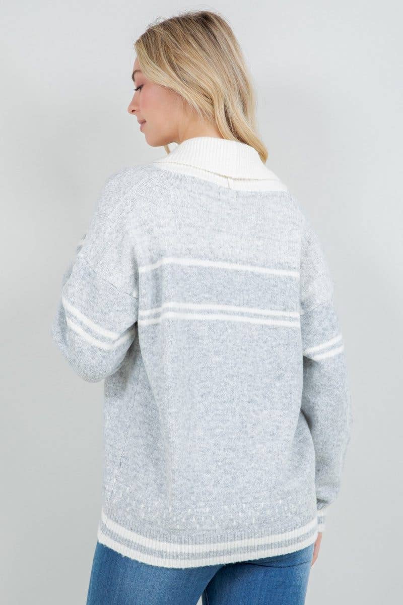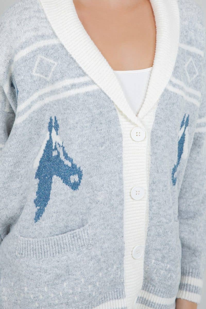 Cozy up in this playful knit cardigan featuring bold horse head patterns on each side. Designed with a shawl collar, contrast trim, and button front closure. Model is wearing size S/M Height: 5' 10" Measurements: 34-24-38