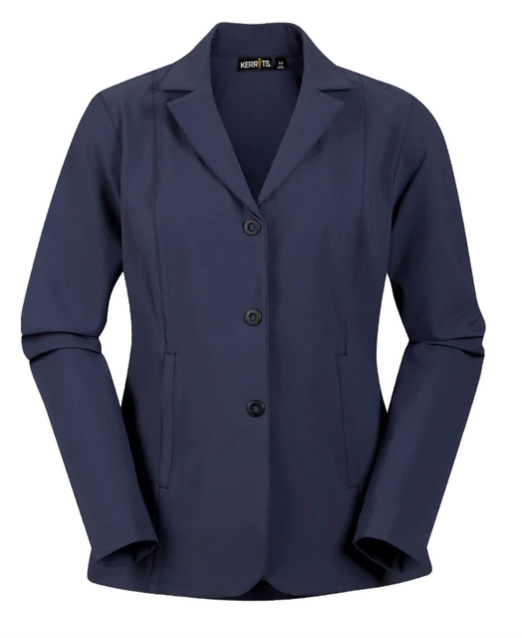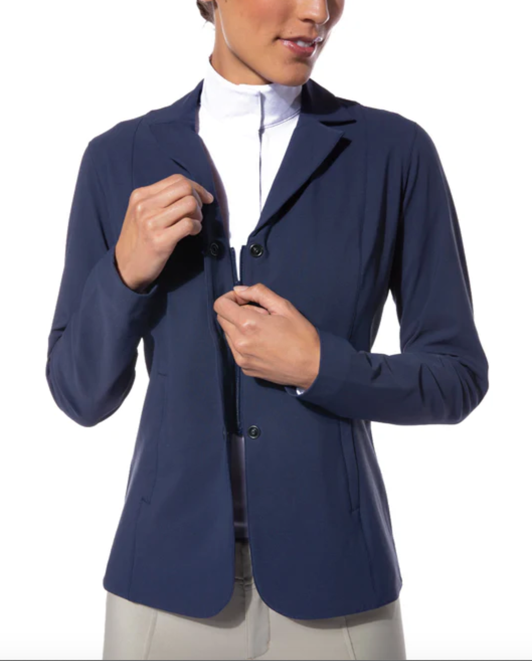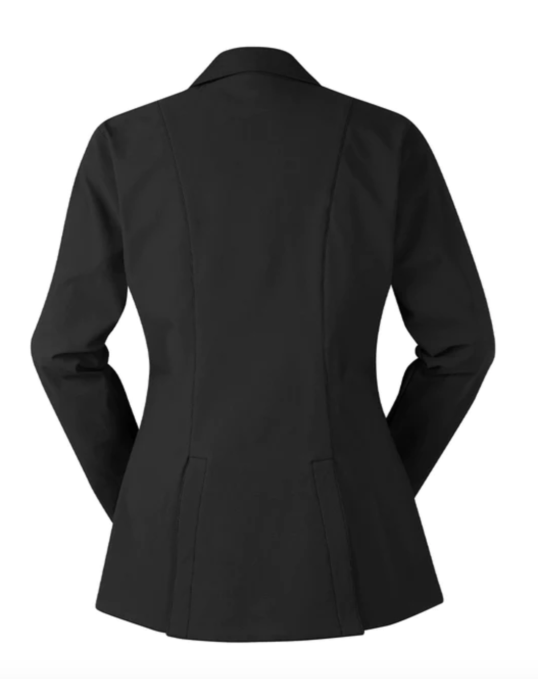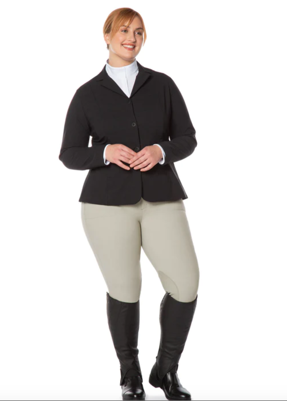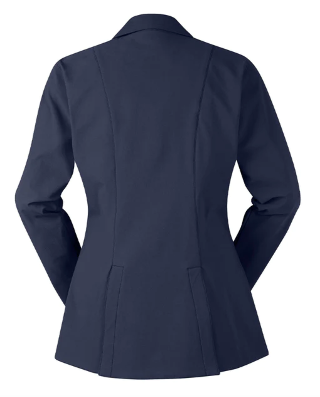 This all-season show coat may be the easiest thing about competing. Simply pull on an elegant, stain and weather-resistant silhouette that breathes and stretches in the saddle, then toss it in the wash for next time. No ironing. No worries. Strategic, contoured design flatters a range of body types. Hidden front zip with snaps stays smooth for a streamlined silhouette. Eyelets at waist secure riders’ number strings. Choose from 3 or 4-snap options.