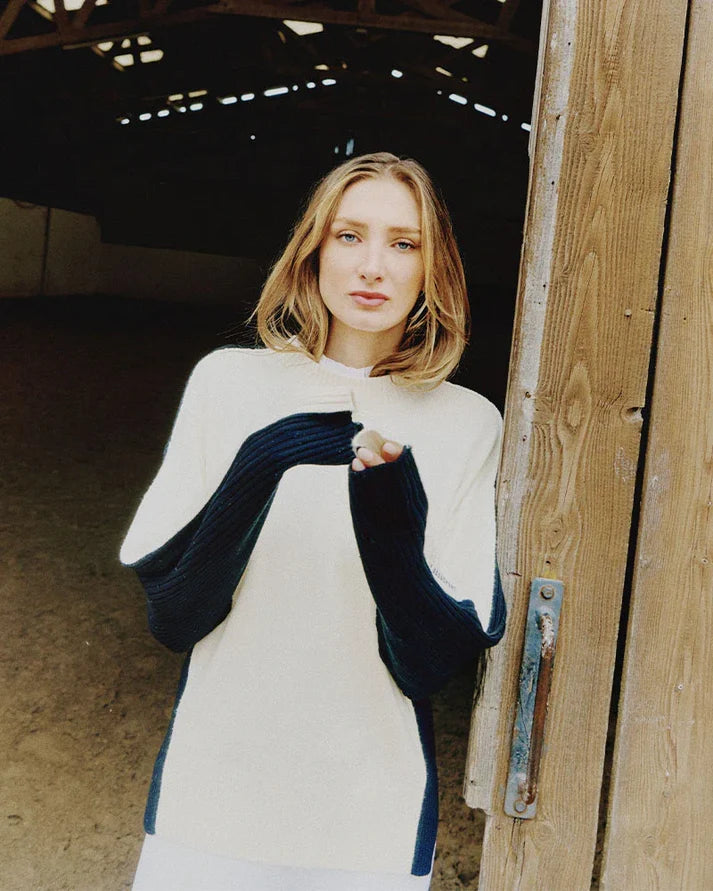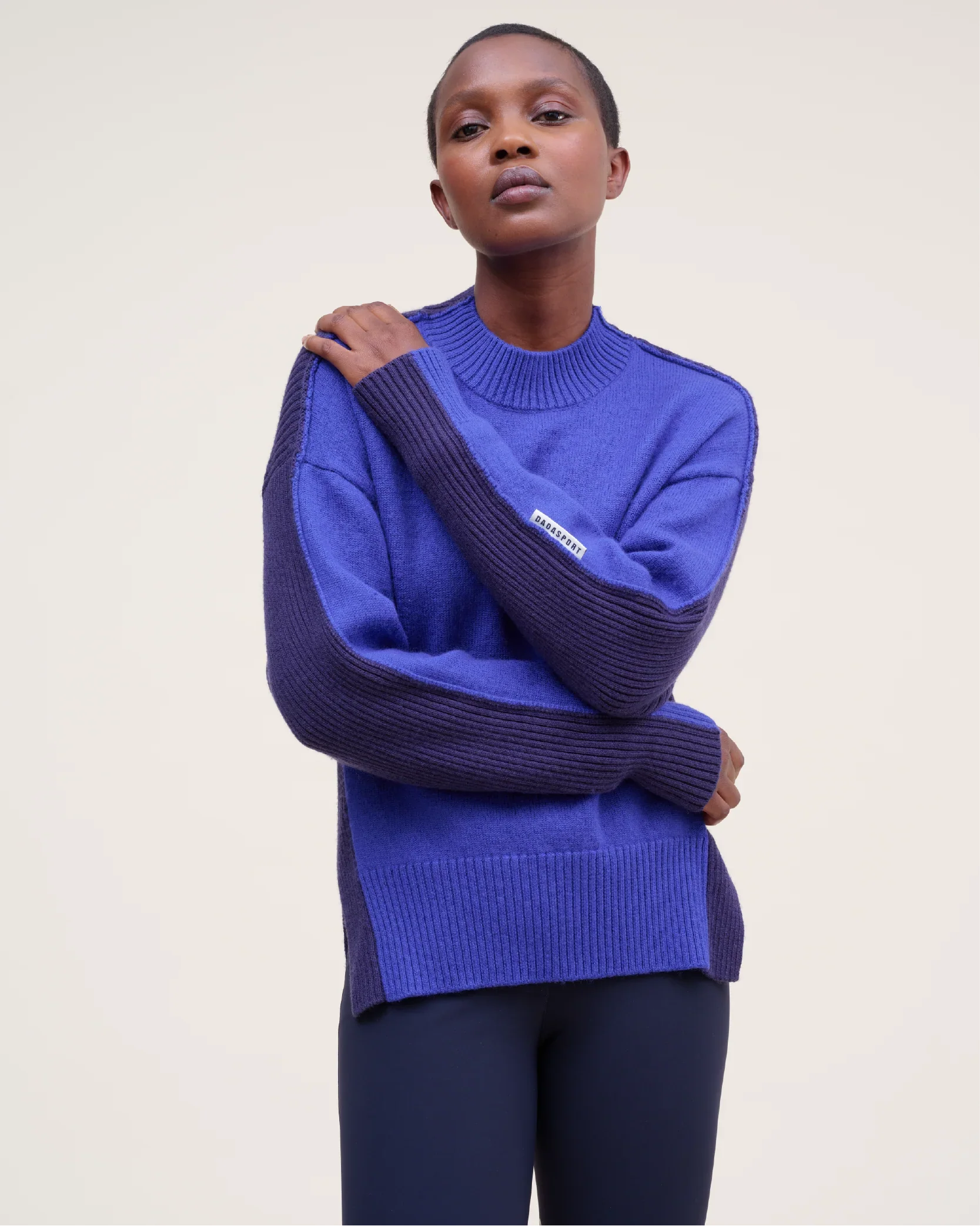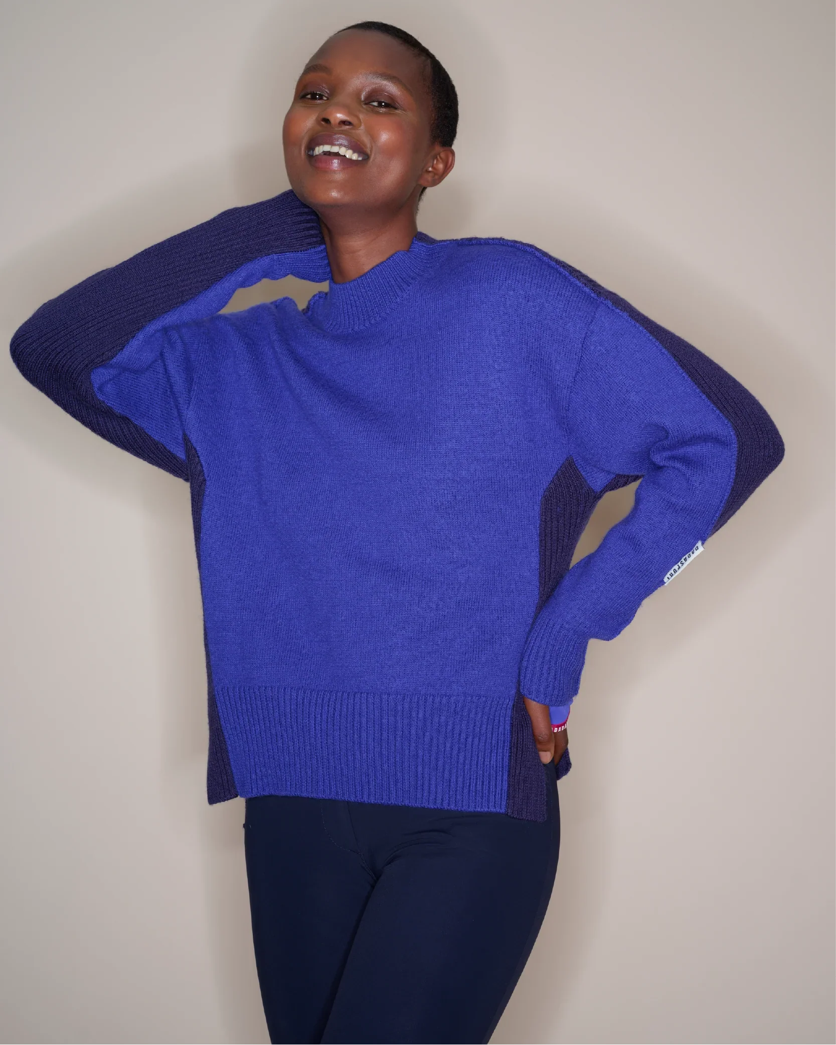 Highlighting the unique design, an assembly seam runs along the outside, beautifully demarcating the two parts. The bottom of the sweater is finished in ribbing with decorative side slits for added flair.
