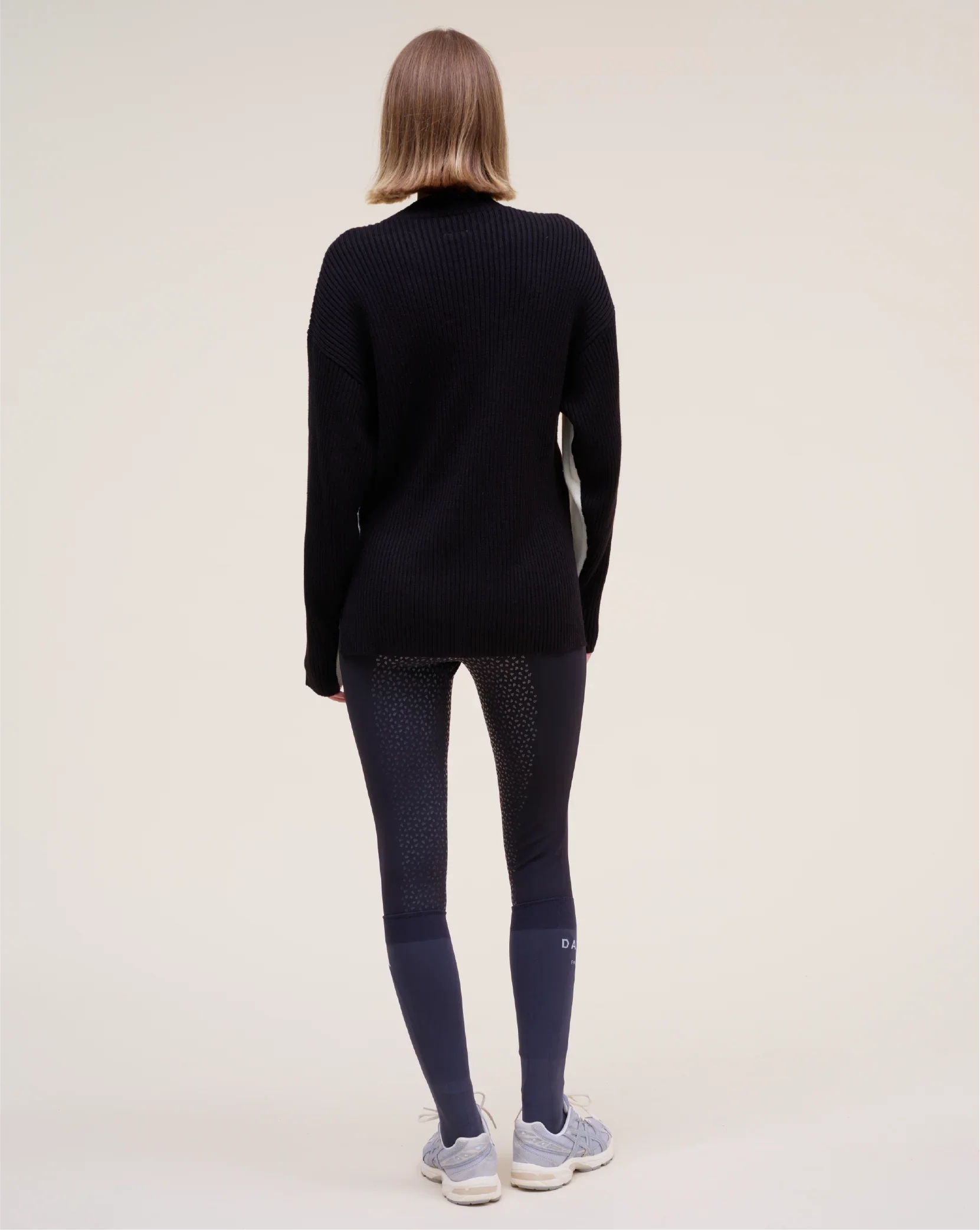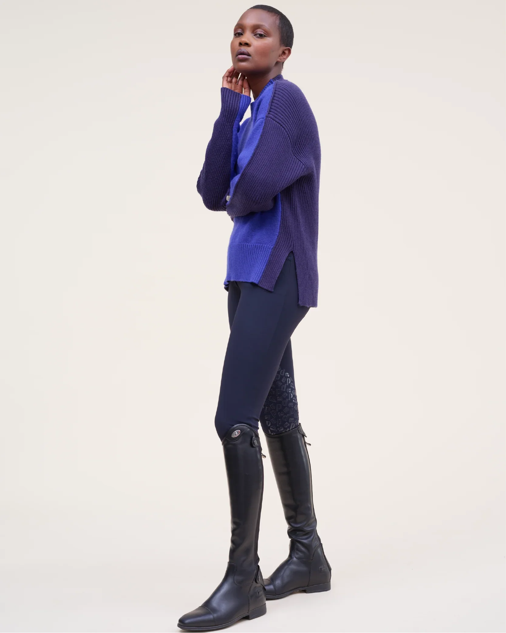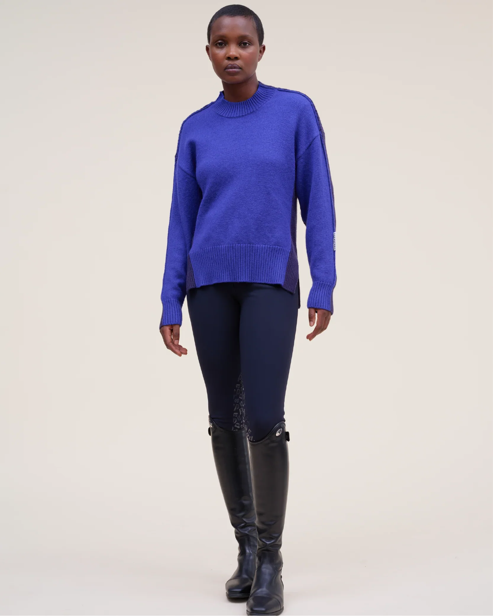Highlighting the unique design, an assembly seam runs along the outside, beautifully demarcating the two parts. The bottom of the sweater is finished in ribbing with decorative side slits for added flair.