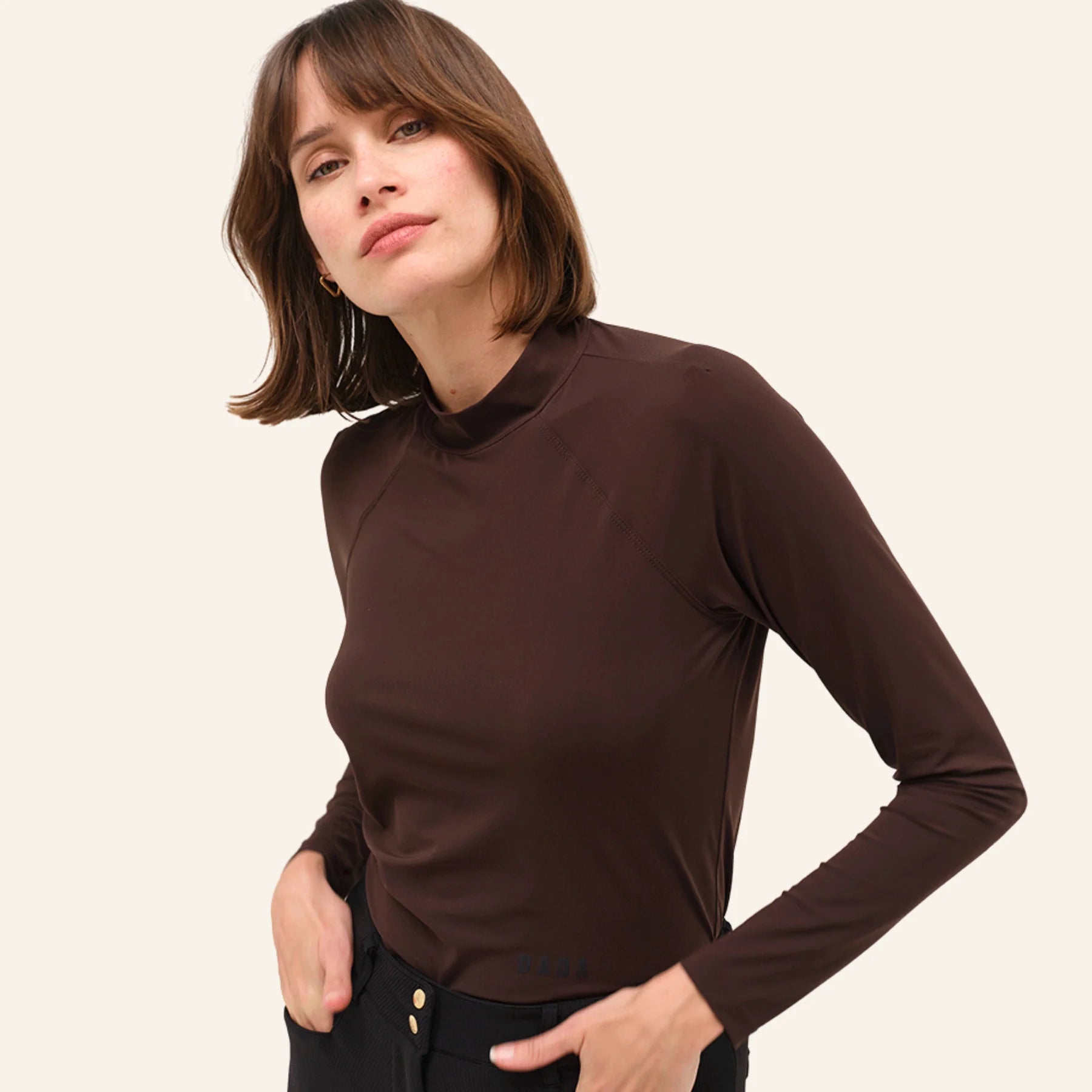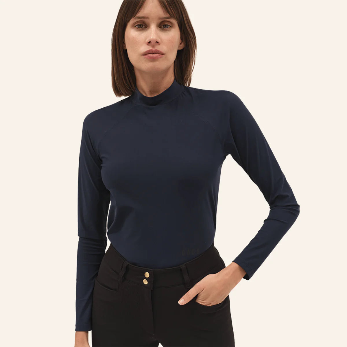 Technical light long-sleeved T-shirt, designed for riders looking for comfort and performance. With its ultra-breathable, lightweight and UV-protective Italian fabric, it offers a fitted cut and a high collar ideal for riding. Available in coffee, black and navy, this model combines elegance and practicality thanks to its easy care.