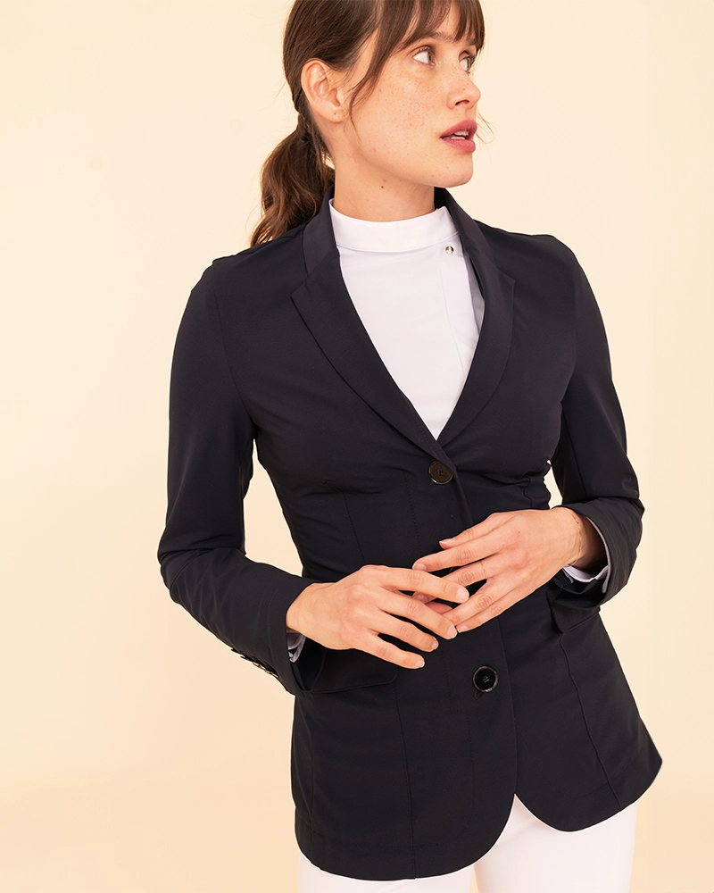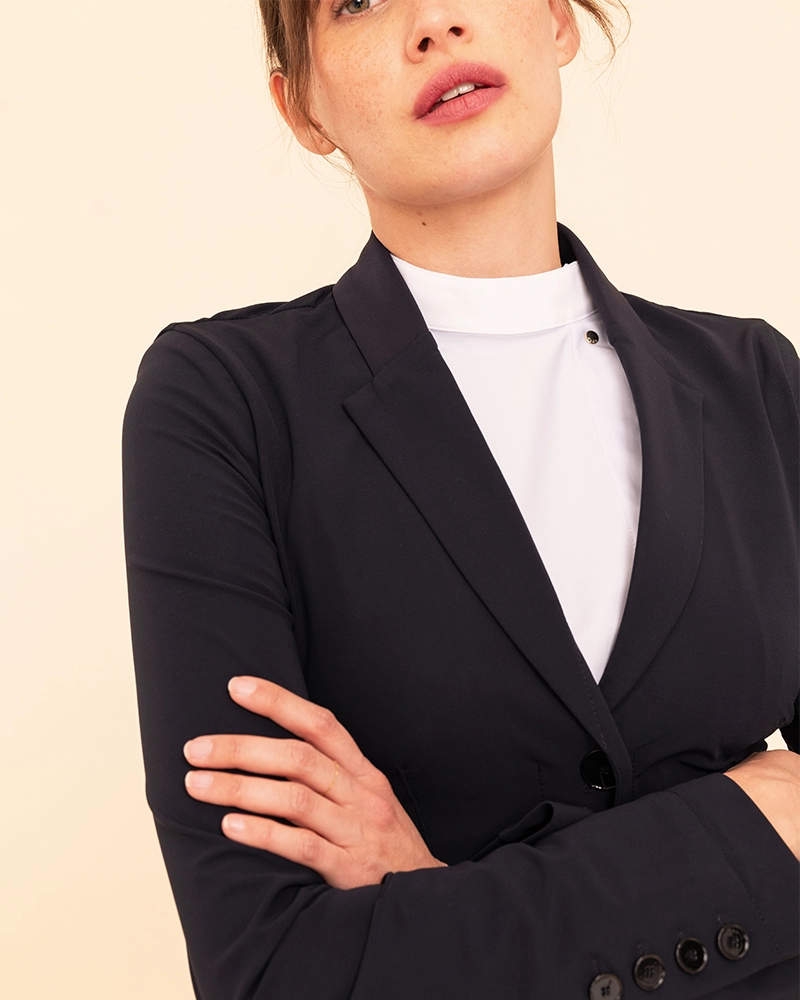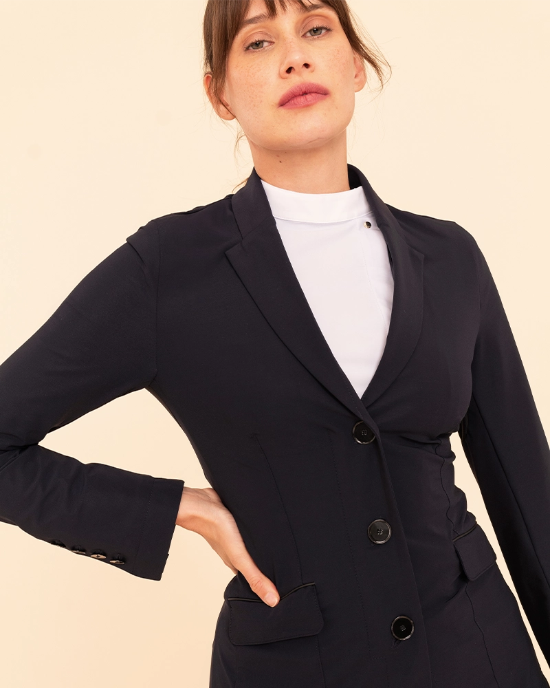 Traviata is the new jacket added to the family of competition jackets. Still in the tailoring spirit, it is intended to be longer than the other jackets. Its cut and style make it discreet, chic and elegant. Made entirely from a very technical lightweight fabric (the same fabric used as the Cadence competition jacket), its cut outlines and slims the silhouette. Hunter riders could well benefit from it. Its princess cutout on the front and back, the 3 black buttons on the front and the 4 buttons on each cuff as well as 2 false pockets with single-piped flaps add structure to the piece. In addition to being very light, it is also very breathable thanks to its mesh inserts under the arms.
