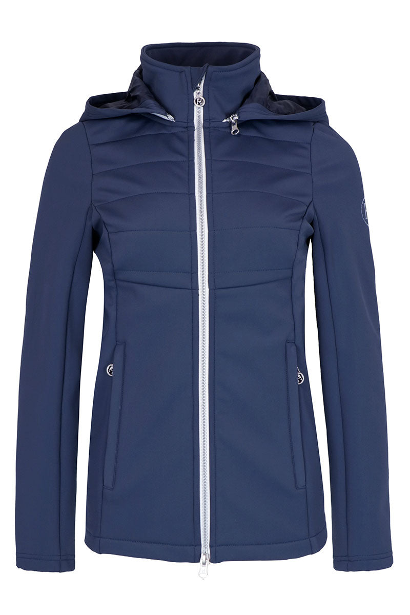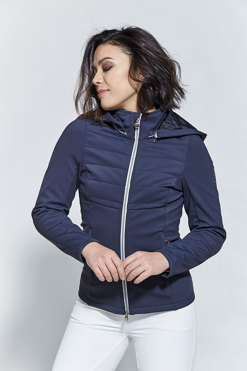 It has a feminine cut. Its silver-colored details and beaded logo make it really stylish. With its double zip, it can be worn for horse riding or in town.