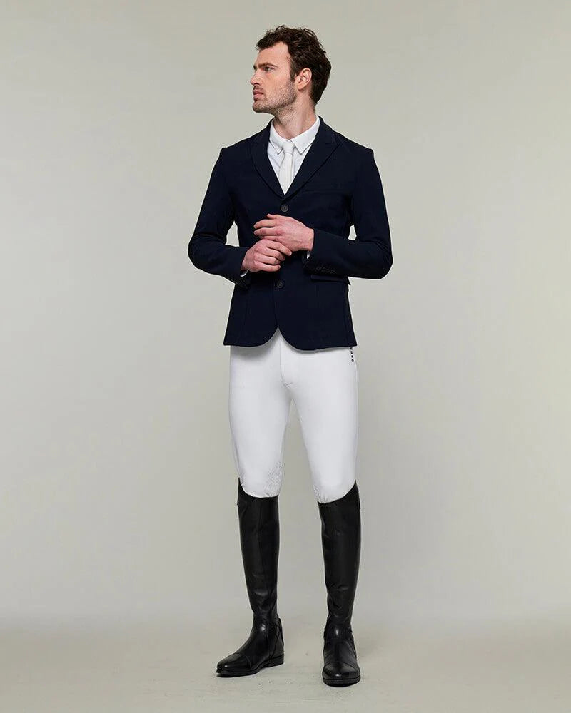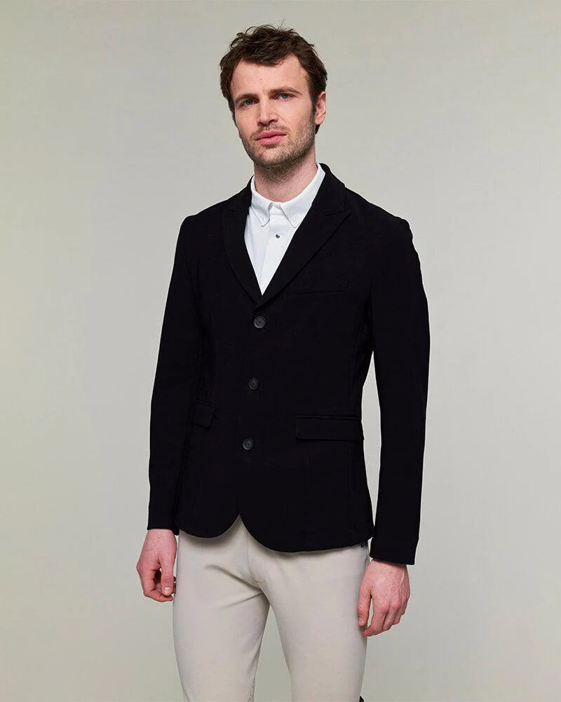 Description : This men's competition jacket has been designed in a suit jacket spirit with a refined and timeless design. Its bi-stretch fabric allows it to perfectly follow the rider's movements. It is compatible with our Concorde airbag as well as the Helite Zip'in 2 airbag. The color palette Clooney comes in black and navy. Design The Clooney competition jacket was designed like a suit jacket. It is identified by its notched collar and its black zip closure subtly hidden by three buttons made of horn and engraved with the Dada Sport signature. Two fake piped side pockets with flap, a fake piped handkerchief pocket with flap as well as its 3 buttons on each cuff complete the jacket. It is also very breathable thanks to its 2 vents on the back and its mesh inserts under the arms. It has 2 slits at the back for maximum movement. Manufacturing This Italian fabric is called “Sensitive”, very thin and breathable, it provides optimal comfort and great freedom of movement. The fabric is made of polyamide microfiber and Lycra (elastane), which ensures good elasticity (bi-stretch). The elastane fabric is made from sustainable recycled fibers. The choice of buttons is also part of our requirements regarding the quality and the high level of finishing of our pieces. Our buttons are made of wear-resistant horn. Size and maintenance advice We recommend that you choose one size larger than your usual size. How to maintain your Clooney competition jacket? It has been designed to be easy to maintain, dry quickly, not pilling and not to crease. We recommend machine washing closed inside out at 30°C maximum with a spin speed of no more than 900 rpm. It is then best to let the competition jacket dry on a hanger in the open air. Especially no tumble dryer. You can then iron it at low temperature.