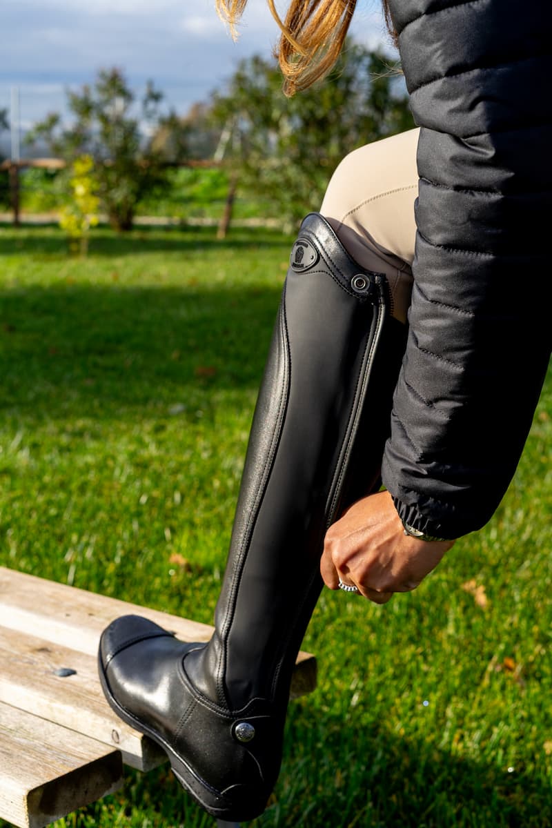 Loreto is a standard jumping boot, made of soft calfskin and a special rubber stretch textile that allows an excellent fit to different types of leg, ensuring up to 2 cm of elasticity.