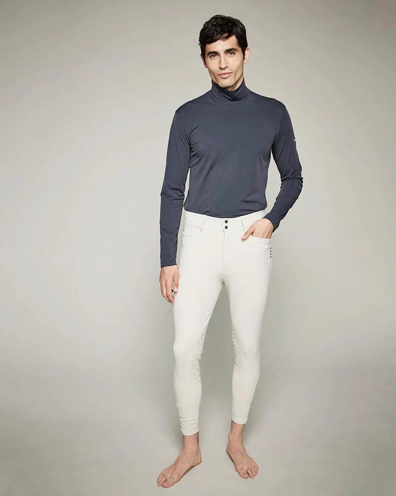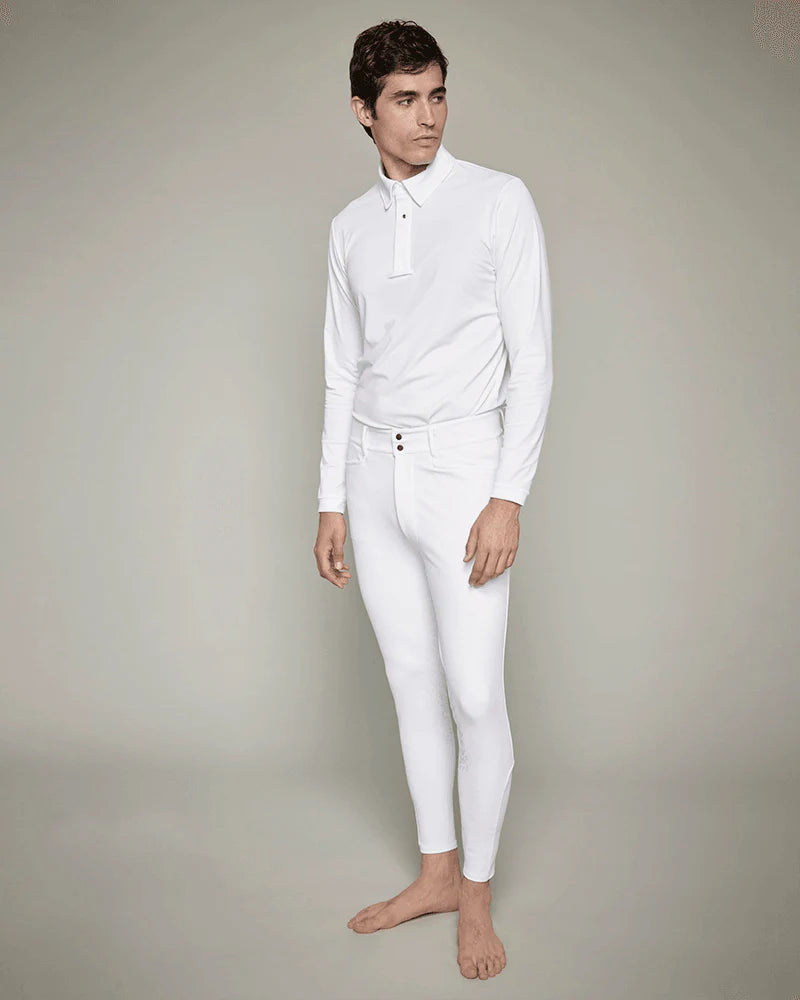 Description : Men's riding breeches offering maximum freedom of movement Riding pants play the leading role in the rider's wardrobe. Very comfortable and stretchy, it follows him in his daily life. The color palette Capitol is available in white, beige and navy Design These men's riding pants were designed with Dada Sport know-how. It has been designed to offer great freedom of movement and optimal comfort. Great attention has been paid to details: it has been made with a minimum of seams to limit friction points with the saddle and stirrup leathers, it has transparent grip patches formed with the Dada logo on the inside of the knees to increase the stability in the saddle, the bottom of the pants is made of Lycra for a perfect fit on the ankle and an elastic band is inserted at the waist for perfect support. Also note that the belt, in one piece, is made of bi-stretch fabric so as not to compress and mark the waist. To complete the pants, two slant pockets are placed on the front and two false rear flap pockets with a horn effect button finalize the silhouette. A transfer with the DADA logo is applied to the left front as a signature. The pants close with two gunmetal clasps bearing the DADA logo. Manufacturing Italian fabric - Made in Portugal Italian fabric "Sensitive" is a high-tech microfiber made from synthetic fibers. It is characterized by its bi-stretch properties, which means that it is stretchable in both directions, thus offering great freedom of movement and optimal comfort. It's also water-repellent, which means it can withstand splashes. This can be especially useful for riders who ride in light rain or very early in the morning dew. Finally, this fabric is wrinkle-resistant, therefore very easy to maintain, an advantage for this riding garment that is worn every day. Size and maintenance advice We recommend taking your usual size. If you have any doubts, you can also ask us for advice by contacting us directly on the chat. How to take care of your riding pants? It was designed to be easy to maintain. We recommend machine washing inside out at 30°C maximum with a spin speed of no more than 900 rpm. The best is then to let the pants dry on a hanger in the open air and iron them at low temperature. Definitely no tumble drying or dry cleaning.