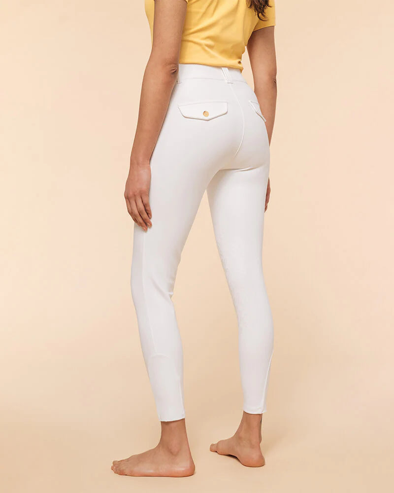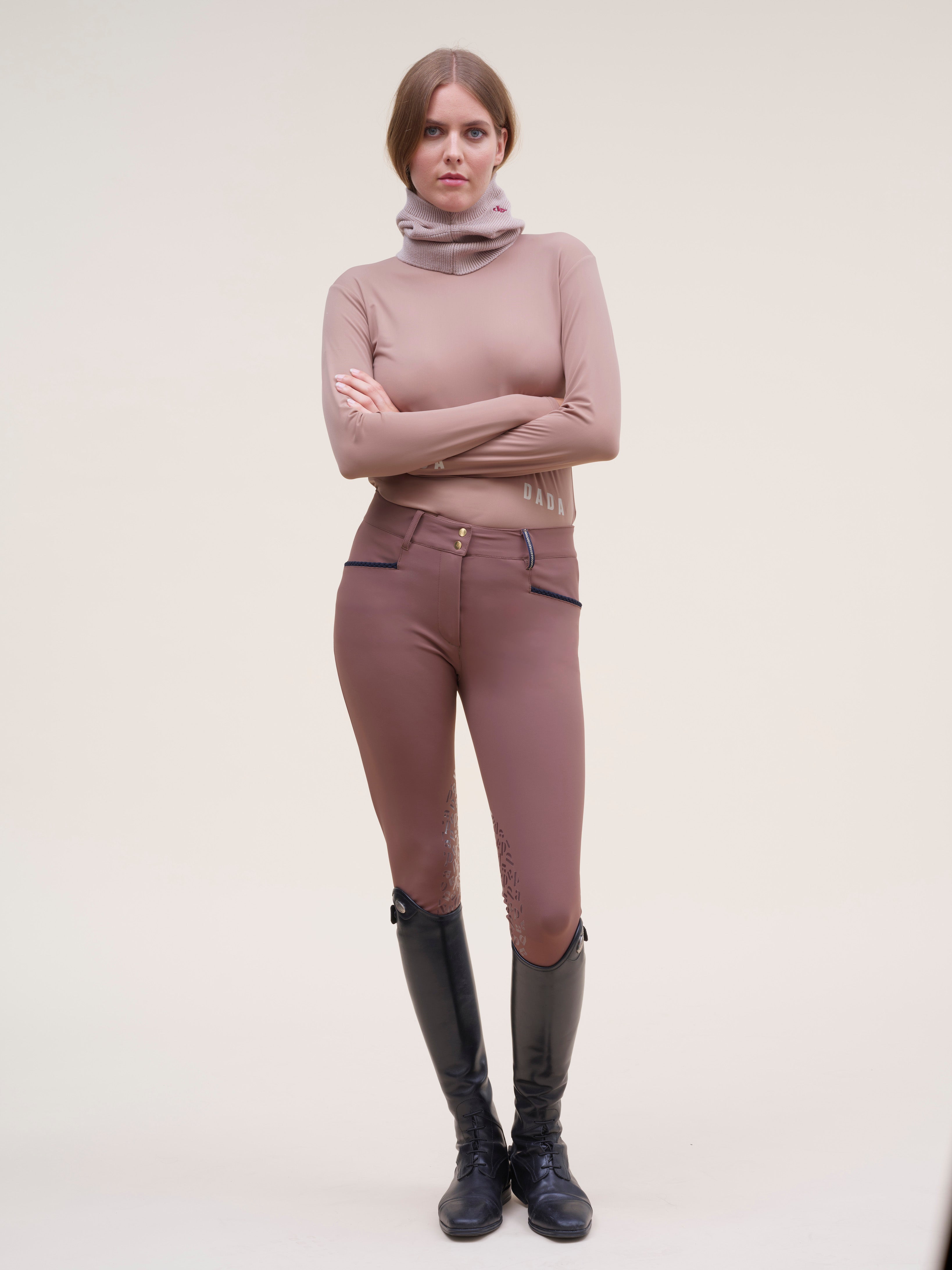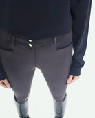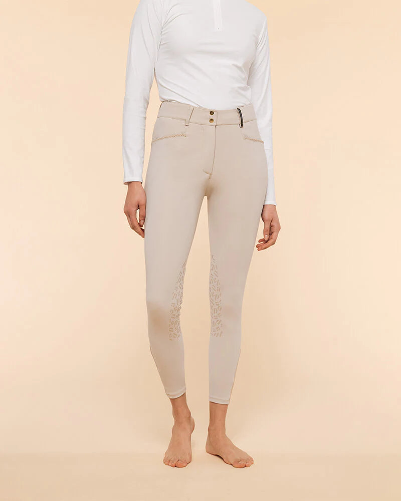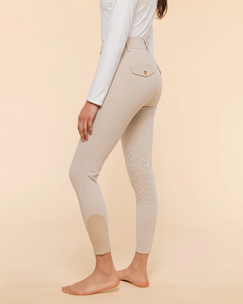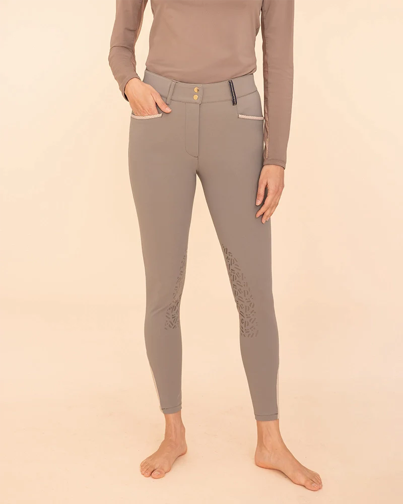 These riding pants from the Dada Sport range are designed in microfiber to offer maximum movement, while providing a shaping effect and optimal comfort. Giovani grip is made with a minimum of seams to limit friction points with the saddle and stirrup leathers. Giovani grip has two transparent patches formed by the Dada Sport logo on the inside of the knees for better stability in the saddle. The particularity of these pants is the work at the waist, their waist is low on the front and high on the lower back for optimum comfort. Its bi-stretch fabric elastic is inserted for better support without compressing and marking the waist. To add style to Giovani grip, every detail is important, the pants close with two golden hooks bearing the DADA logo. In addition, two slant pockets on the front decorated with a braid and two false rear flap pockets with a horn effect button finalize the silhouette. A side label with the DADA logo adorns the right rear pocket.
