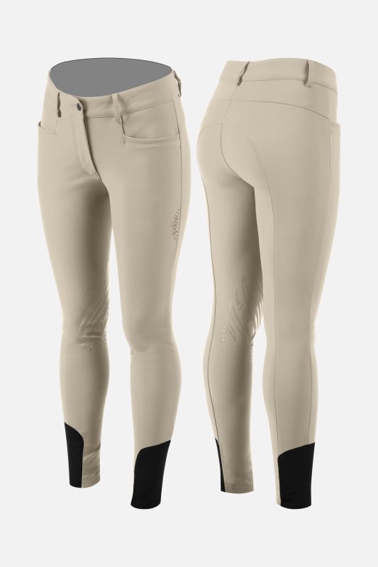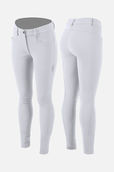 The knee grip, along with the one-button closure waist with belt loops, offer both comfort and security. The internal silicone strip helps keep the shirt tucked in, while ankle cuffs in jersey add to the comfort. The push-up effect enhances the silhouette, and the Albatros logo in rhinestones on the left leg underscores the classic design.