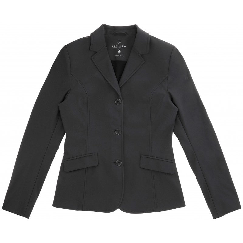 Equitheme Competition Jacket Nancy - This elegant, modern, and chic show jacket for women is designed to combine performance with style. The 4-way stretch fabric ensures maximum comfort and freedom of movement, making it ideal for active riders. Lightweight and resistant to pilling, the jacket maintains its sleek look even with frequent use. Its tailored fit creates a refined, ultra-feminine silhouette, featuring flattering waistline seams, double back pleats, and a precise laser-cut finish. The front closure includes four buttons and a discreet double zipper hidden beneath the button placket, offering both style and functionality. A mesh lining enhances breathability, while the smooth polyester lining in the sleeves ensures easy on and off. A subtle Equithème logo on the sleeve adds a final touch of sophistication without distracting from the jacket’s clean, polished design.