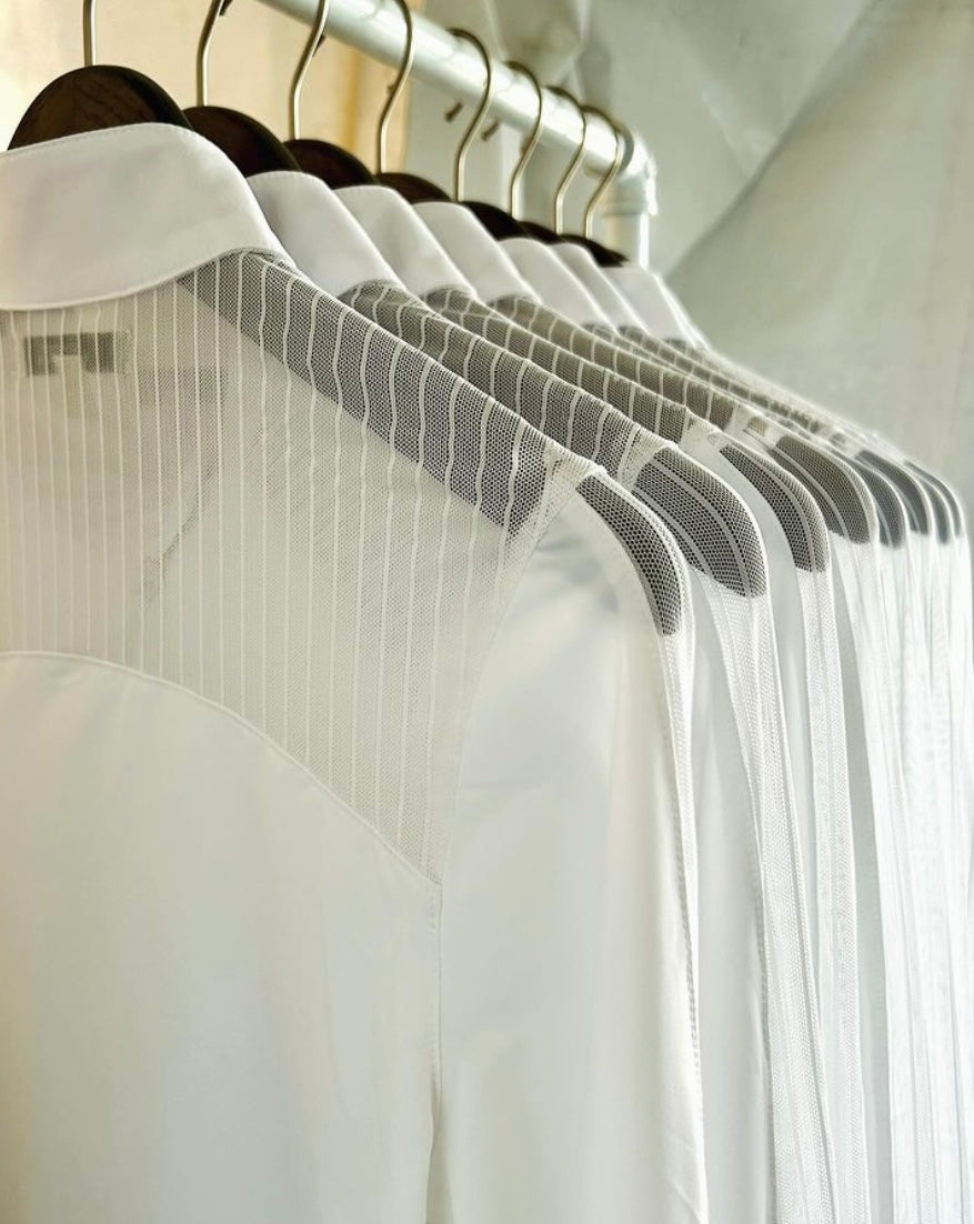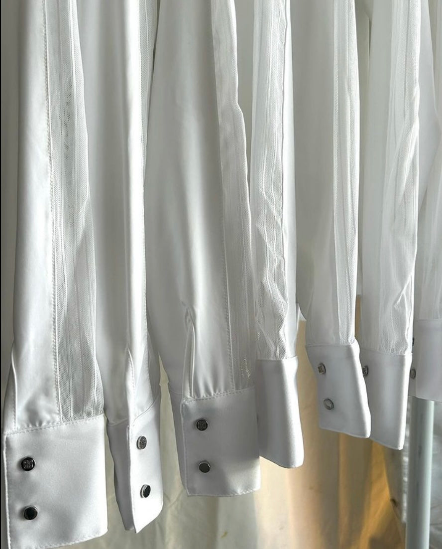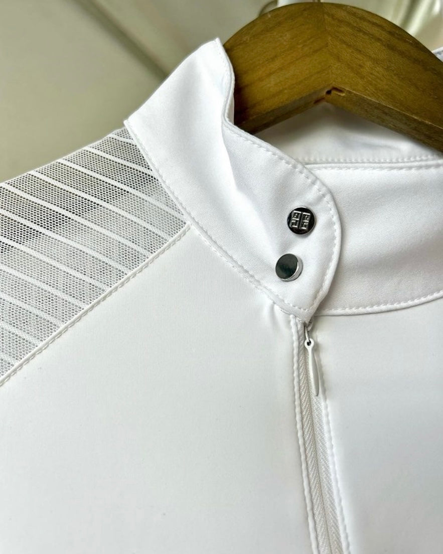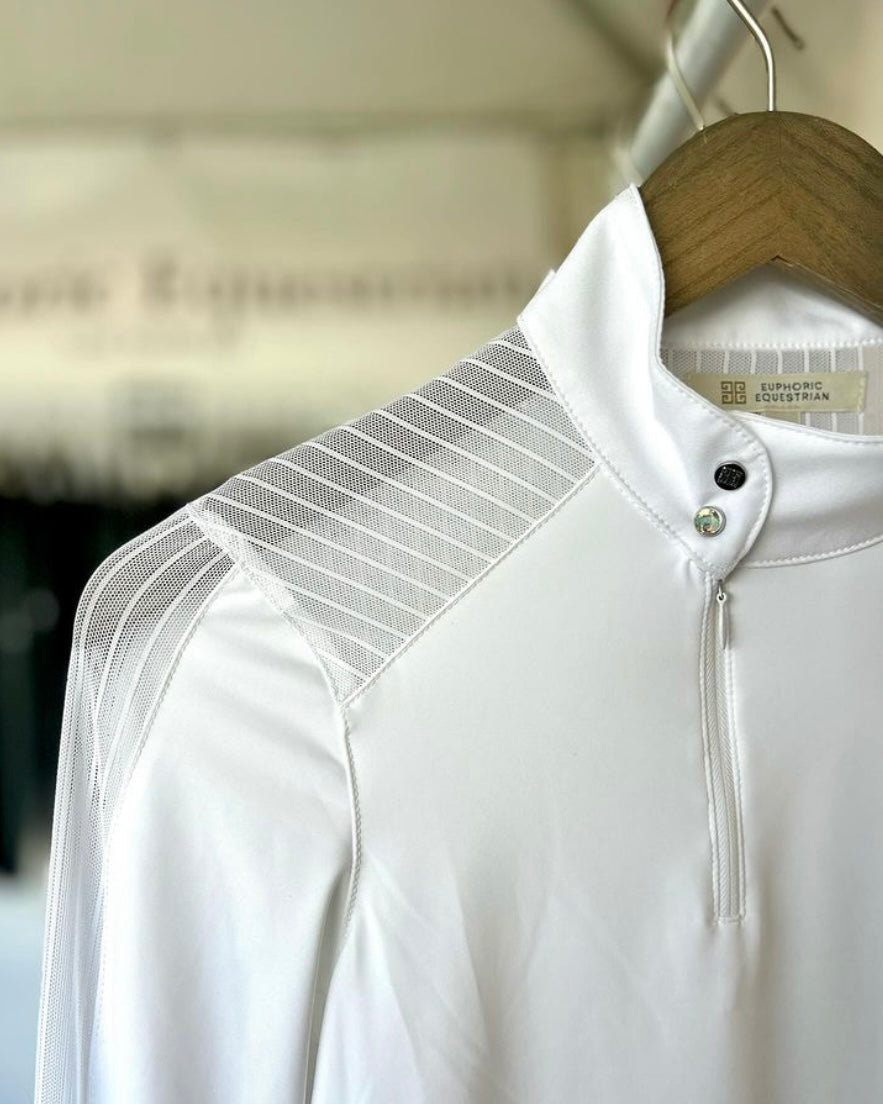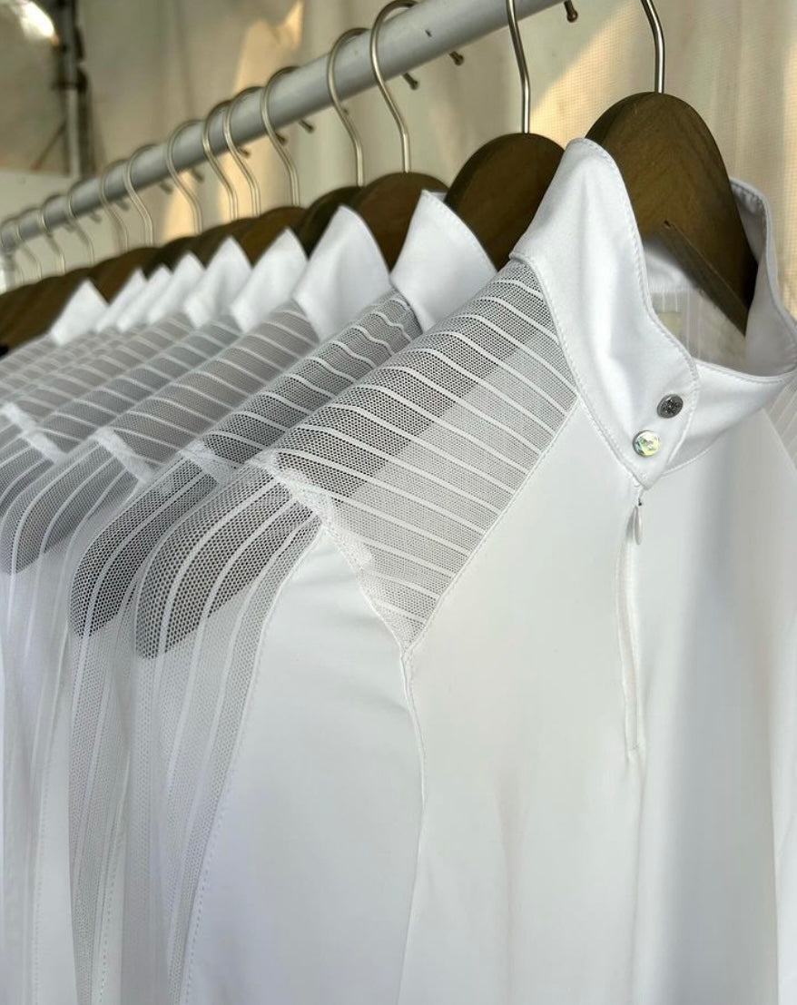 The Palm Beach features a dura-mesh striped lace detailing down the arm, shoulder and upper back. Our mesh always moves with you and is never constricting. If you are a hunter rider the lace detailing does not show with your coat on!
