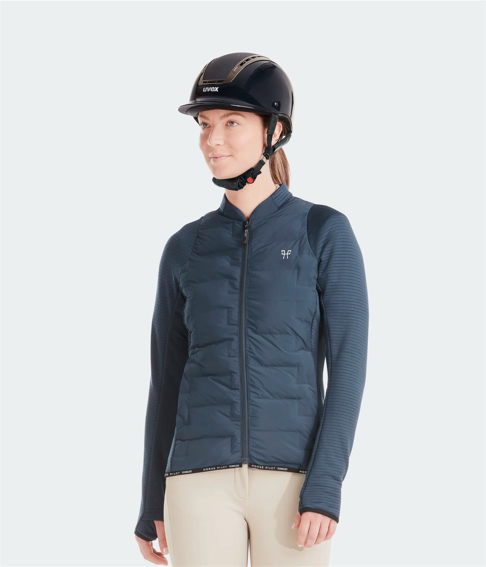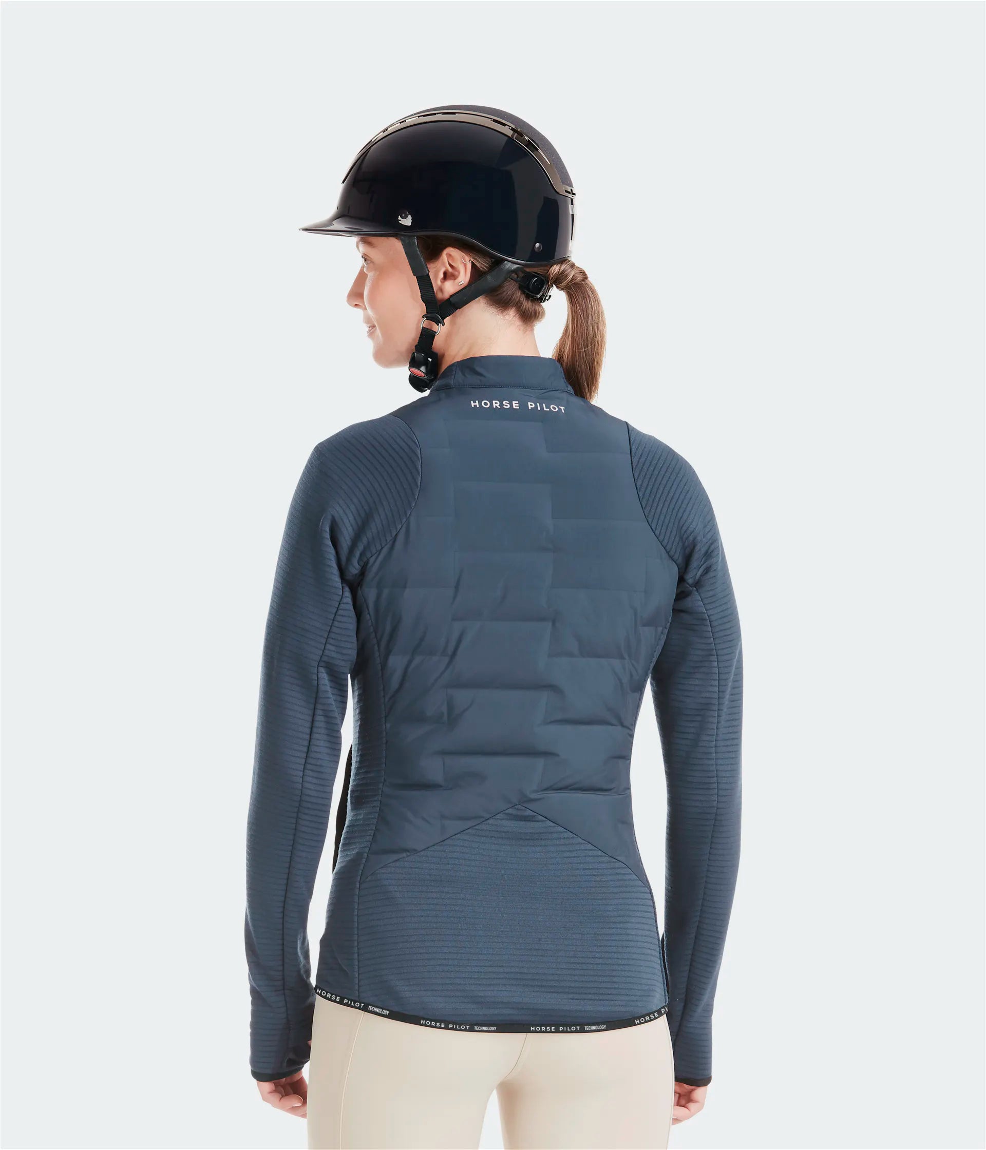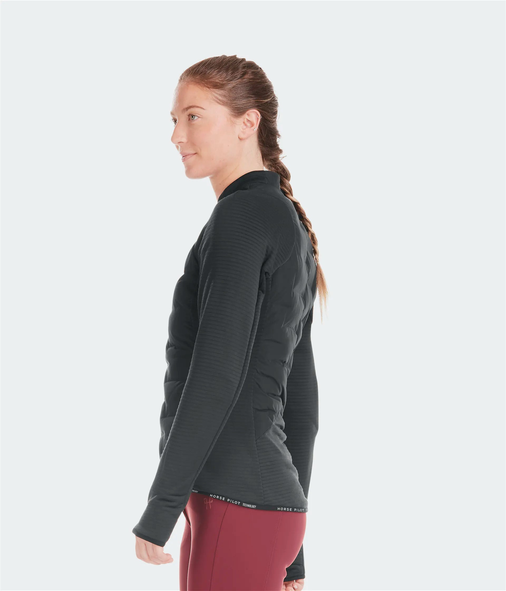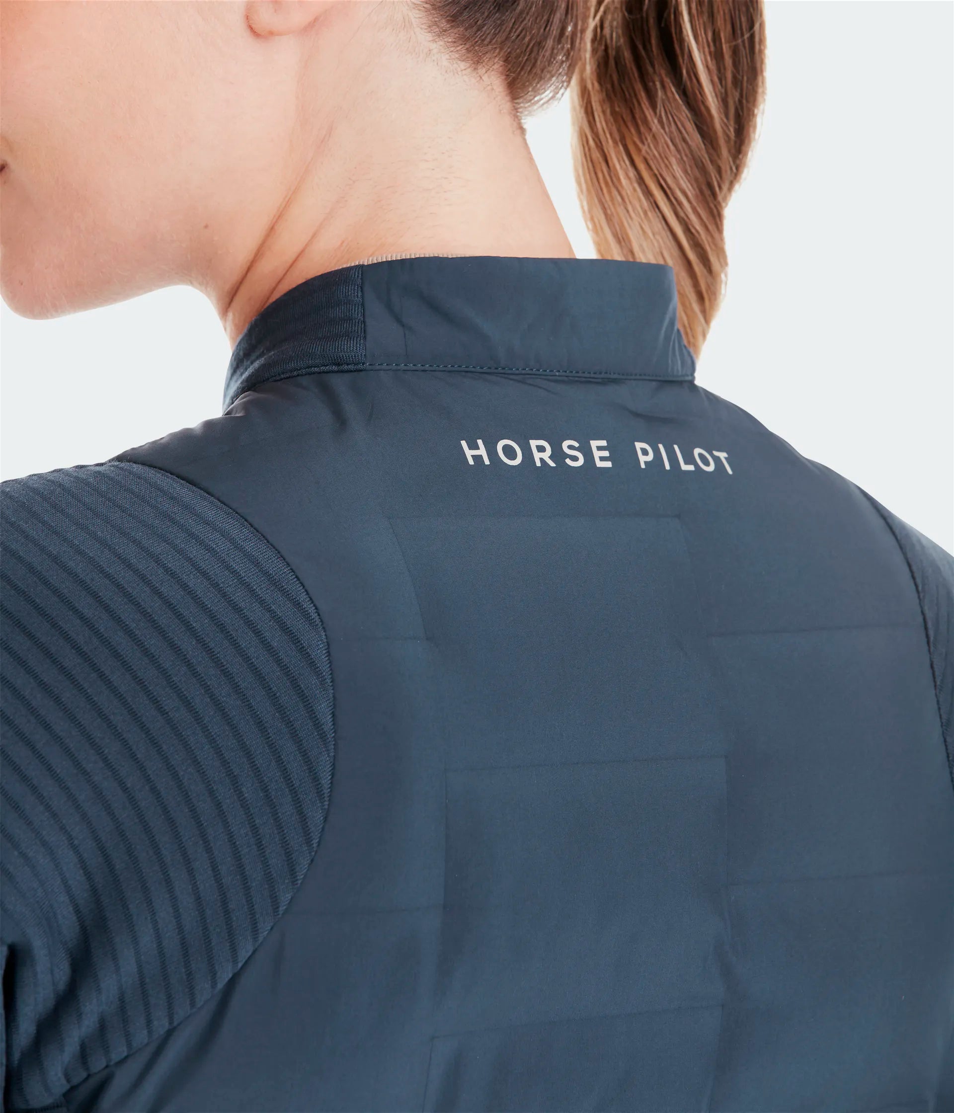 With the mix of quilted and fleece panels, the Storm jacket is the perfect middle ground between breathability and warmth. Pre-baffle panels on the chest and back provide warmth based on the body’s needs. This technique is achieved by weaving, which keeps air from penetrating the material. A lightweight, highly breathable fleece mesh on the sleeves, sides and lower back provides optimal comfort. Laser perforations on the sides increase the jacket’s breathability. And because eco-friendly design is a core value for us at Horse Pilot, we have chosen responsible materials: fleece made of recycled yarn, pre-baffle OEKO-TEX 100® certified with a DWR treatment that is guaranteed PFC free.