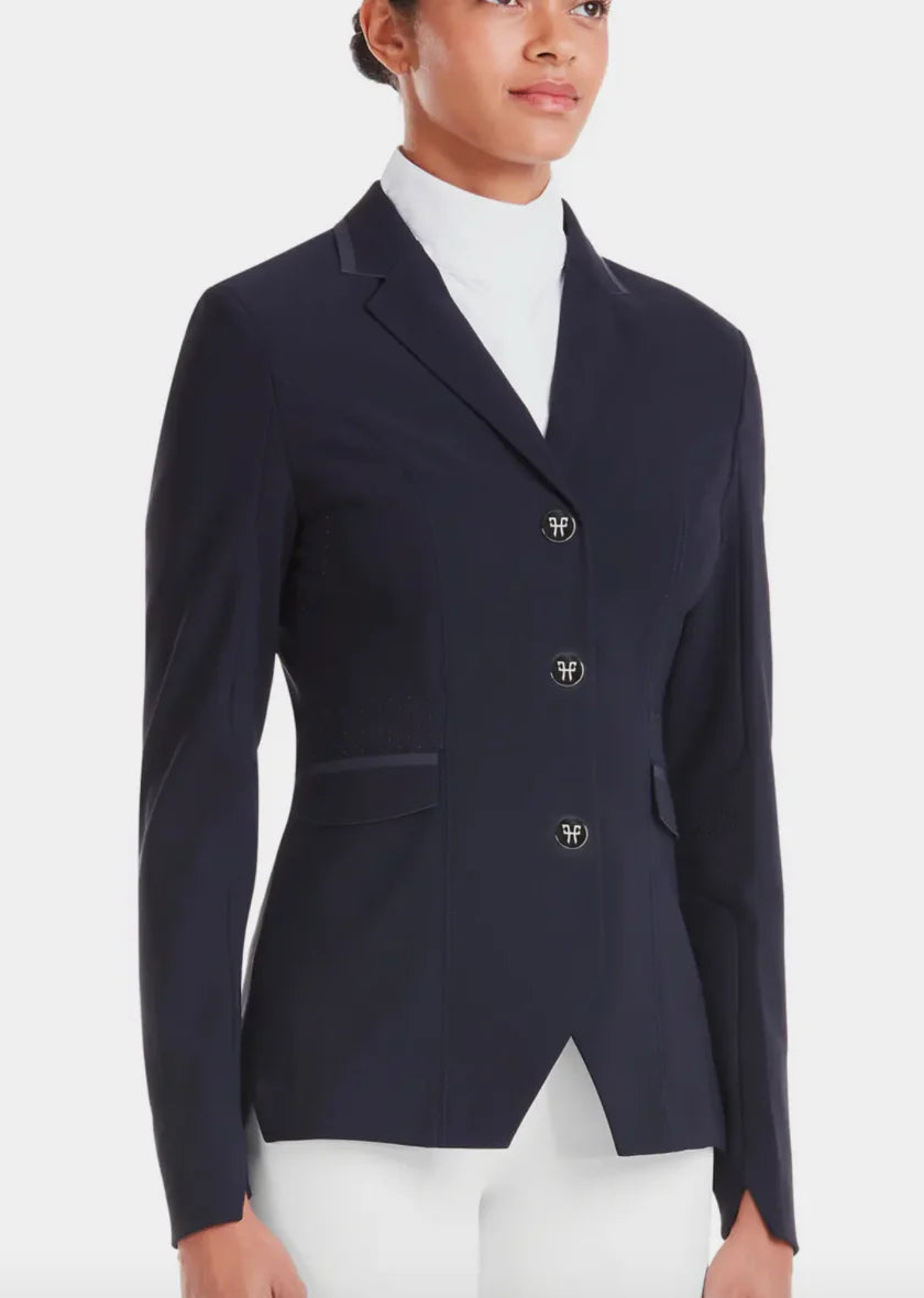 Horse Pilot's iconic competition jacket new with a lapel and flattering cut. Technical, elegant and eco-friendly, this jacket is tailored for a competition fit. Lighter weight than the Aerotech, offering technical comfort in all conditions.