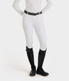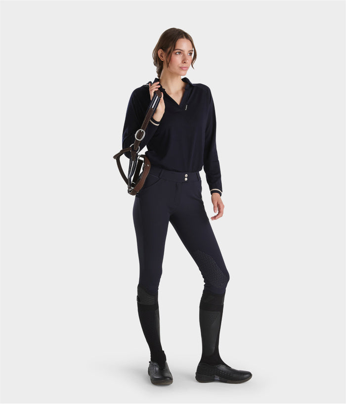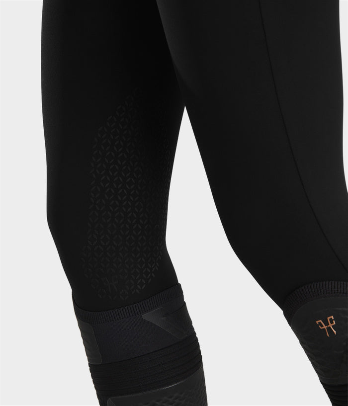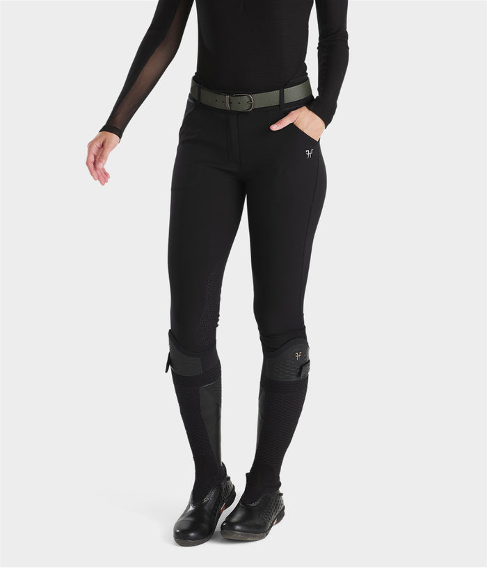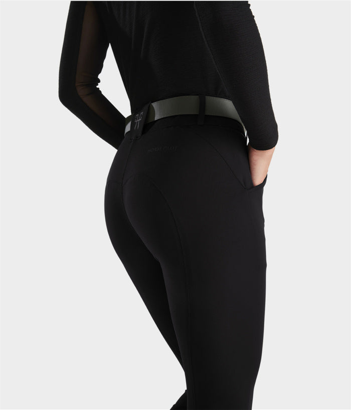 Technical riding pants combining performance and elegance. Sleek knee grip with integrated logo for subtle traction. Elastic waistband and leg bottoms for optimal support, discreet hand pockets, slim and sleek fit.