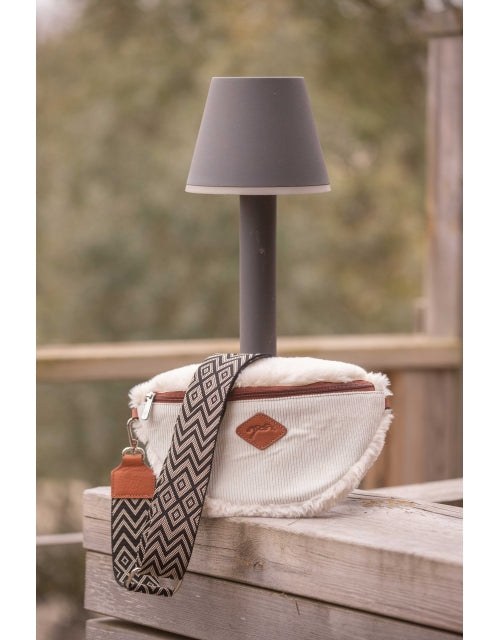 Soft, the Aliz Bumbag from the Pénélope Collections is crafted in faux fur and corduroy. It features a contrasting cognac zipper and a diamond-shaped leather insert embossed with the Pénélope logo for a refined, polished finish.