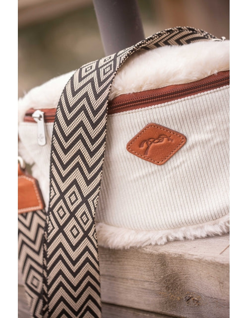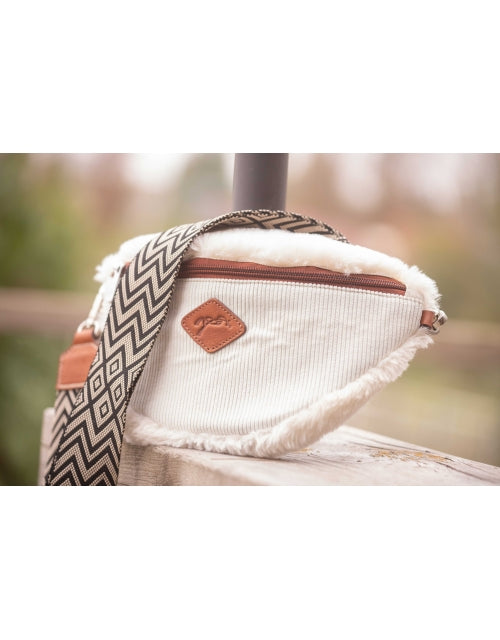 It also comes with a wide adjustable shoulder strap in a black and cream chevron pattern. The combination of faux fur and corduroy gives it a warm, winter-ready, and comfy look.