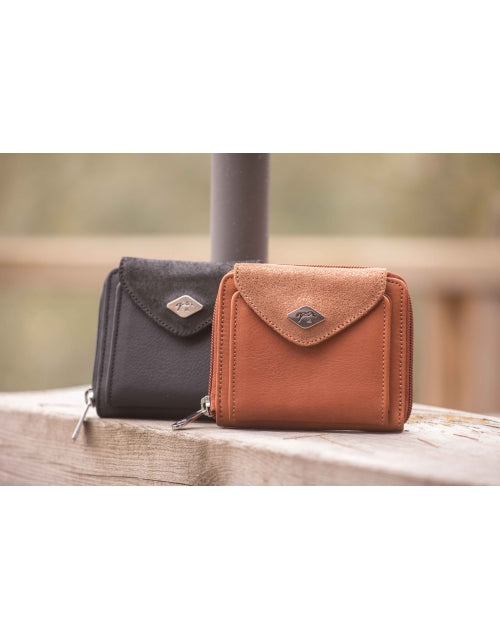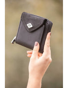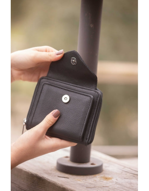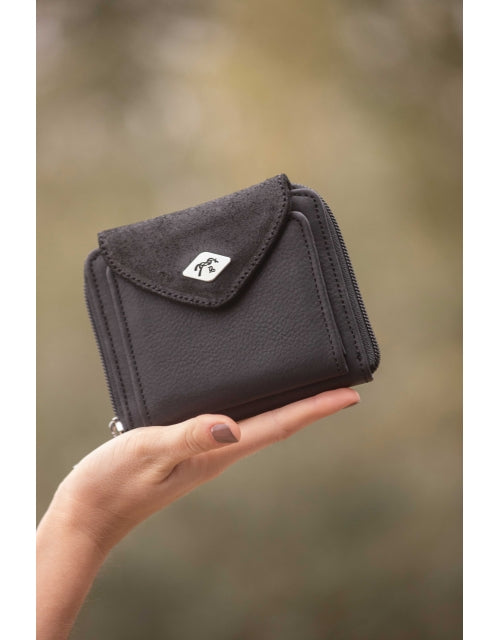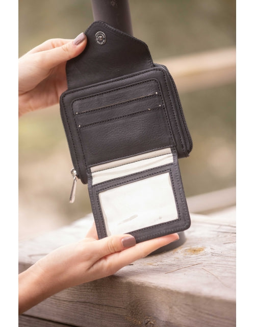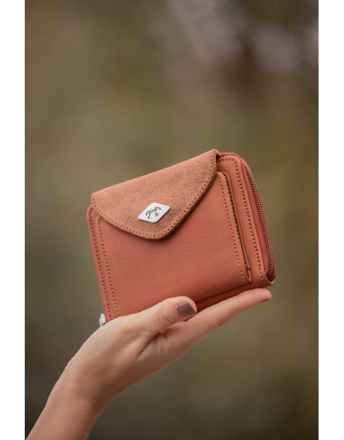 The Clémence leather wallet from the Pénélope Collections features a zippered compartment for coins with four card slots, and a second snap-closure compartment with two additional card slots and a transparent plastic window for photos or small documents. The flap of this compartment is made from glitter leather.
