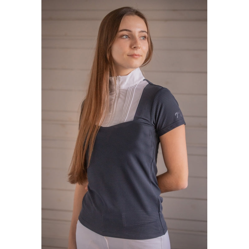 It is designed to be worn for show jumping competitions with white breeches. Under a show jacket, only the white collar and bib are visible.