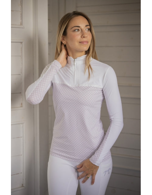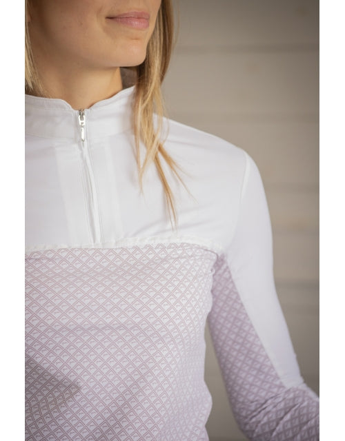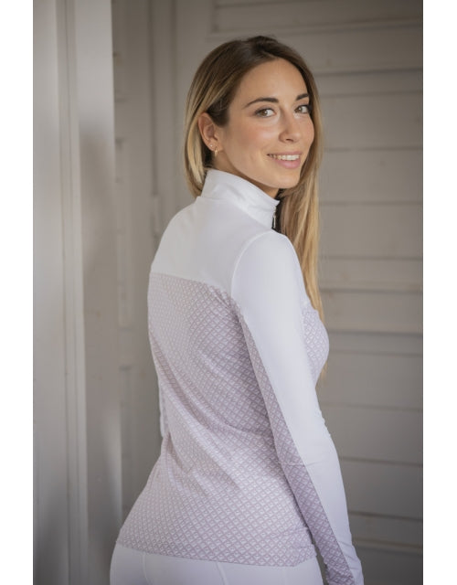Made with a lightweight and breathable fabric, the Debbie Long-Sleeve Show Polo Shirt is perfect for equestrian competitions. It features a white bib and elegant mandarin collar with an invisible zip, adorned with a pink Pénélope pattern. Stay comfortable and stylish while competing.