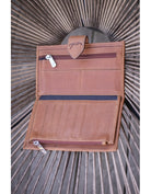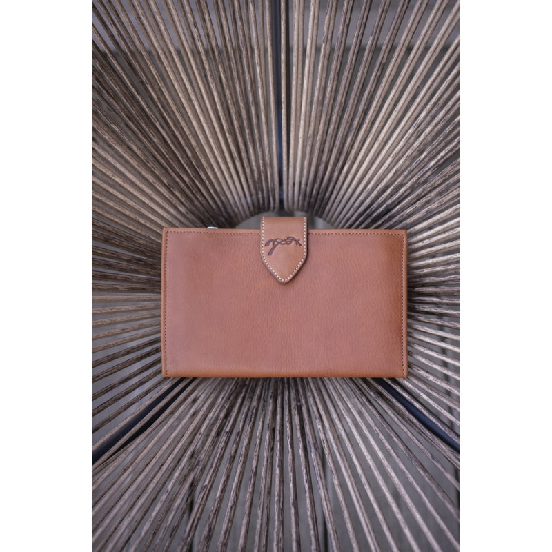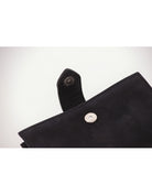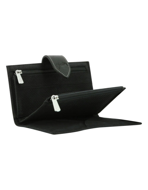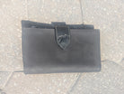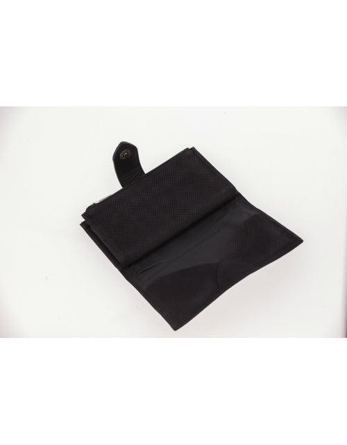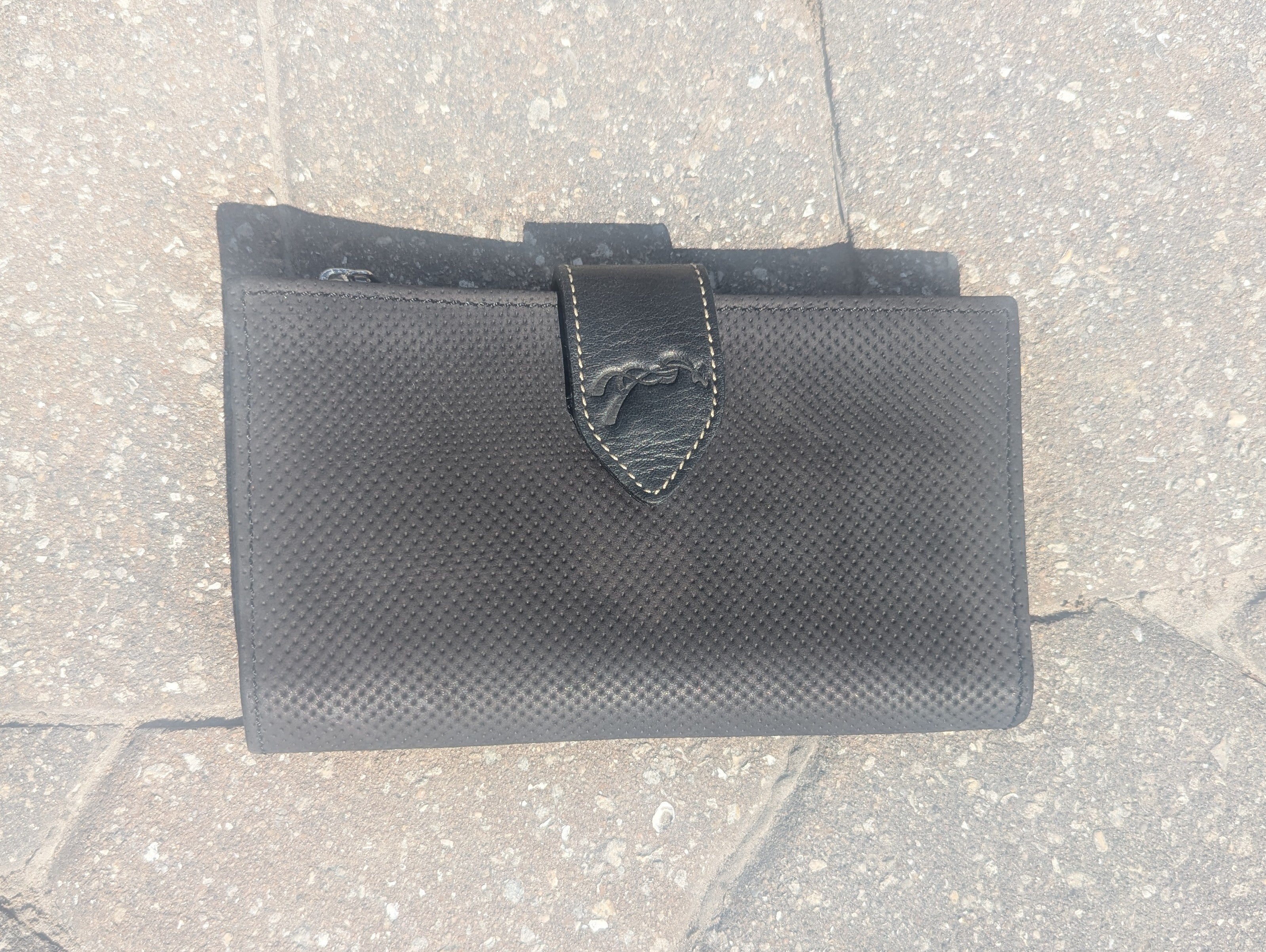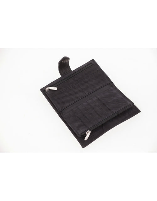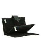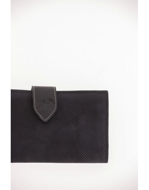 Bertille Wallet in perforated black leather. Ideal for carrying all your papers and means of payment with you. It consists of three sections to organize your coins, bank cards, or other cards, and your checkbook. It closes with a grained leather flap marked with the small Pénélope logo, accompanied by a snap button.