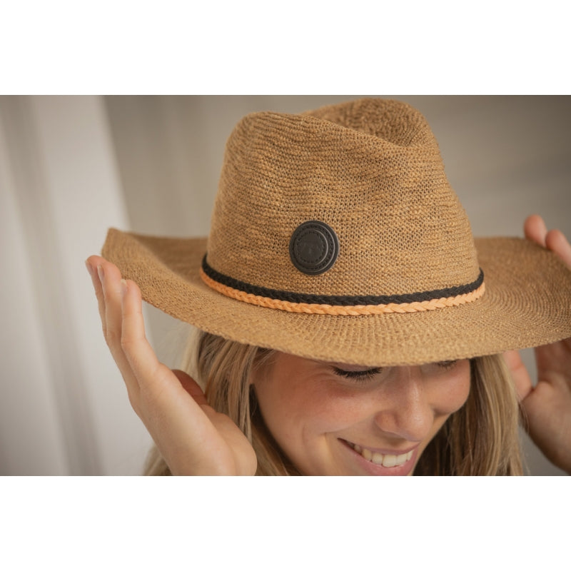 The Pénélope Rafia Summer Hat is the perfect accessory for spending time by the arena, shaded from the sun, or why not, at the beach during your holidays. It adjusts to various head sizes with its sliding drawstring inside. It is decorated with two subtle and colorful braids and features a round faux leather tag with the Pénélope logo.