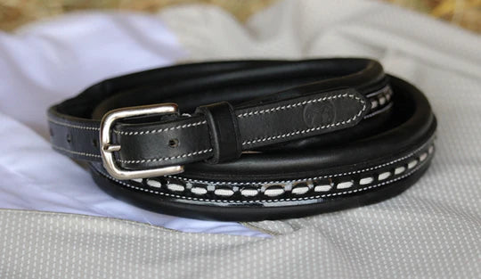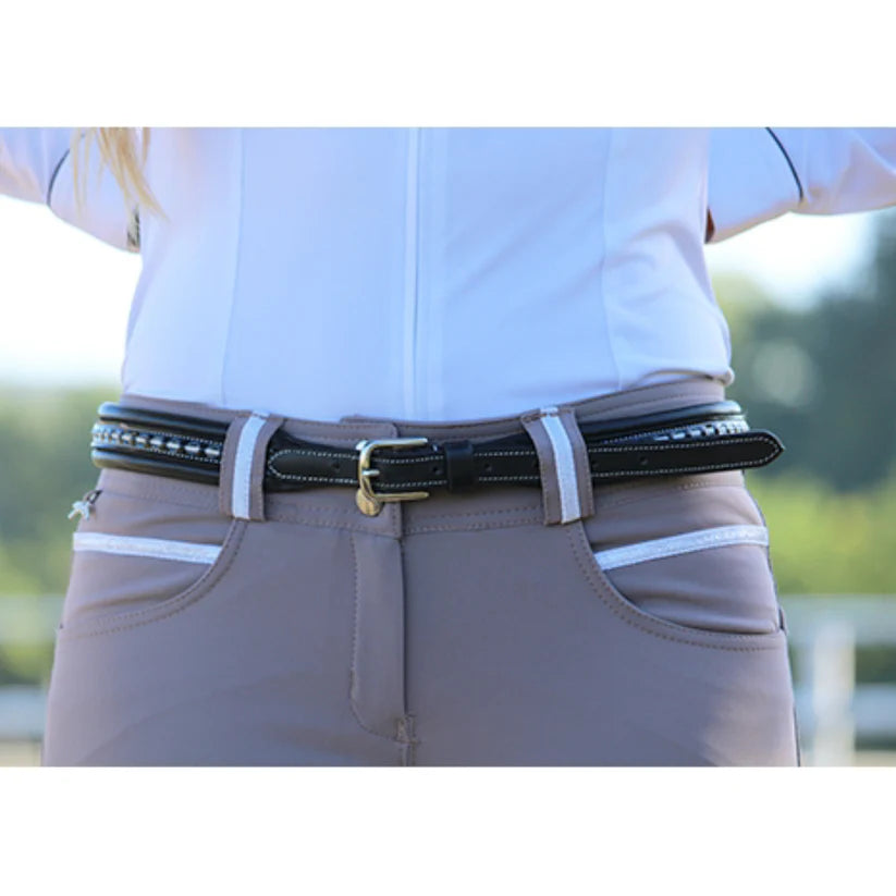 The rider also has the right to her leather accessory with a saddle stitch. The leather belt is lined with soft, comfortable leather with cream saddle stitch. The cream saddle stitch is put on a part of varnish leather.