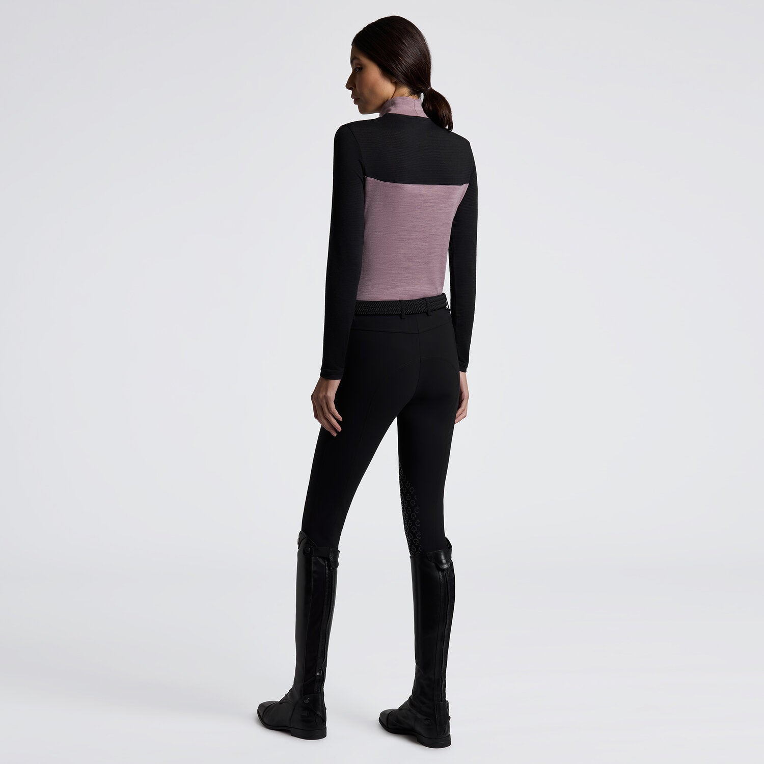 The Cavalleria Toscana Women's Long Sleeve Technical Wool Training Polo with Turtleneck is designed to deliver protection and performance during equestrian activities on cooler days. The wool body ensures thermal insulation and breathability, while the sleeves and upper sections in water-repellent and windproof technical fabric offer maximum functionality. The high turtleneck provides extra protection against the wind without compromising on style. The Cavalleria Toscana logo is heat-applied on the chest, a distinctive mark of sporty elegance. This is the ideal polo to face training sessions with comfort and confidence.