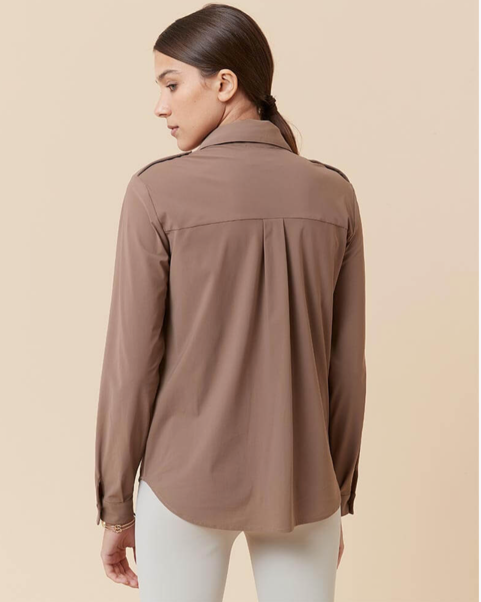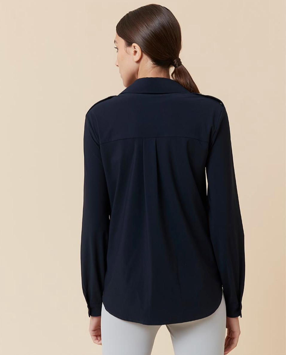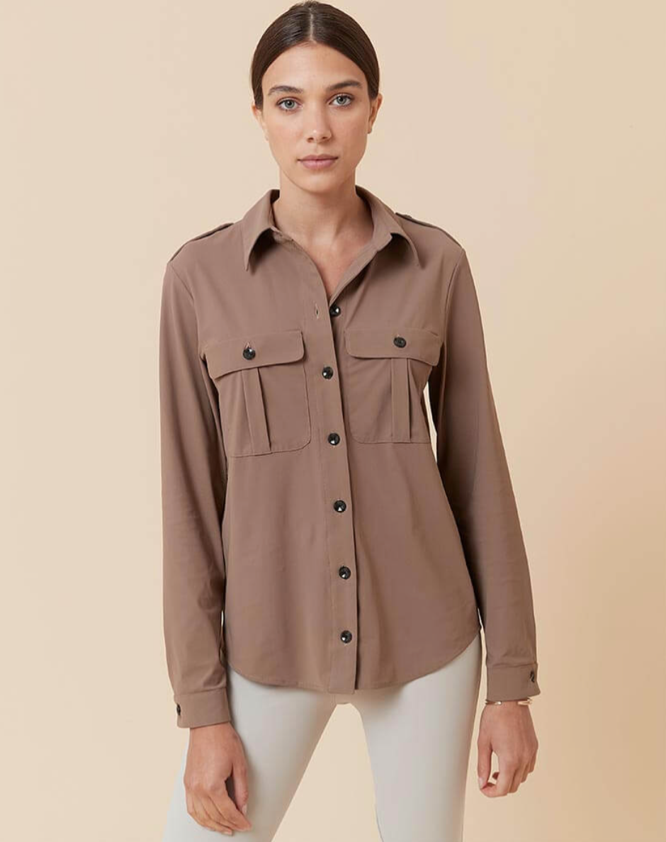 Lightweight, flowing shirt with flap pockets on the chest and a tab on each shoulder closed with a button. Shirt collar.