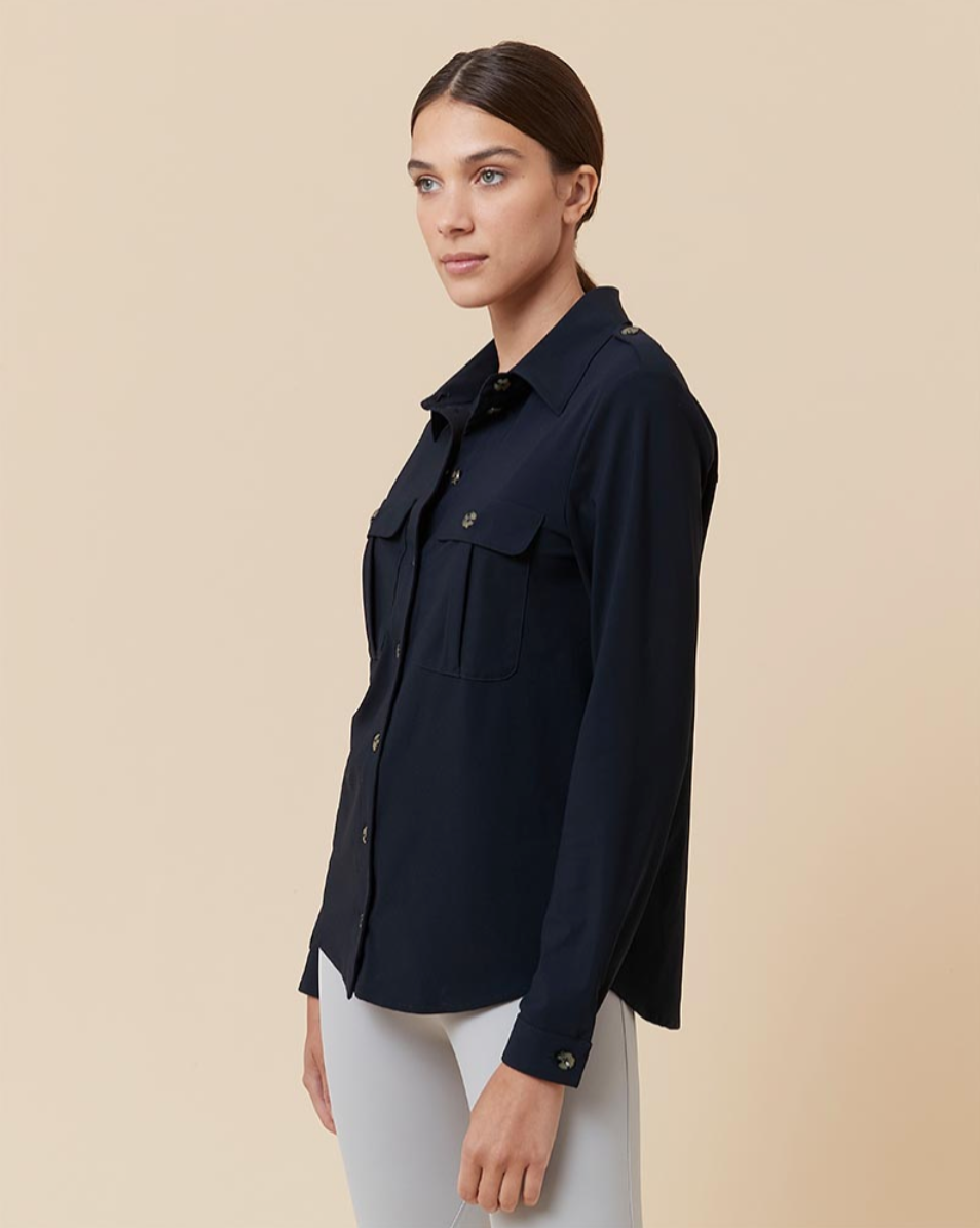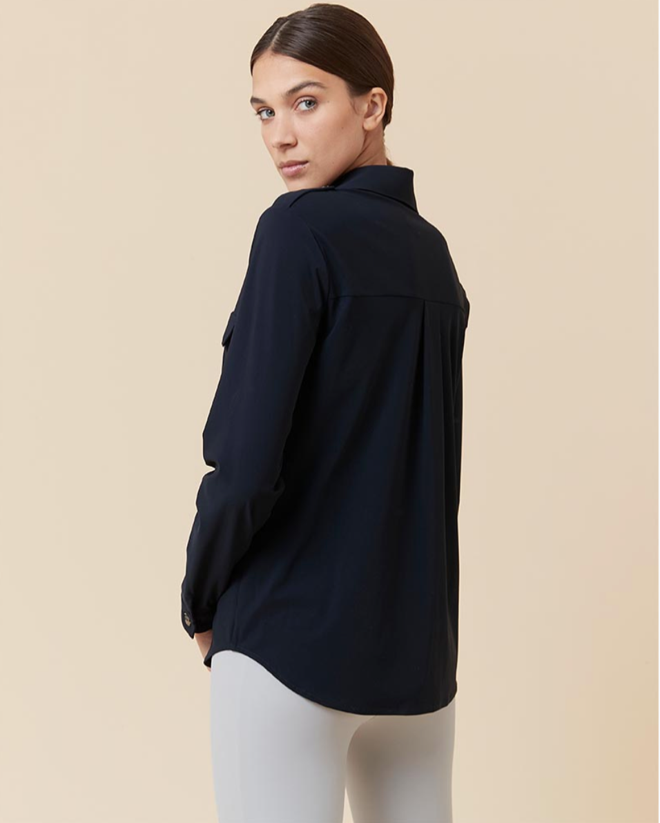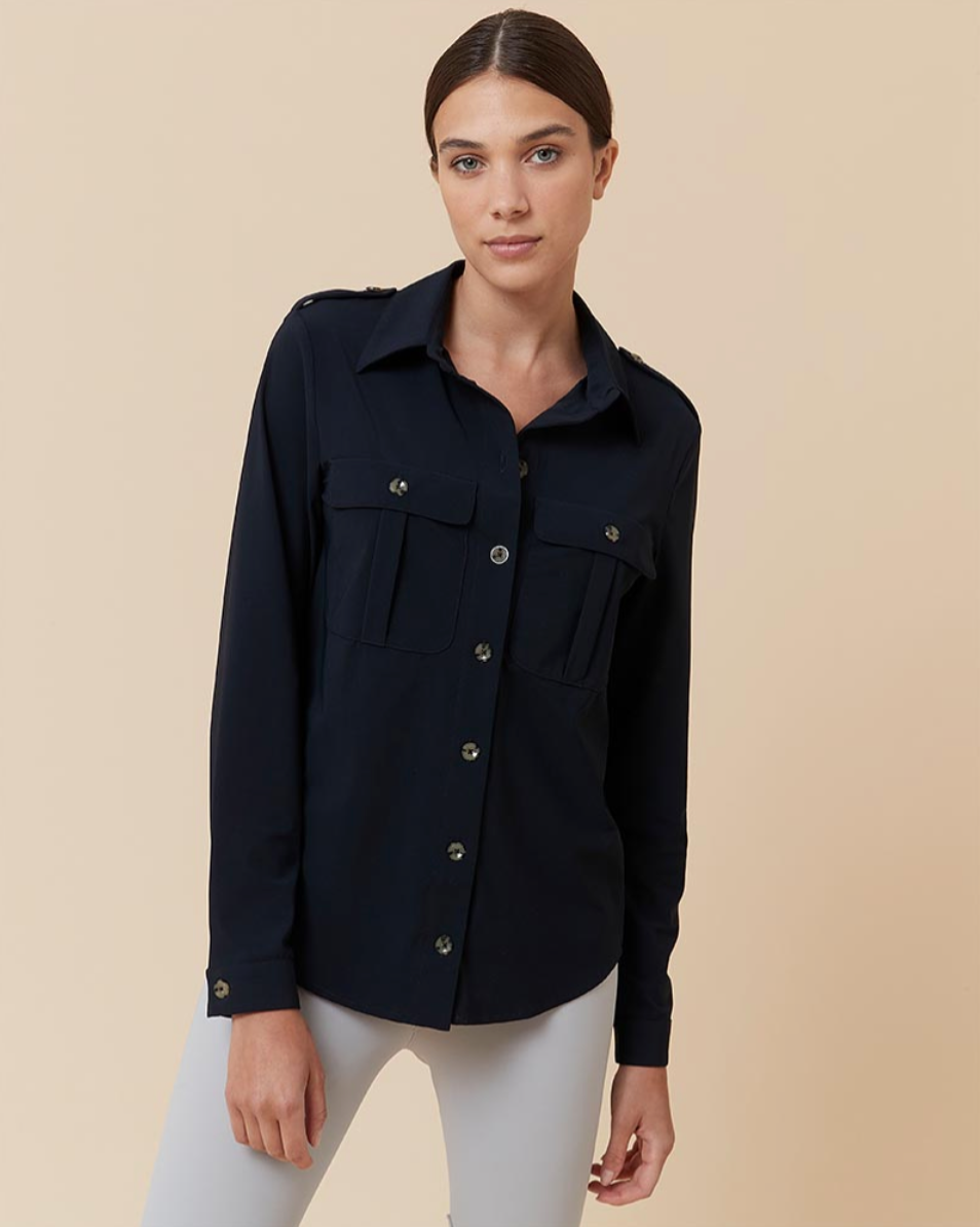 Lightweight, flowing shirt with flap pockets on the chest and a tab on each shoulder closed with a button. Shirt collar.