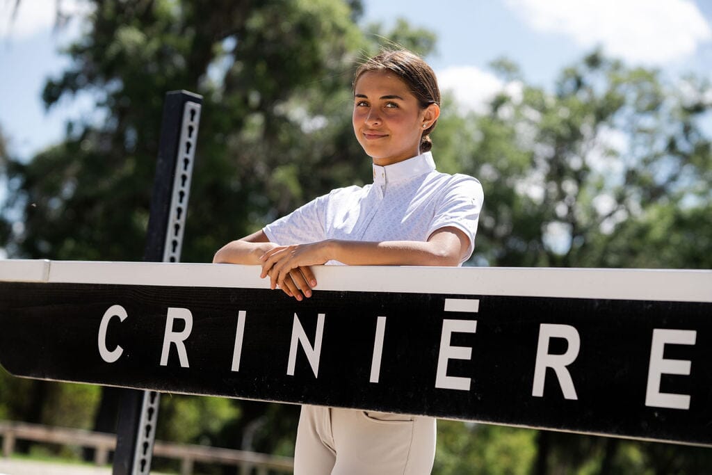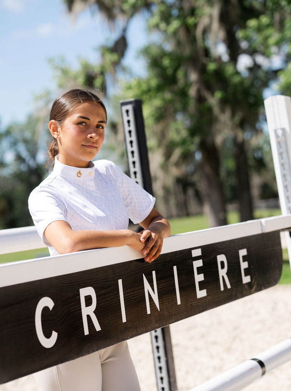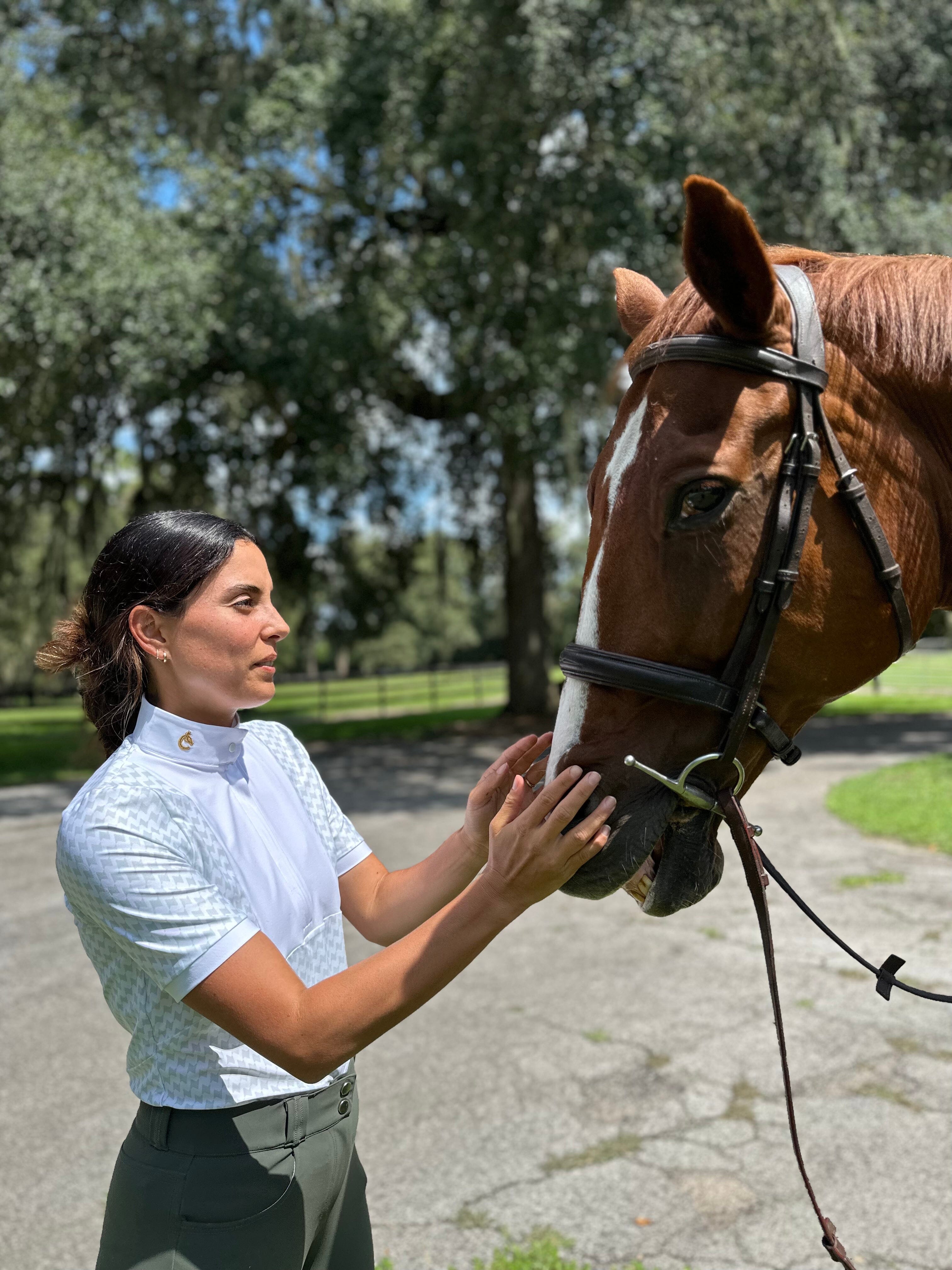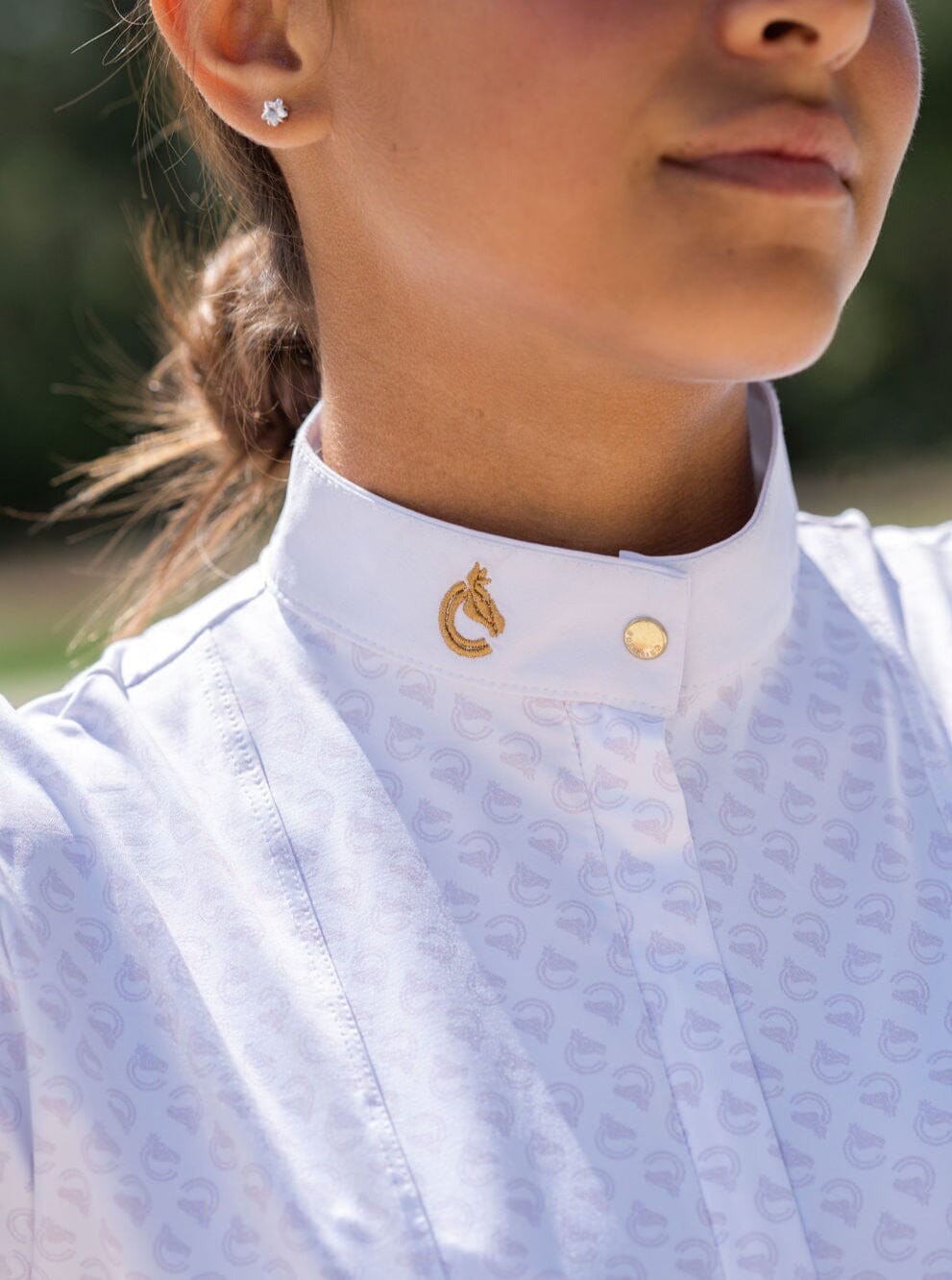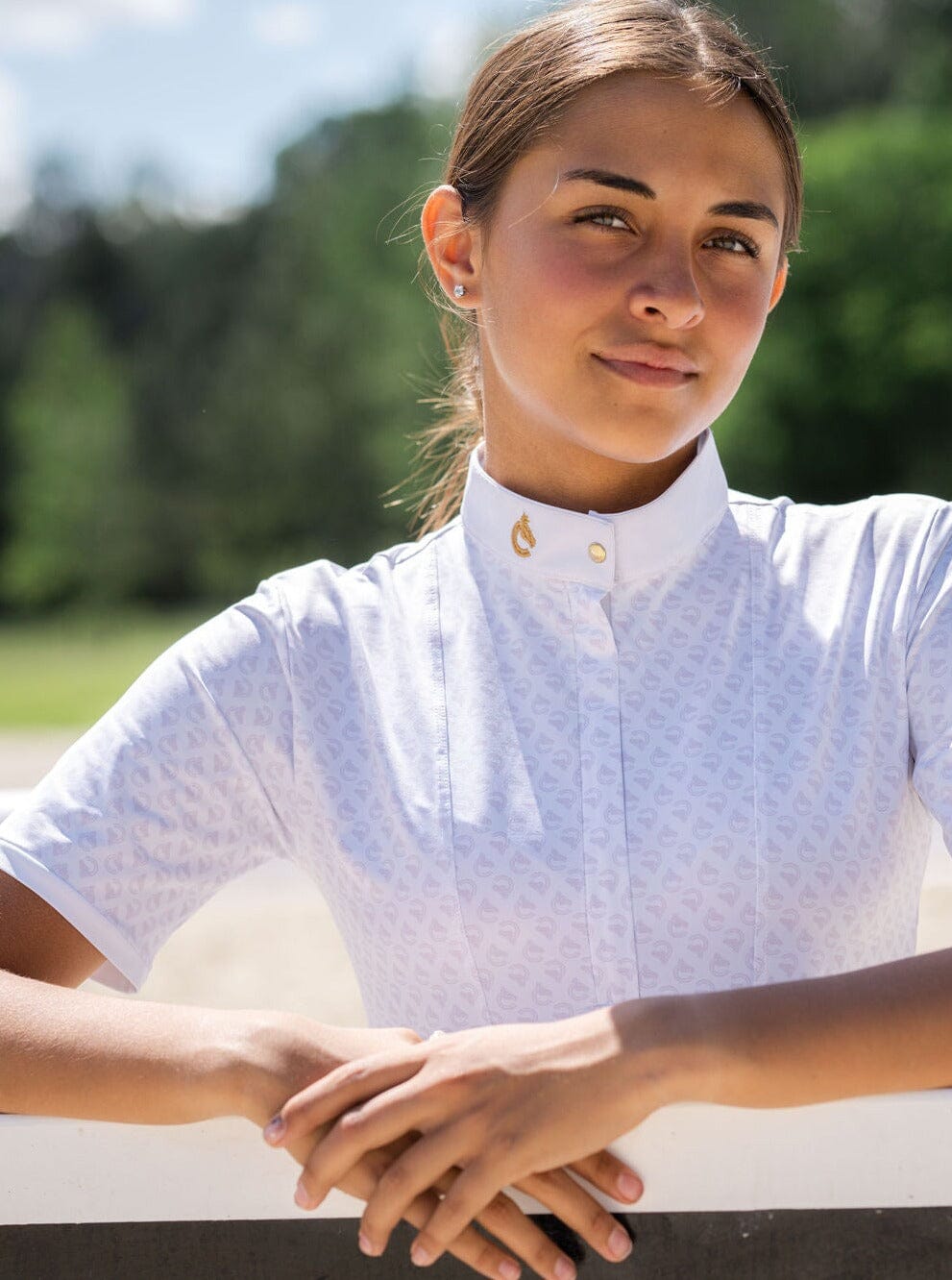 Make a statement in the show ring with the Helen Show Shirt Print. This competition top features a stylish slim-fit design and a beautiful, eye-catching print for a look that's both sophisticated and fun. The soft print adds a touch of personality without compromising on elegance. Long sleeves ensure optimal comfort throughout your ride, while the easy zip closure with one snap at the neck offers added coverage.