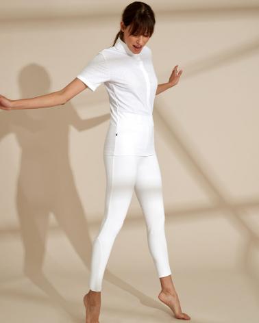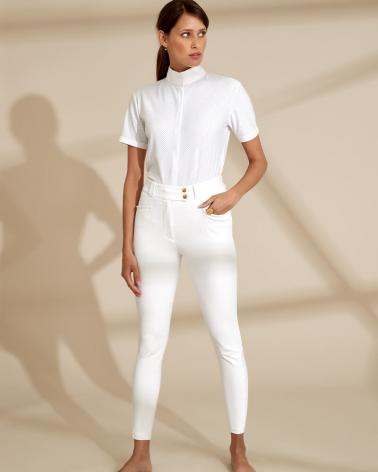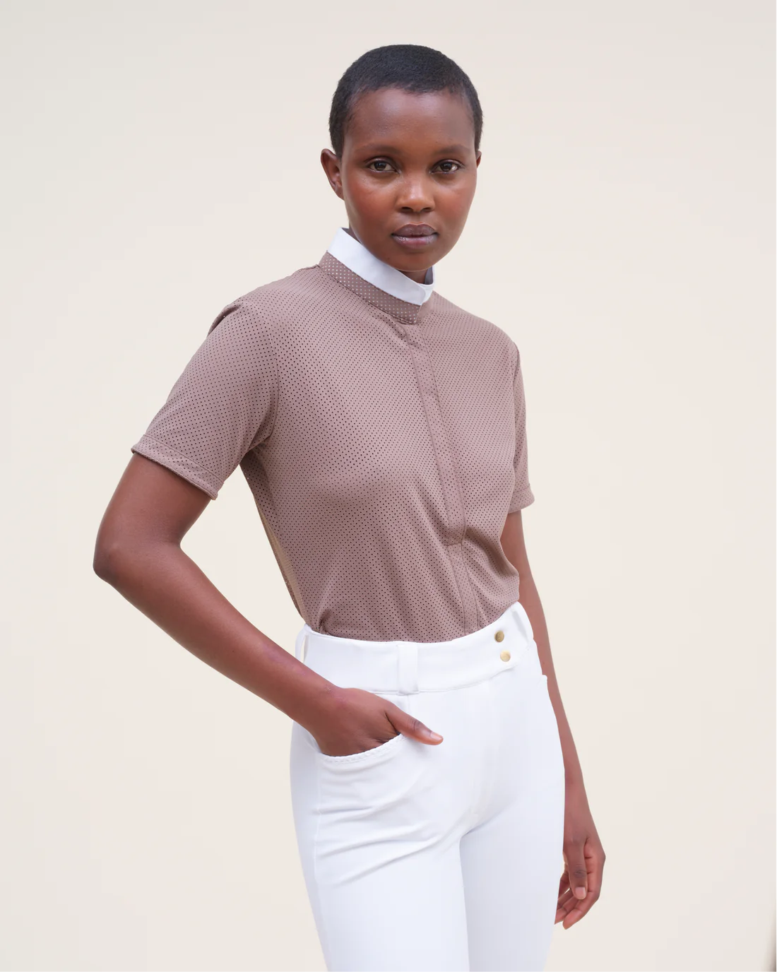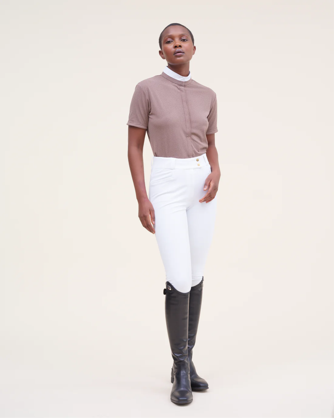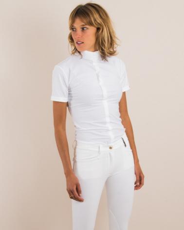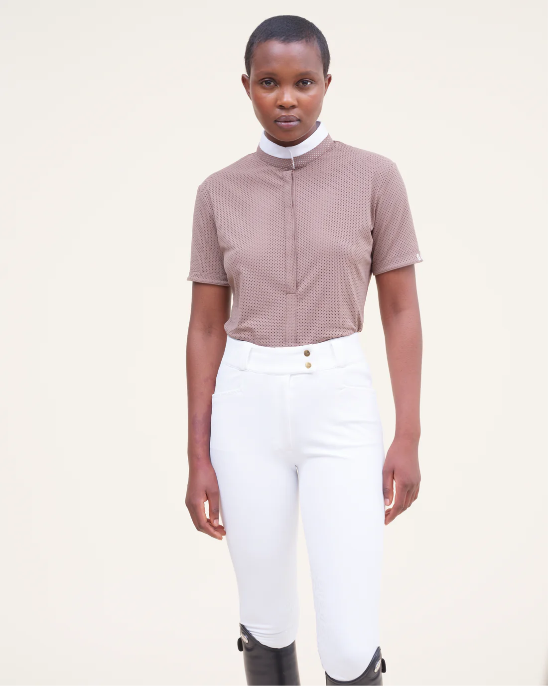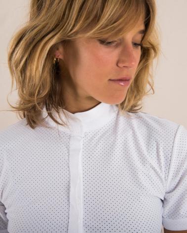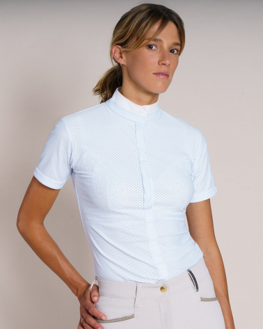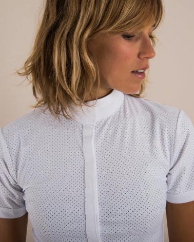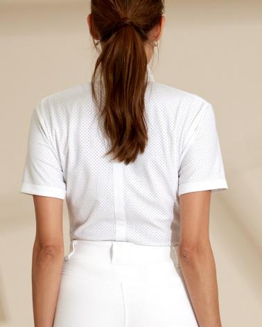 This equestrian polo shirt, curved and discreetly perforated in an anti-bacterial and very opaque microfibre fabric, will be your best partner for competition. Its sleeve length is particularly flattering, this "short sleeve" is neither too long nor too short, neither too tight nor too wide to emphasize a feminine silhouette.