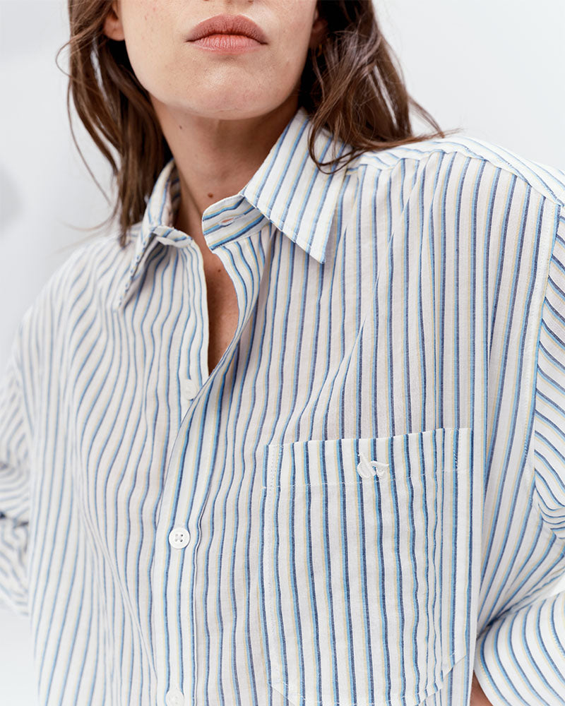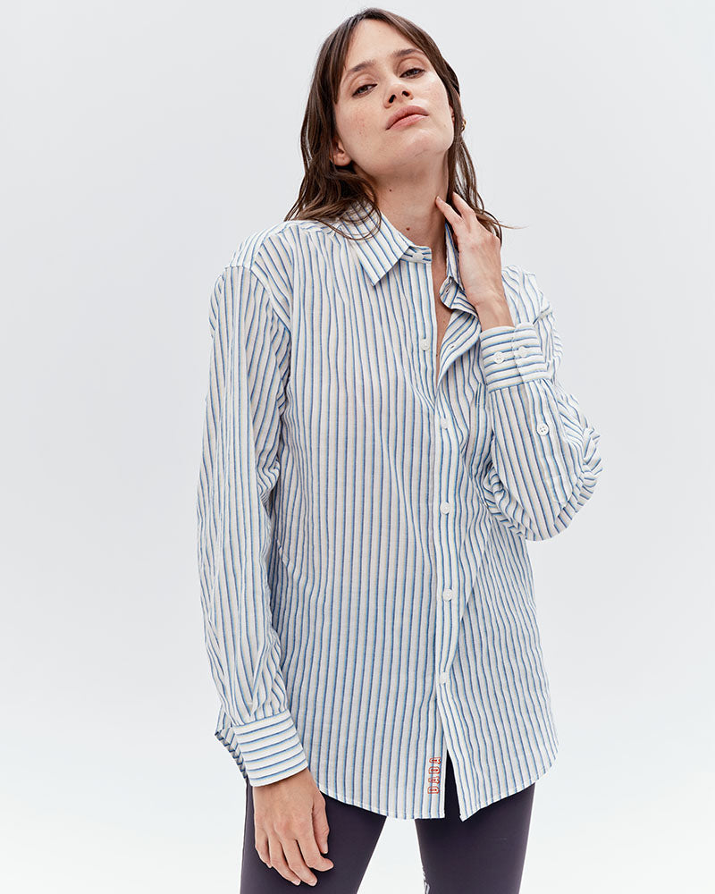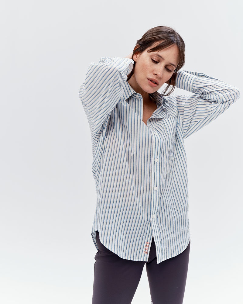 We love Olga for its bold look, natural drape, and relaxed, loose fit that gives it a chic yet laid-back vibe. Made from an ultra-light fabric, it offers unbeatable comfort—whether you're riding or going about your day. Available in classic black or sky-blue stripes, it's designed to suit every occasion.
