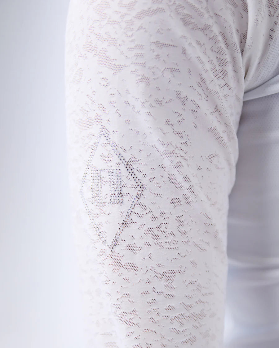 Left bicep, and right side seam micro crystal logos add a very subtle, tonal touch of shine.