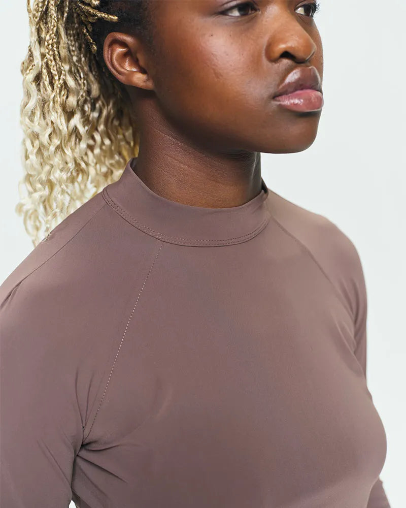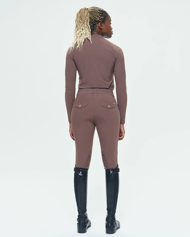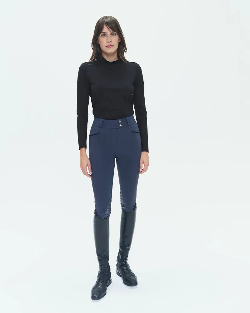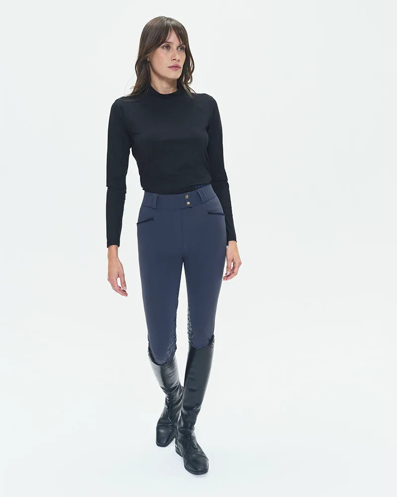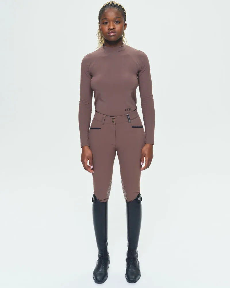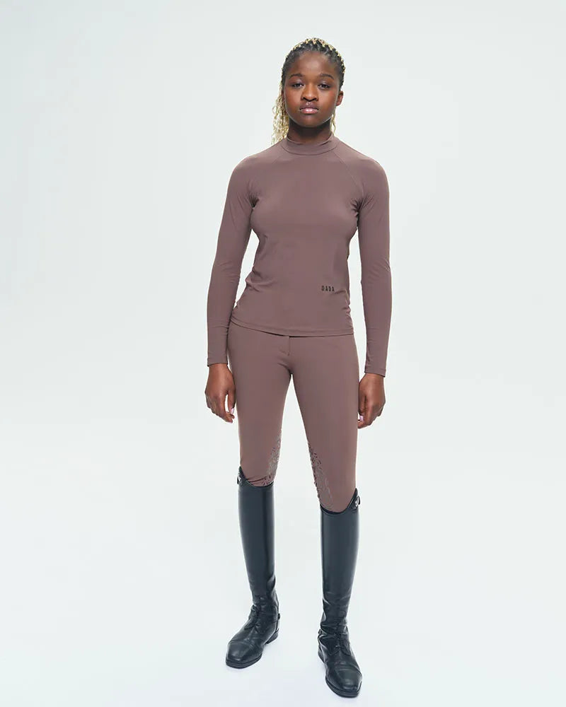 Technical light long-sleeved T-shirt, designed for riders looking for comfort and performance. With its ultra-breathable, lightweight and UV-protective Italian fabric, it offers a fitted cut and a high collar ideal for riding. Available in coffee, black and navy, this model combines elegance and practicality thanks to its easy care.