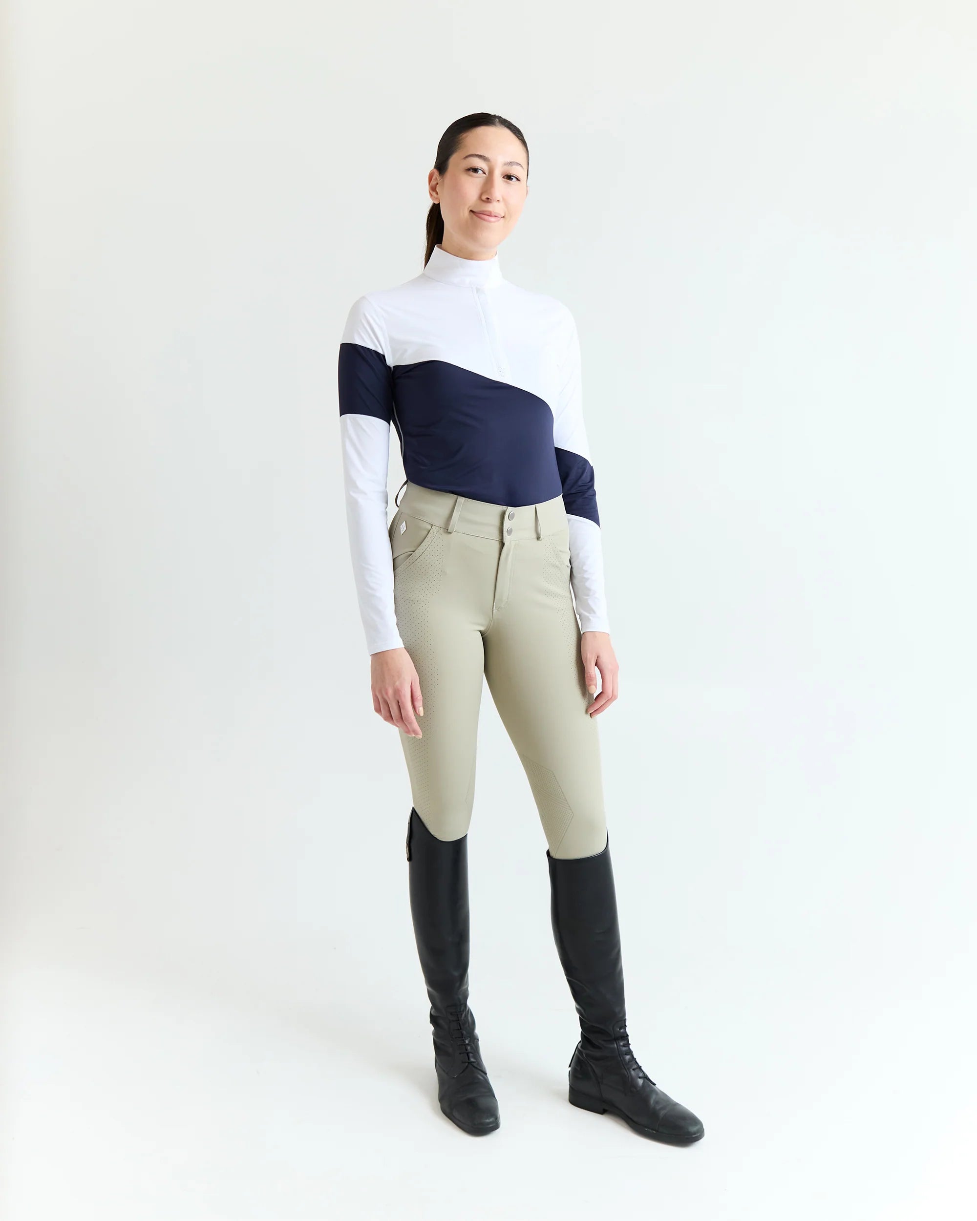 Microcrystals are subtly placed on the placket and center back for a touch of shine, while all details are hidden when wearing a show coat to be appropriate for all show rings with an equitation height collar.