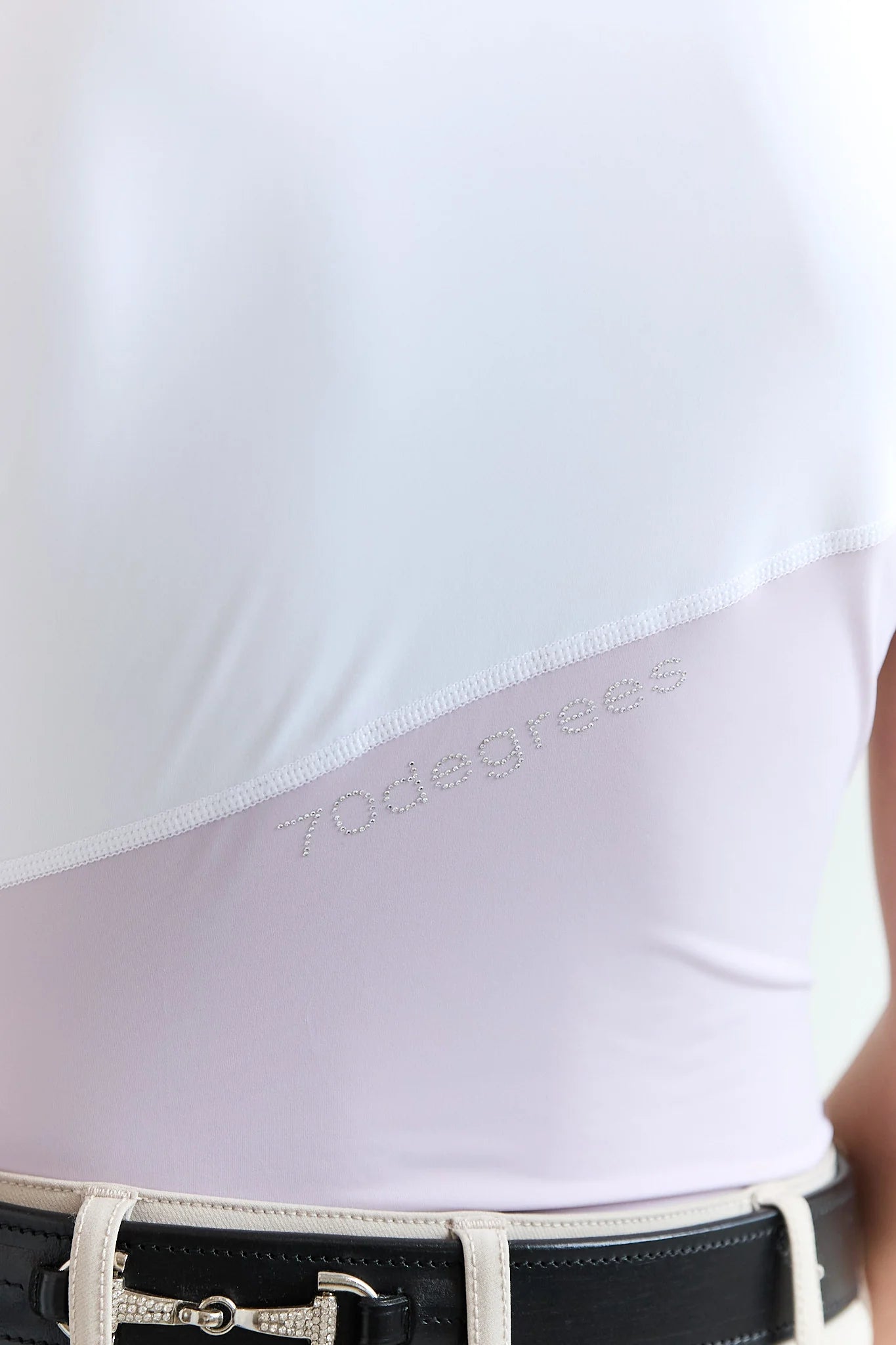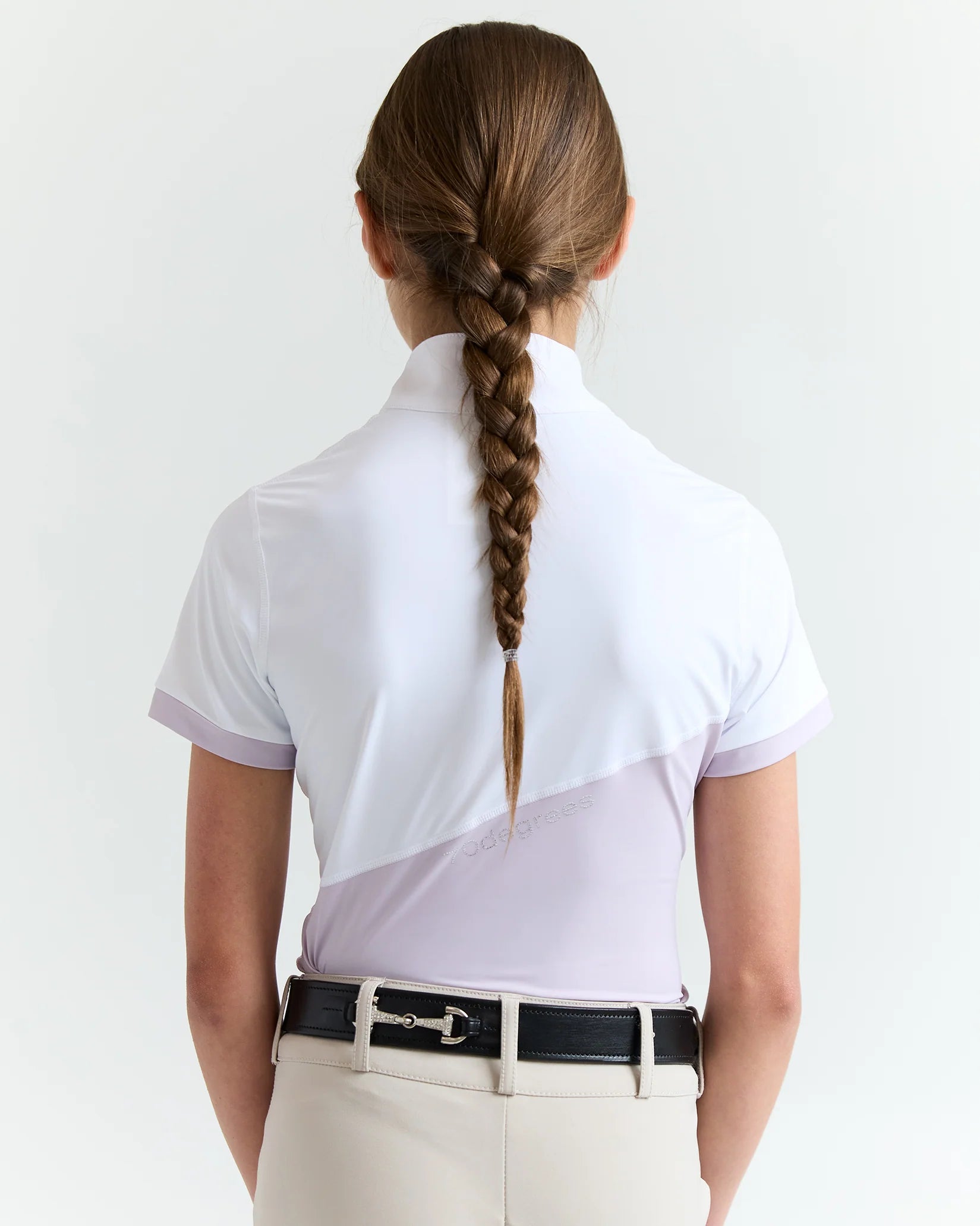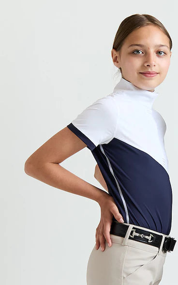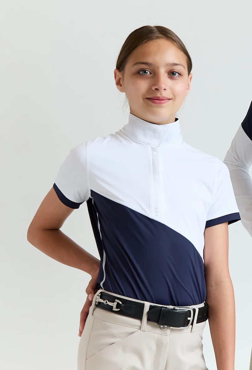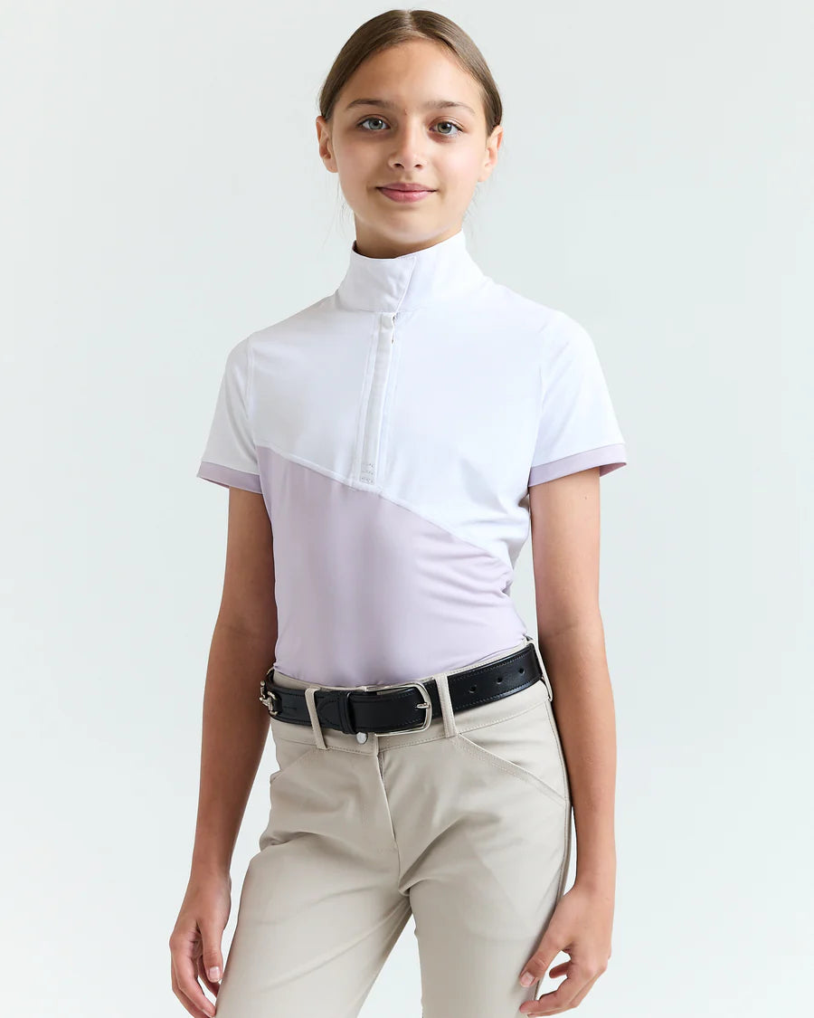 Microcrystals are subtly placed on the placket and center back for a touch of shine, while all details are hidden when wearing a show coat to be appropriate for all show rings with an equitation height collar.