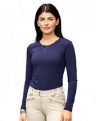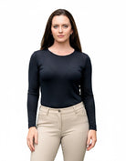 Meet your new go-to performance staple: the Cadence Shirt. Designed with a flattering crew neckline and crafted from our signature perforated fabric, this long sleeve essential offers breathable comfort that moves with you. Whether you're wearing it for practice rides or pairing it with leggings for an everyday athletic lifestyle, the Cadence Shirt delivers a sleek, athletic silhouette without sacrificing softness or stretch. Available in White, Jet Black, and Midnight Blue, and made from 80% Nylon, 20% Spandex.