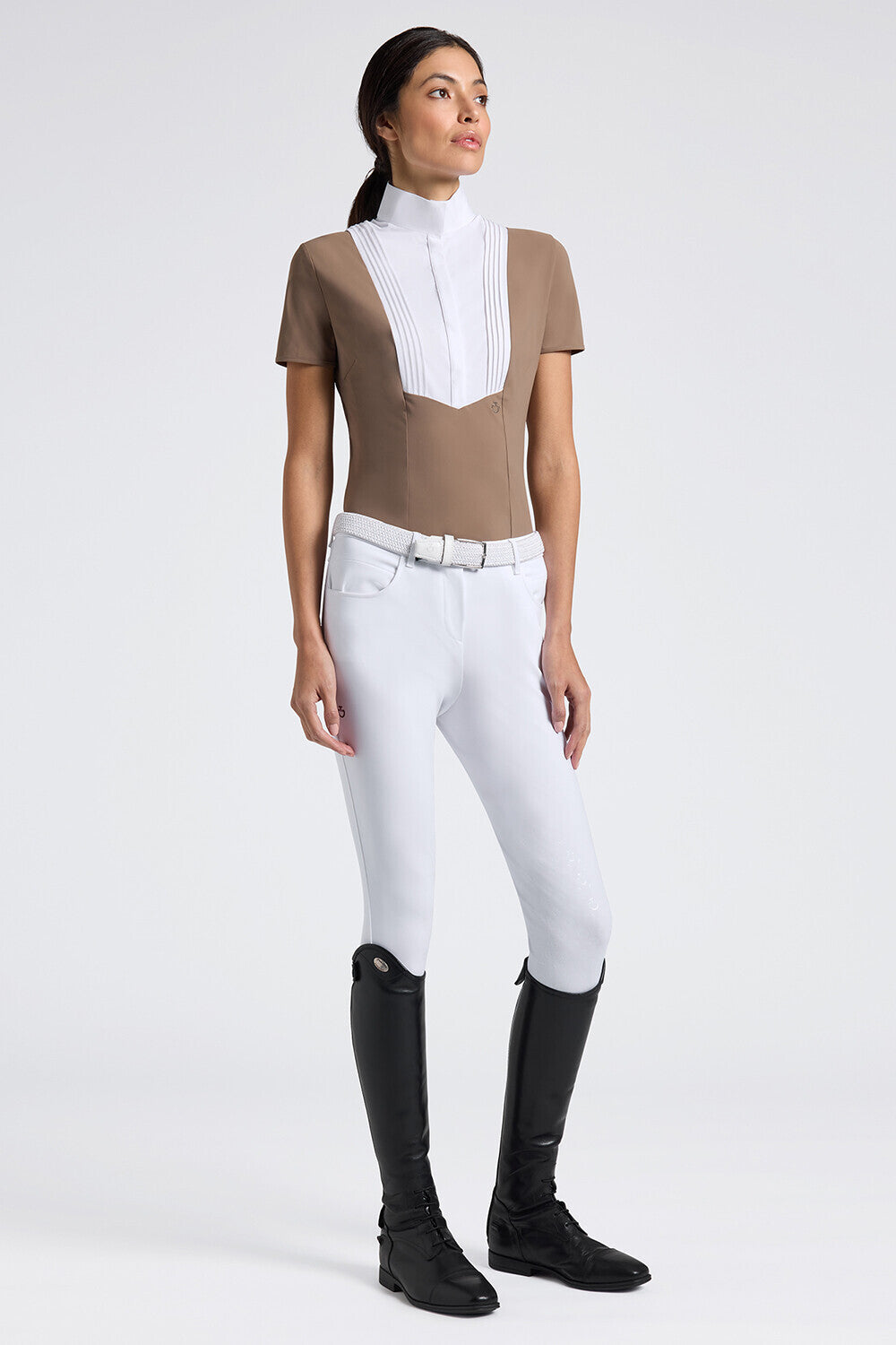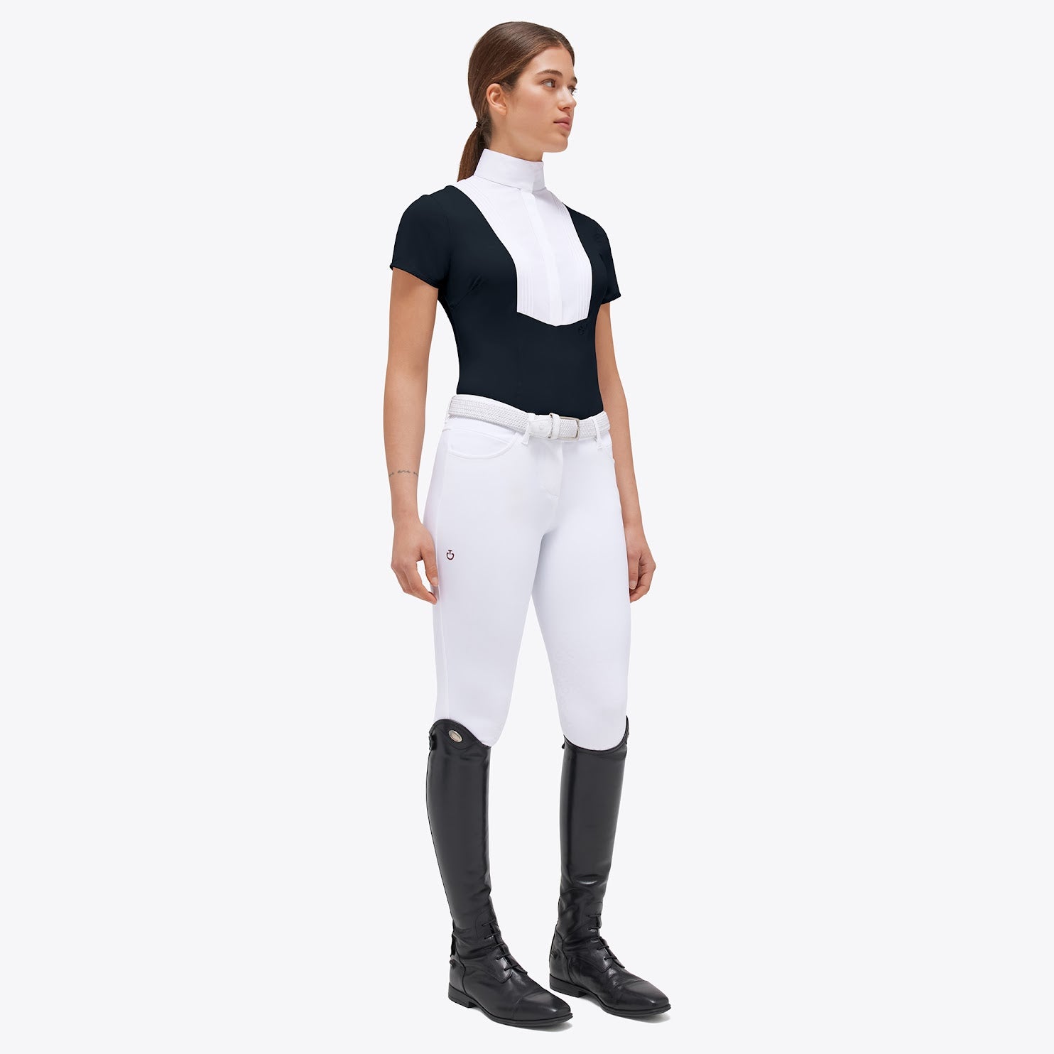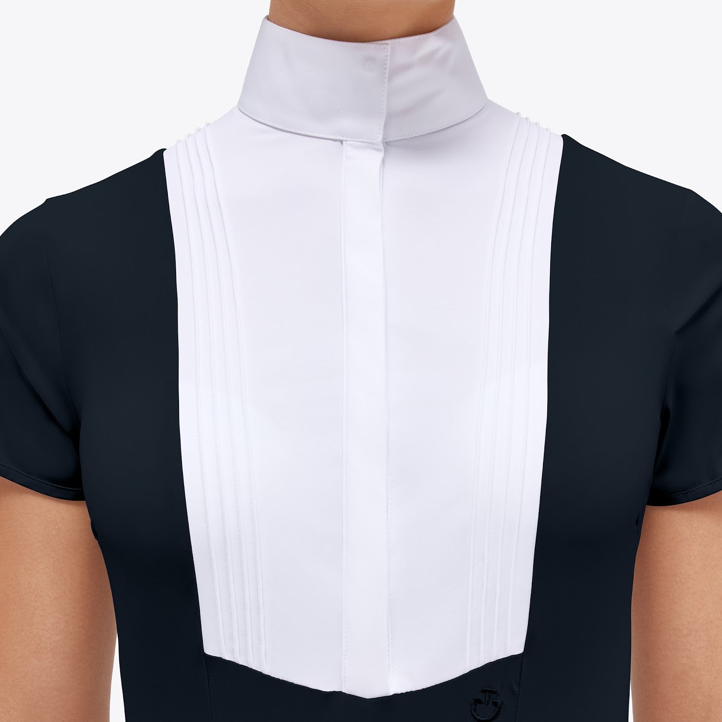 The women's short-sleeved Hunter shirt features a poplin high collar and a front bib with pleated details and hidden buttons. This competition shirt is made from highly breathable 4-way stretch technical jersey that perfectly fits to the body, following your movements. It features a very small tone on tone logo on the front.