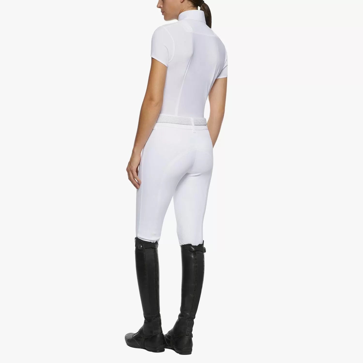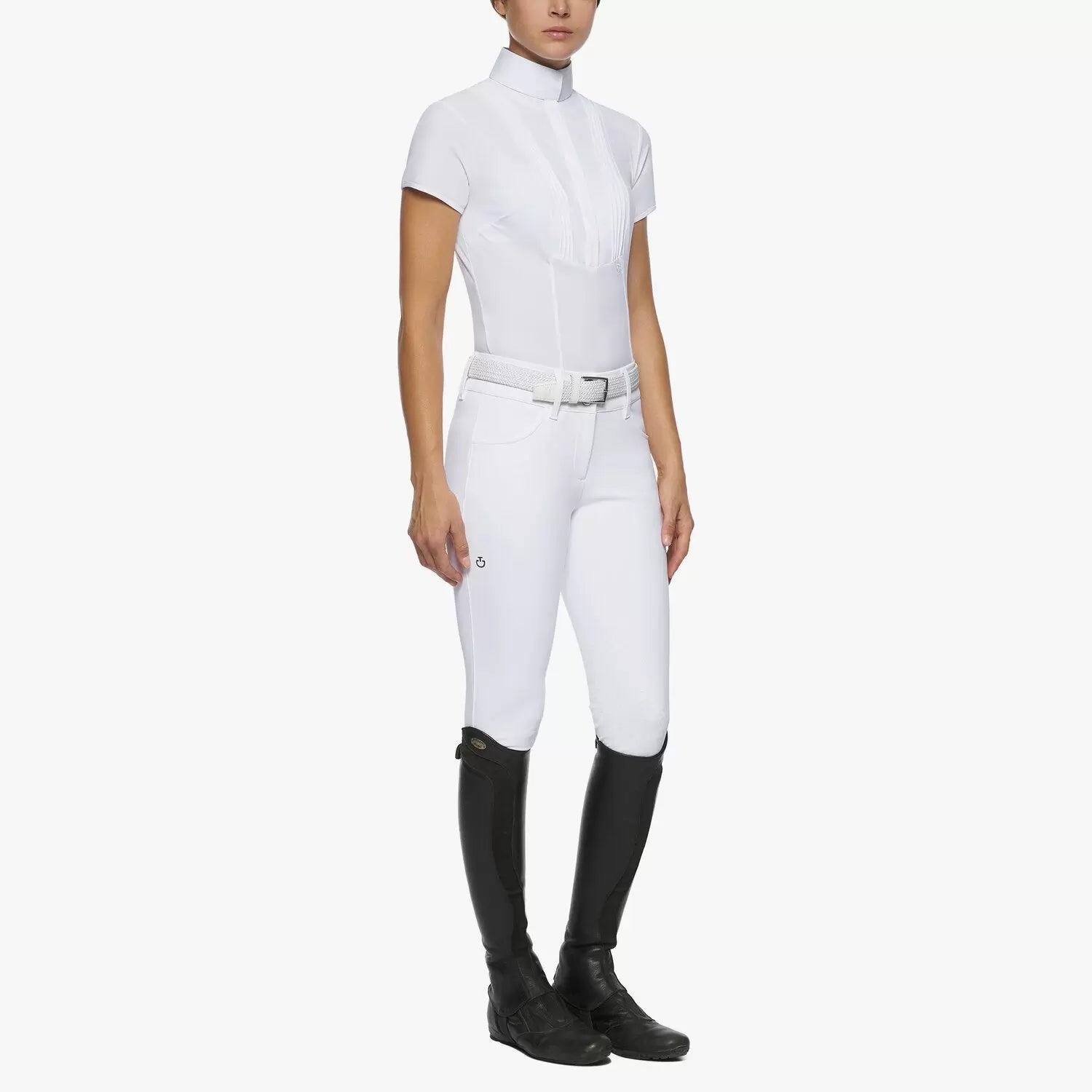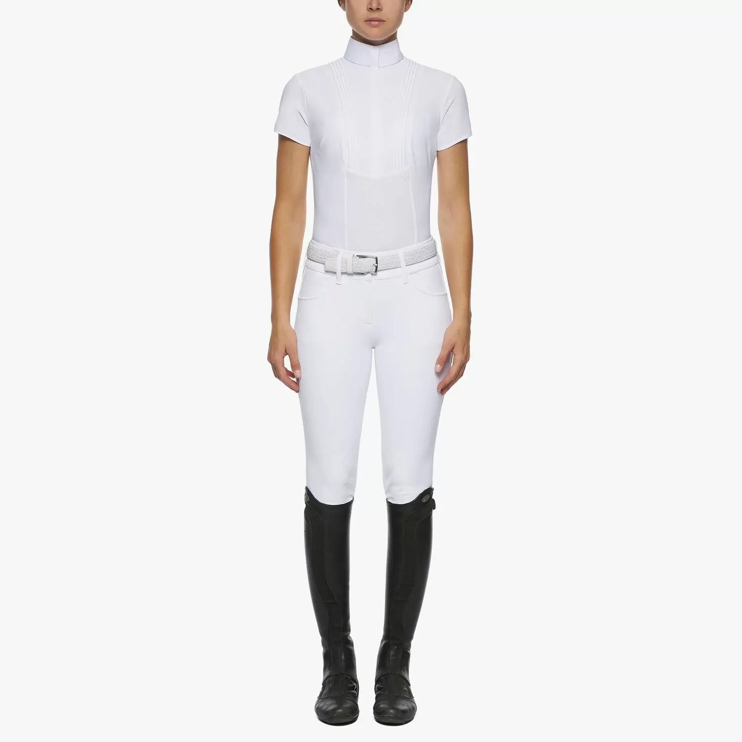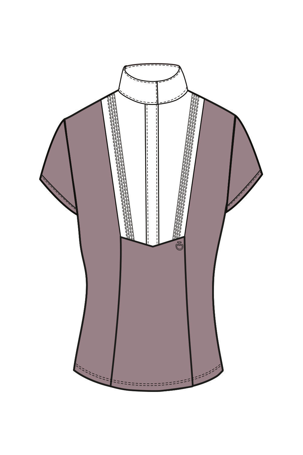The women's short-sleeved Hunter shirt features a poplin high collar and a front bib with pleated details and hidden buttons. This competition shirt is made from highly breathable 4-way stretch technical jersey that perfectly fits to the body, following your movements. It features a very small tone on tone logo on the front.