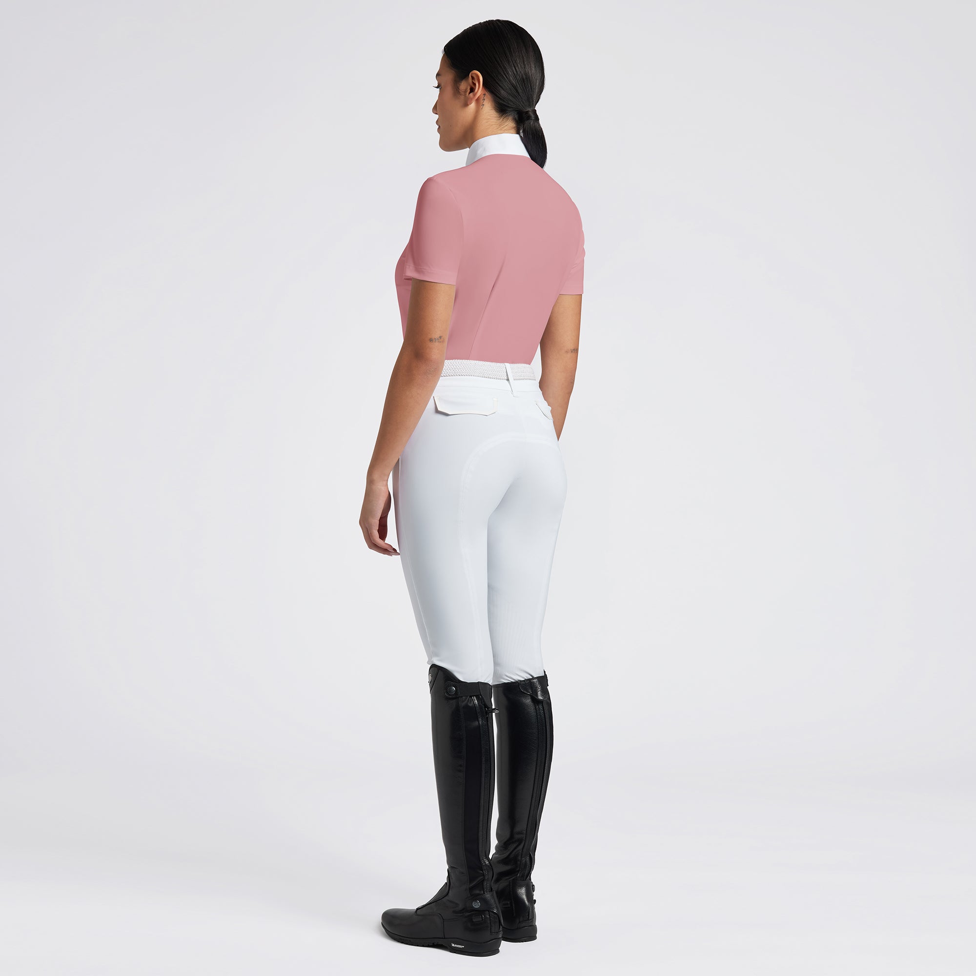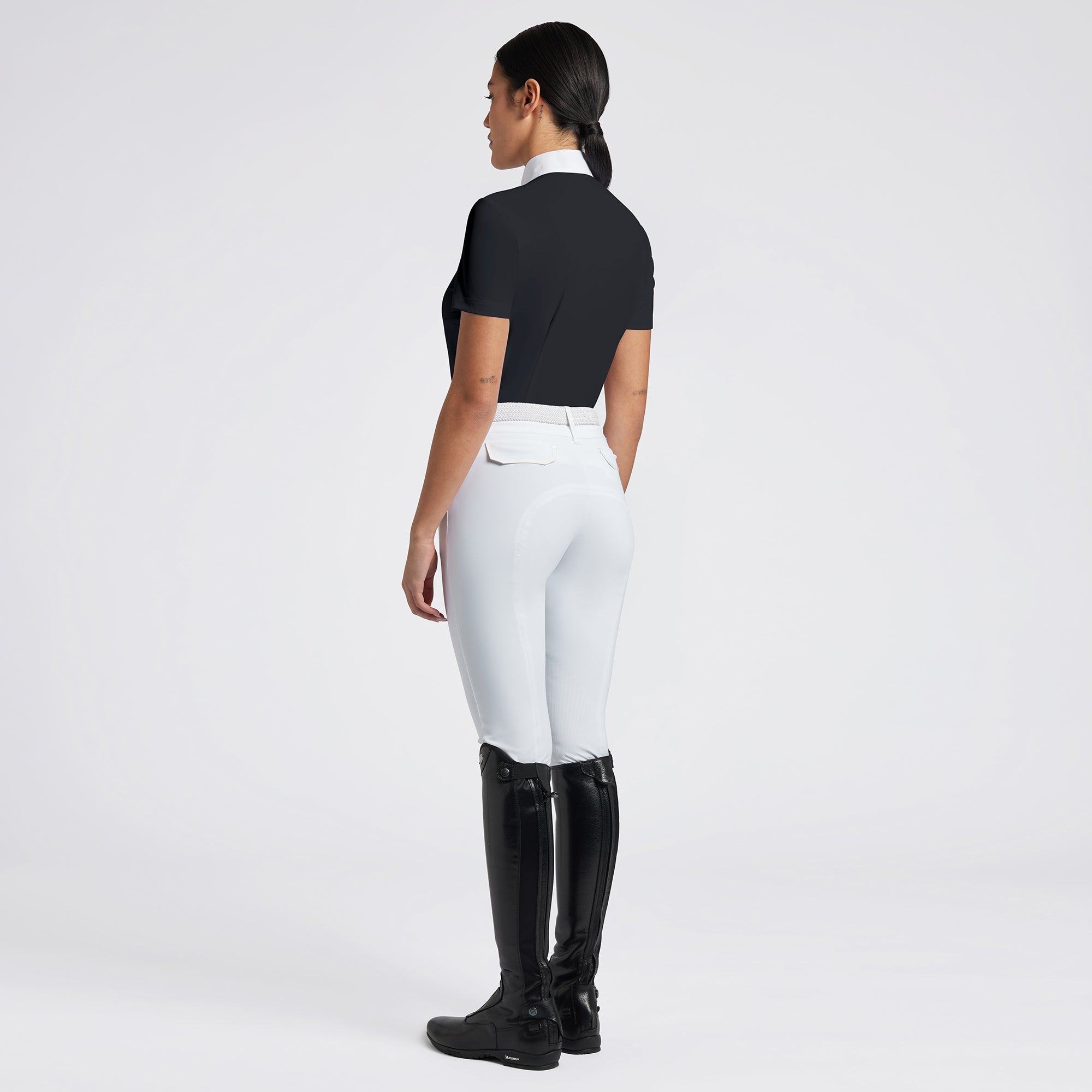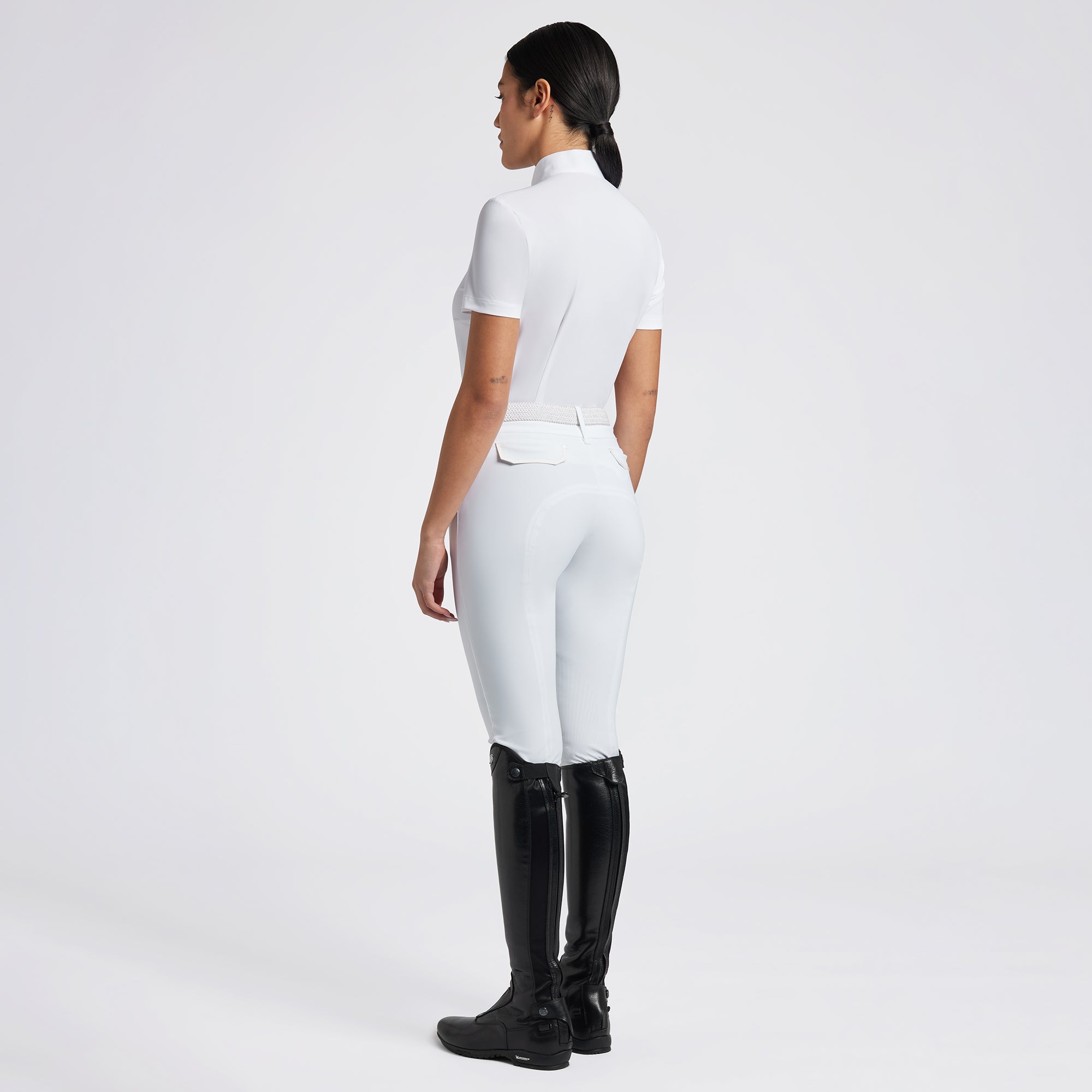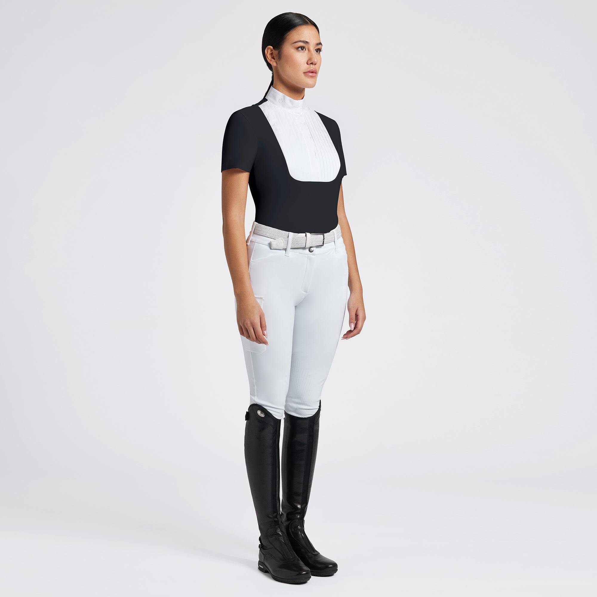 Cavalleria Toscana Pleated Bib Competition Shirt is made with lightweight technical stretch jersey that has a luxurious feel. The fabric is moisture wicking, quick drying, and odor controlling. Cavalleria Toscana equestrian show shirt has a classic white collar with white CT embroidery to complete the all-white look. Cavalleria Toscana Pleated Bib Competition Shirt has a refined, professional look that's perfect for riders who appreciate riding comfort.