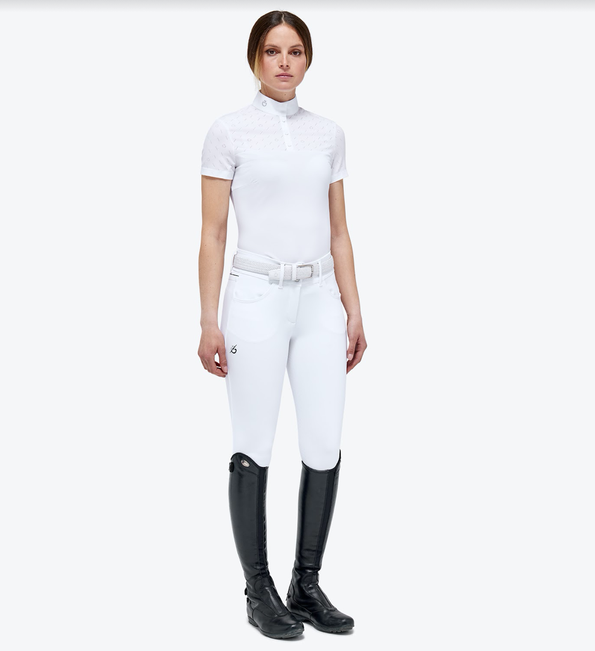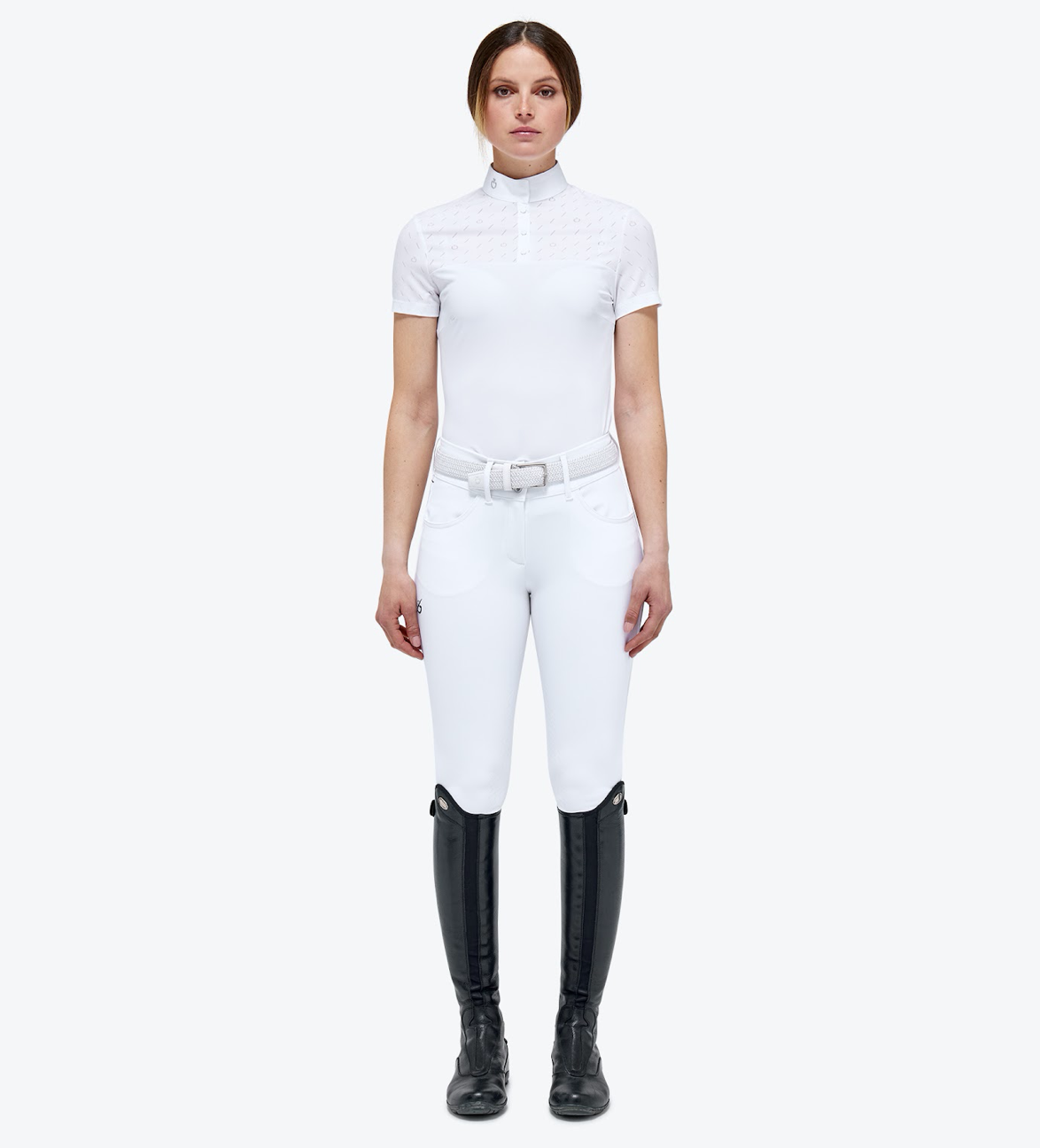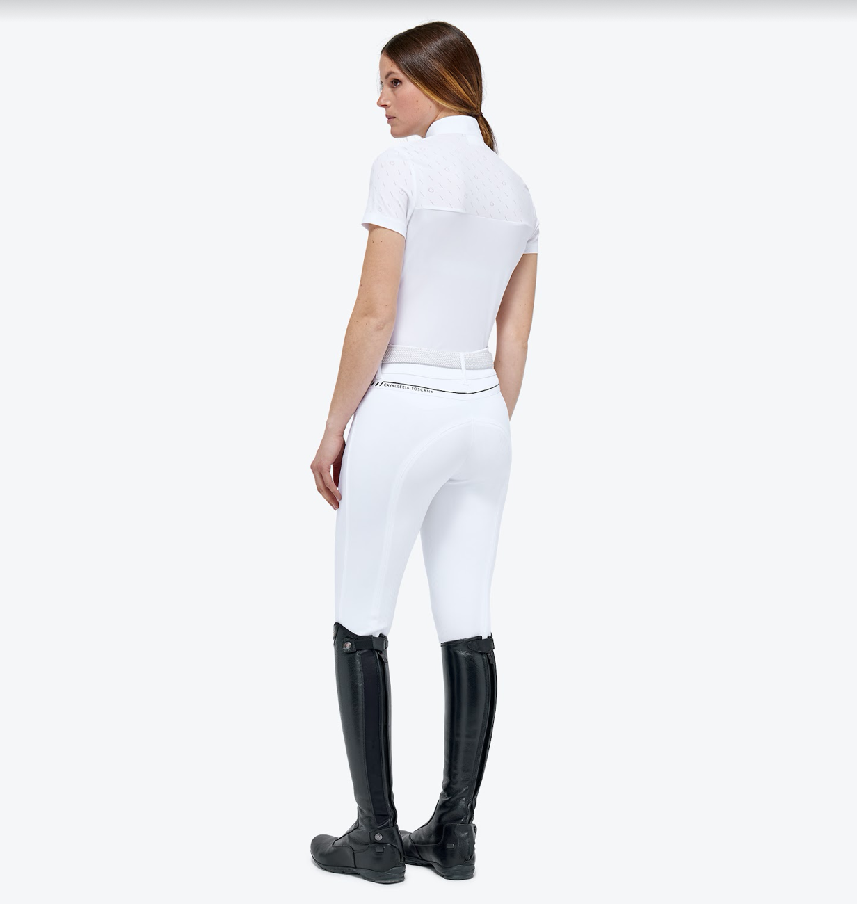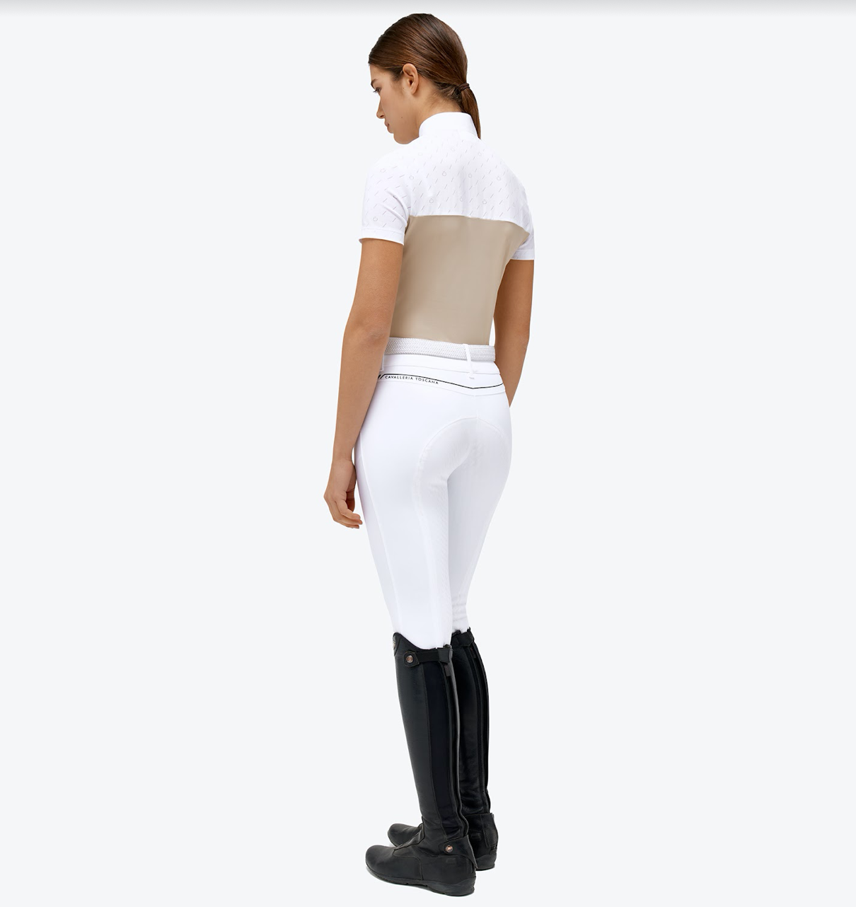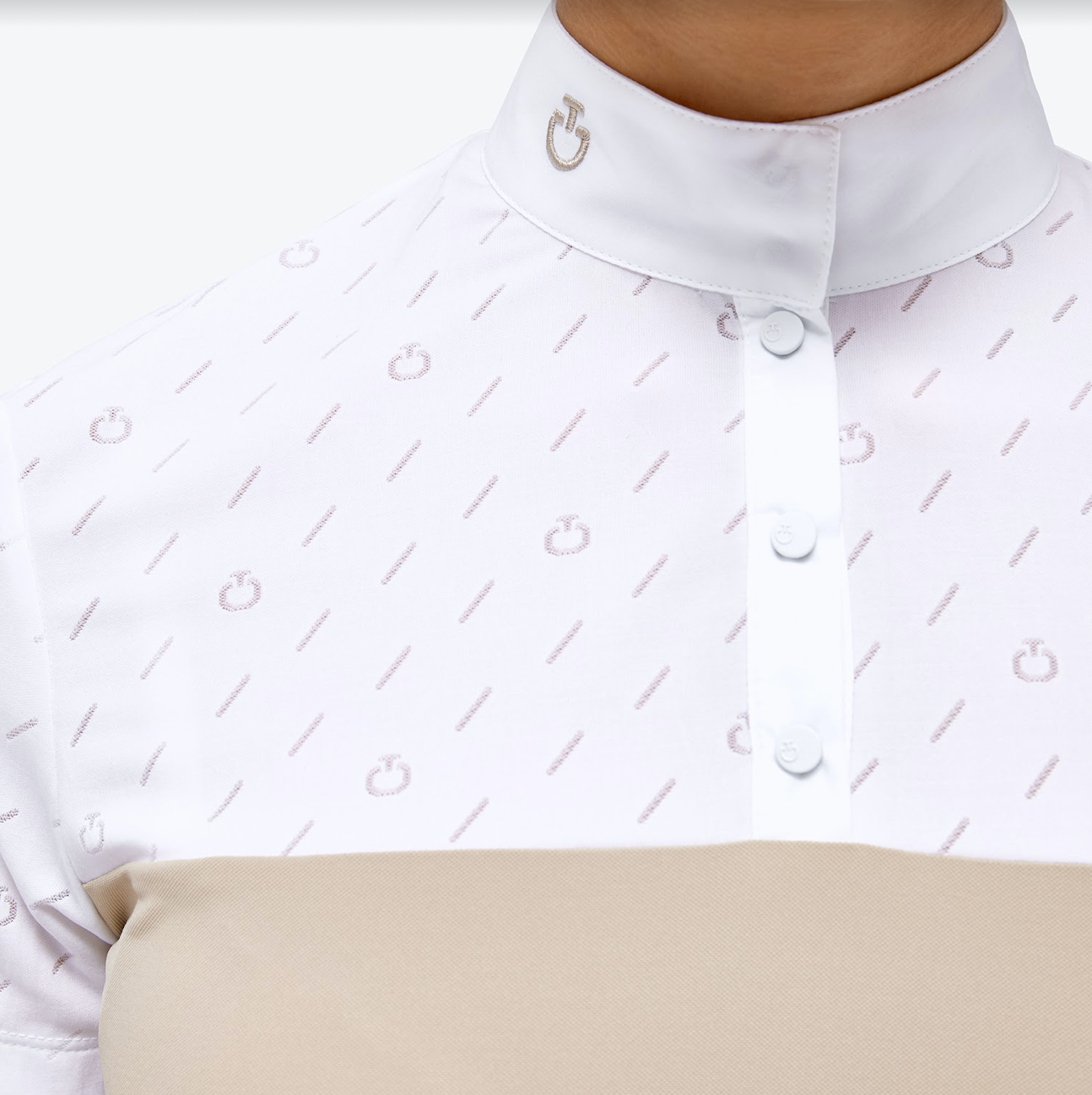 Women's CT Short Sleeve Competition Polo - Designed for riding shows, this polo shirt represents Cavalleria Toscana’s heritage combined with functional, modern design. The model boasts a slim, feminine style that enhances the waist and is made of sumptuous cotton piqué that feels soft against the skin. The yoke and short sleeves are finished with tone-on-tone technical jersey and an all-over jacquard CT monogram. The button fastening and high collar with our iconic embroidery on the side complete the look.