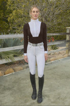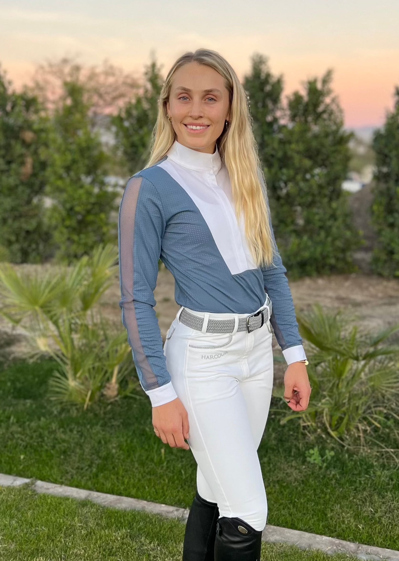 This women's long sleeve competition shirt with perforated material is designed for athletes competing in very hot weather. Designed by USA professionals for all 3 competition rings, Hunter, Equitation and Jumpers. Ultra-Light, perforated, stretchy fabric provides style and comfort for the athlete.