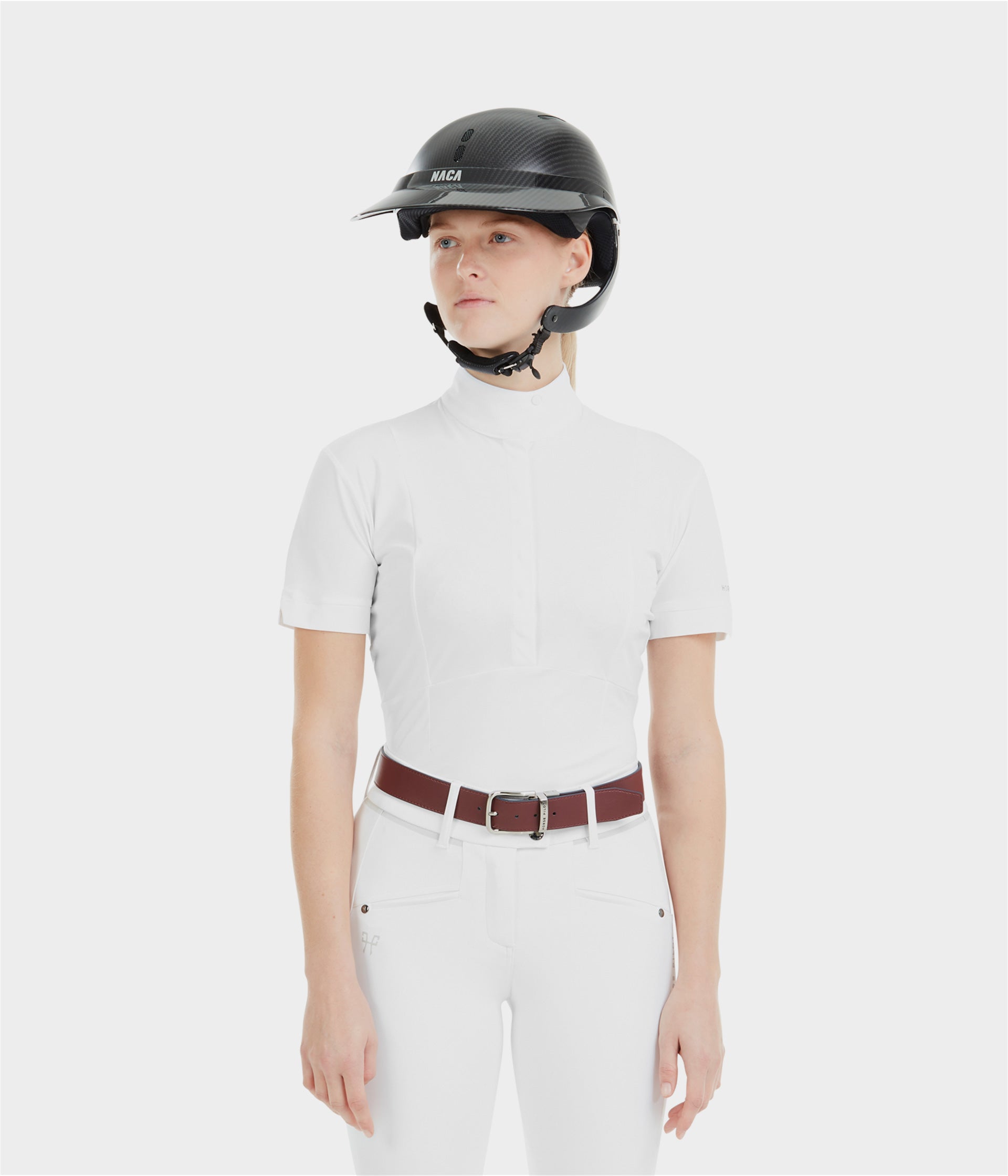 Gorgeous short sleeve show shirt from Horse Pilot! The Monica show shirt is made from a technical, very comfortable fabric that wicks moisture to keep you cool and dry, and with added ventilation on the back of the shirt, it is perfect for a day of competition. Articulated seams create a very flattering cut, all while maintaining range of motion when in the saddle.