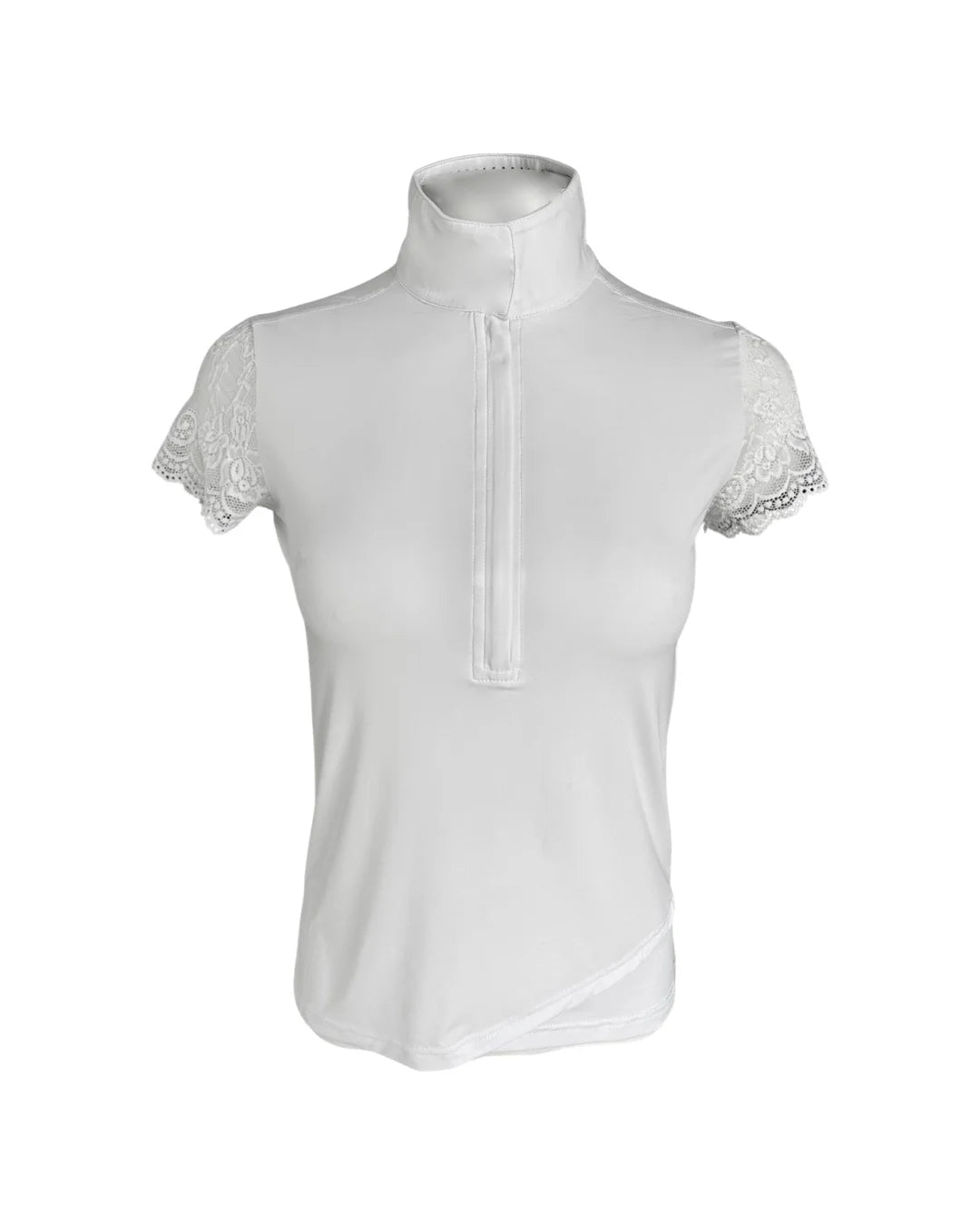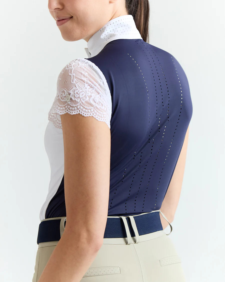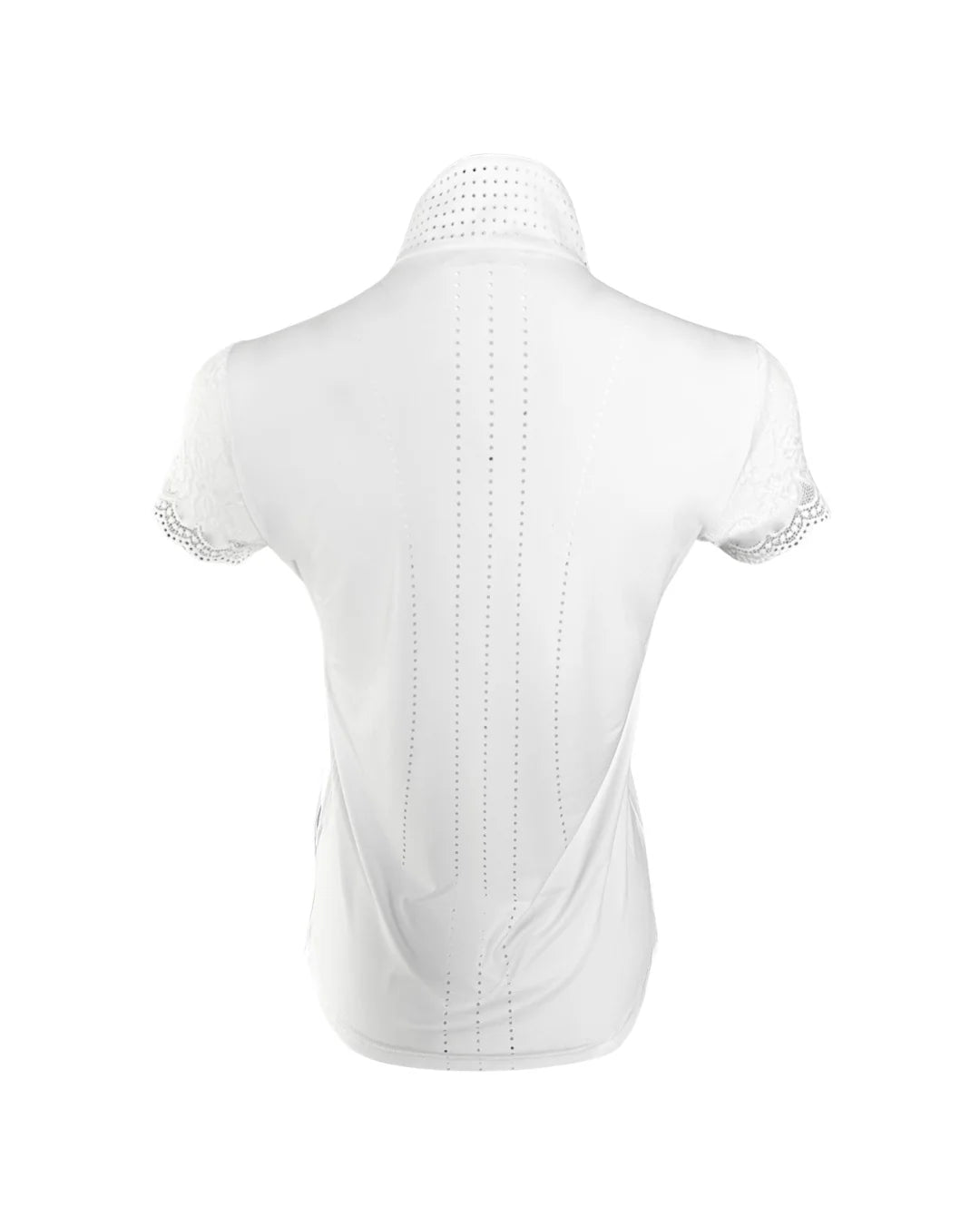 Our Lace Sleeve Show Shirt is the height of sophisticated style. Classic look with touch of soft + pretty stretch lace sleeves, with perforated ventilation on the back for breathability.