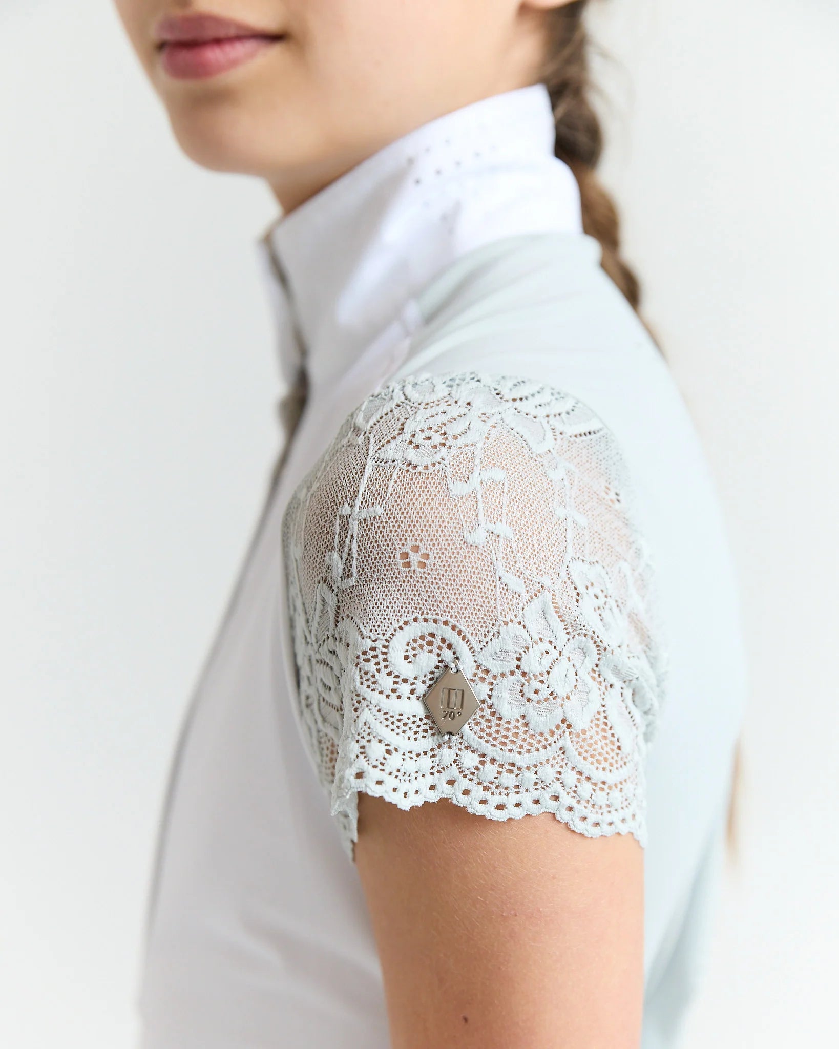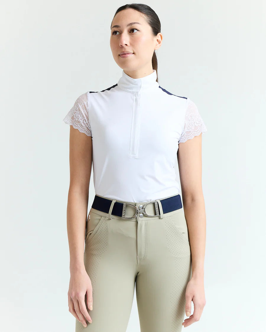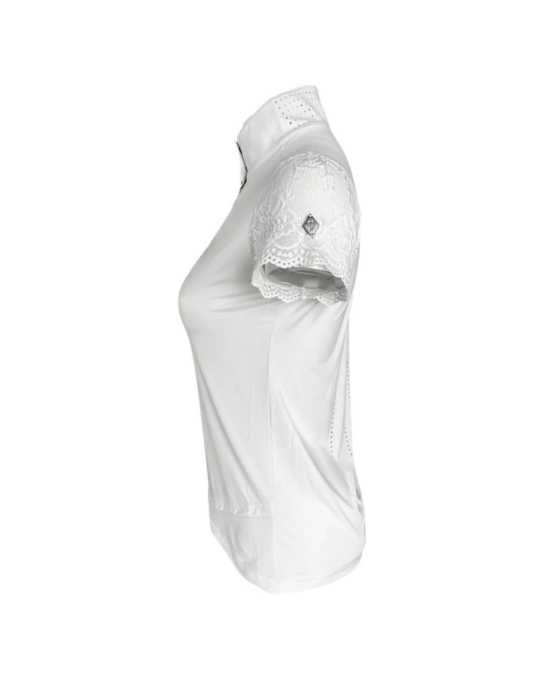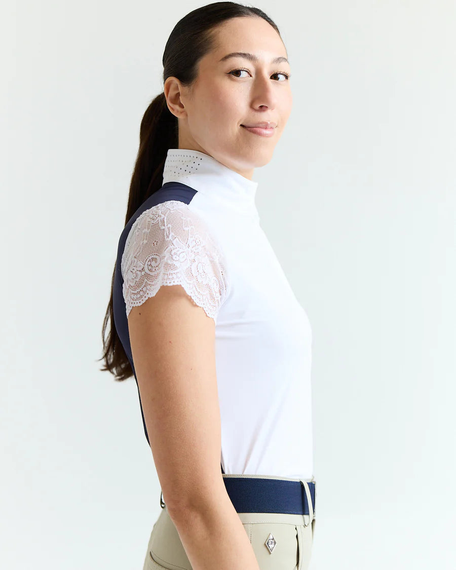 Our Lace Sleeve Show Shirt is the height of sophisticated style. Classic look with touch of soft + pretty stretch lace sleeves, with perforated ventilation on the back for breathability.