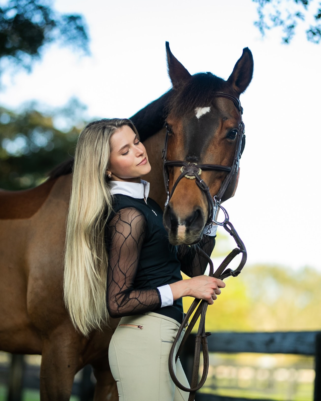 The Ophelia Shirt is both delicate and technical. The arms are covered in lace and provides a featherweight feeling. Traditional white collar and cuffs make this shirt appropriate for all show rings. The front zip closure is easy and the tapered fit looks form flattering. Available in Pink Flora, White, Forest, Jet Black, Espresso, and Midnight Blue. The Ophelia Shirt is made from 73% Polyester, 27% Spandex.