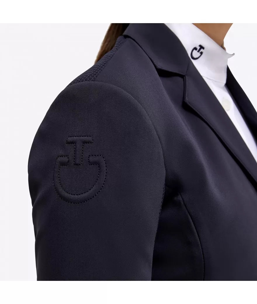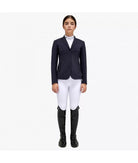 To face the first competitions on horseback with the winning style of Cavalleria Toscana. This girl's jacket is made from a special bi-stretch technical jersey that offers a flawless fit, resists creasing and comfortably follows movement. The model has a classic tailored-inspired cut with a pleated motif on the front and back that emphasizes the waistline. It is characterized by the lapel collar, the closure with personalized buttons and the pockets with heat-taped zip for a technical touch typical of the brand.